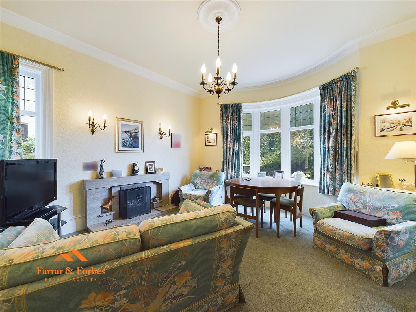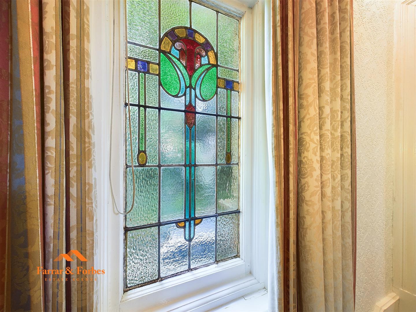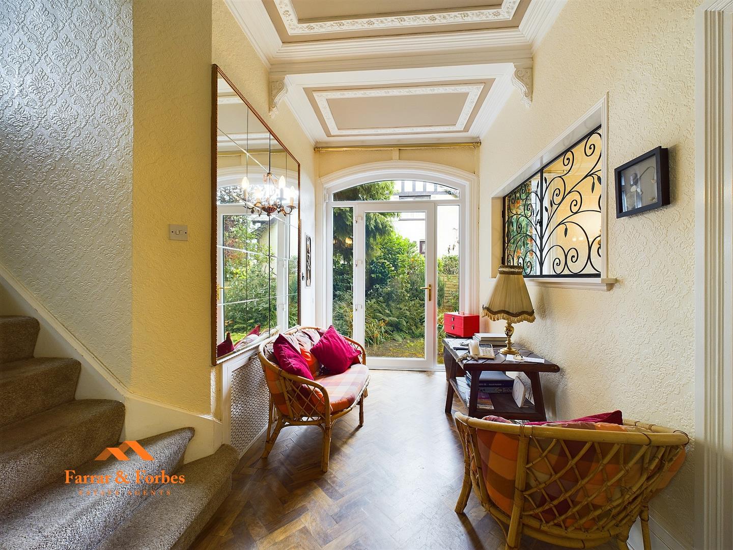 The entrance hall, accessible from the side of the property, features high ceilings and original decorative plasterwork, enhancing the period charm. The lounge, with its bay window overlooking the garden and another open fireplace.