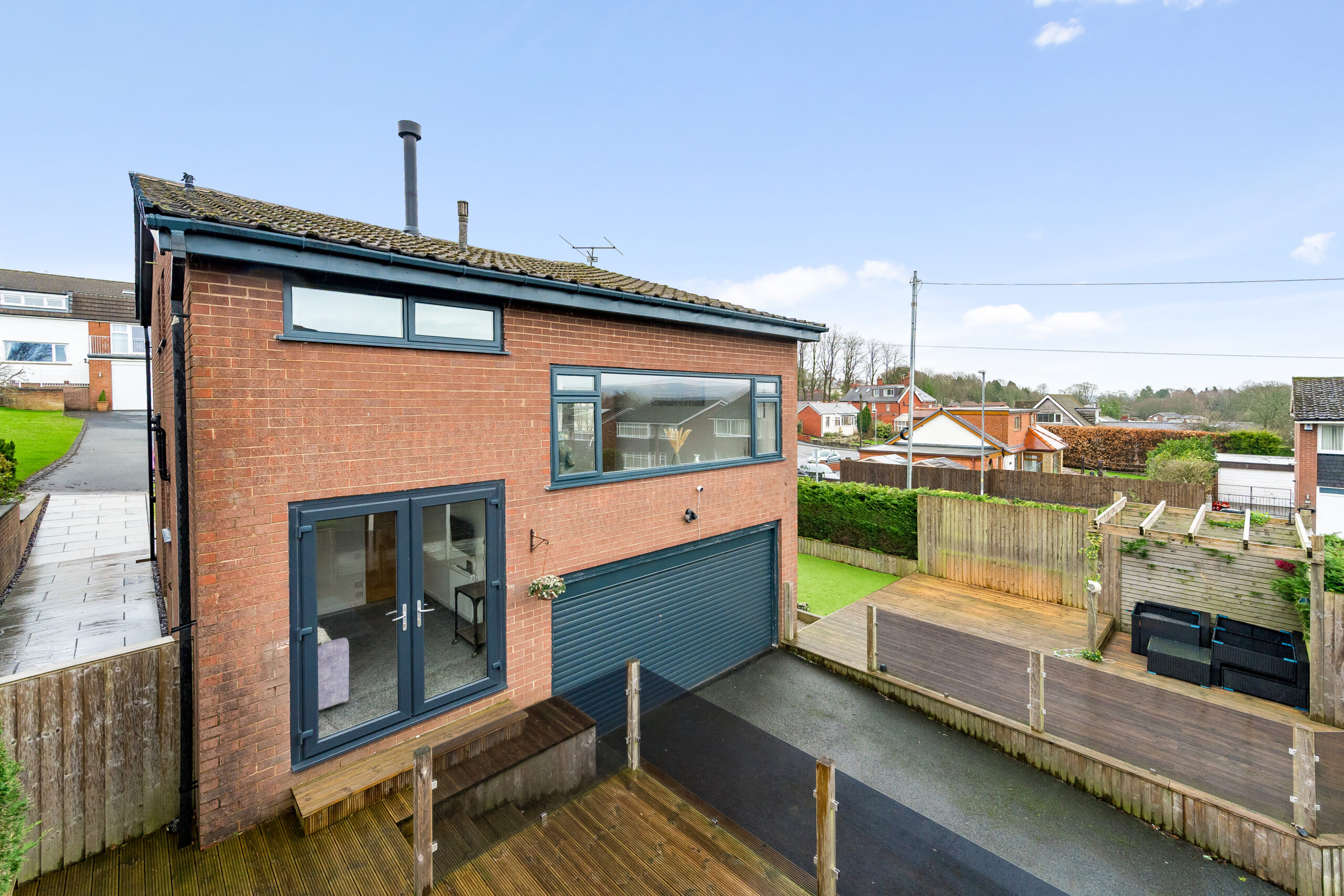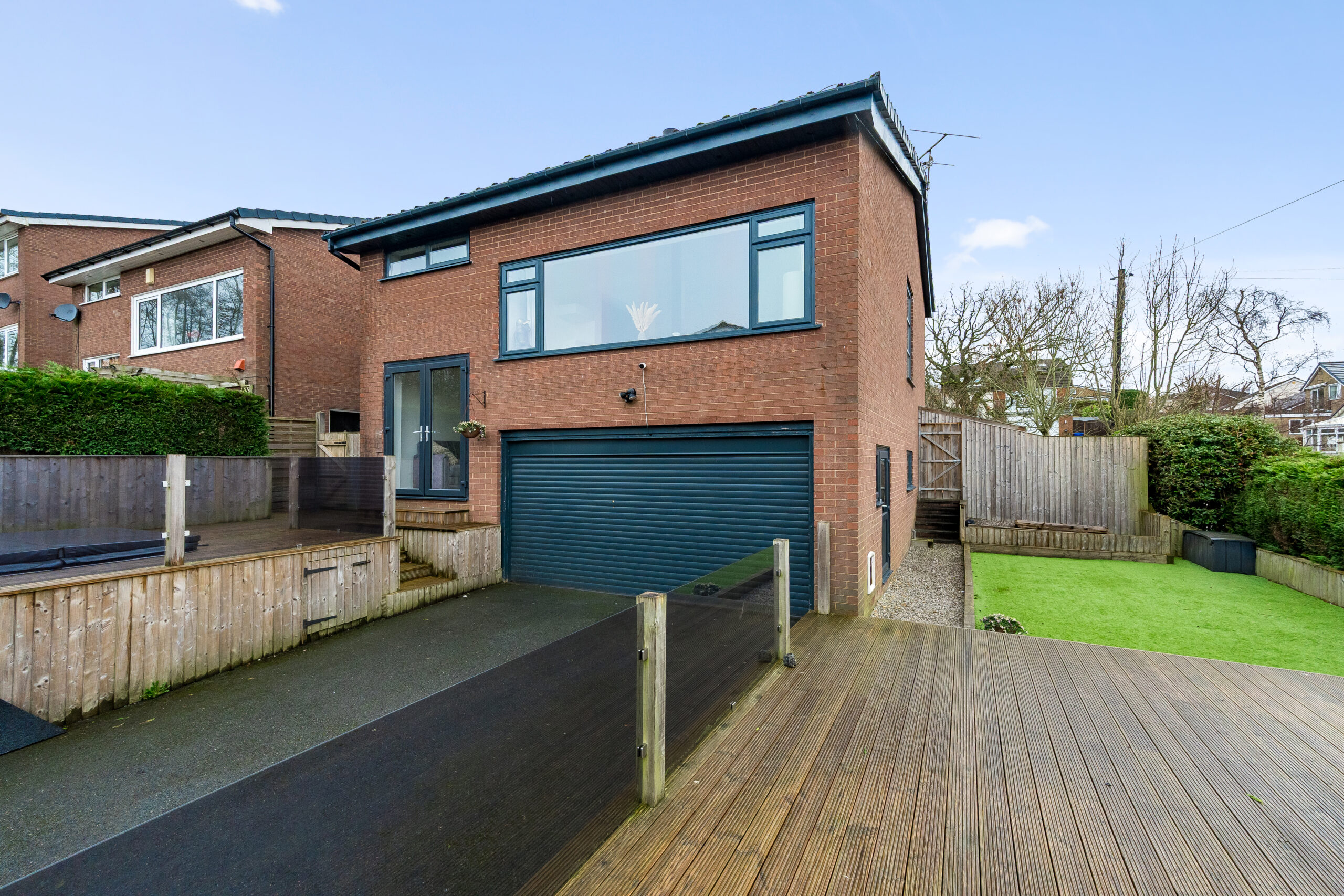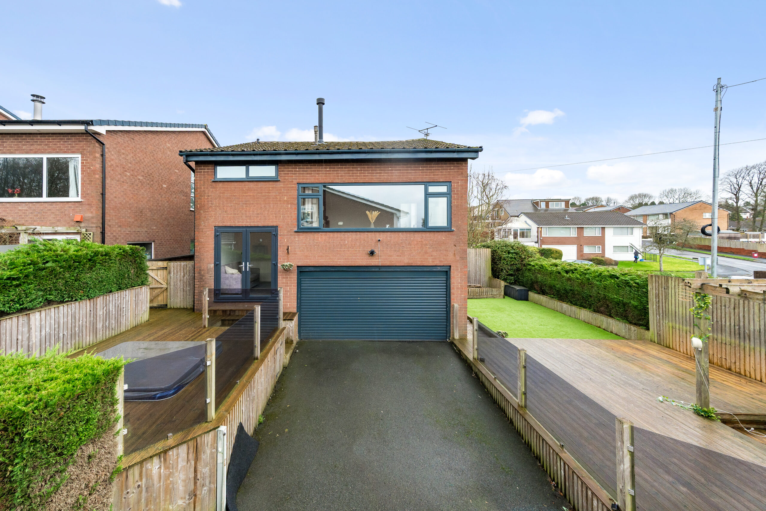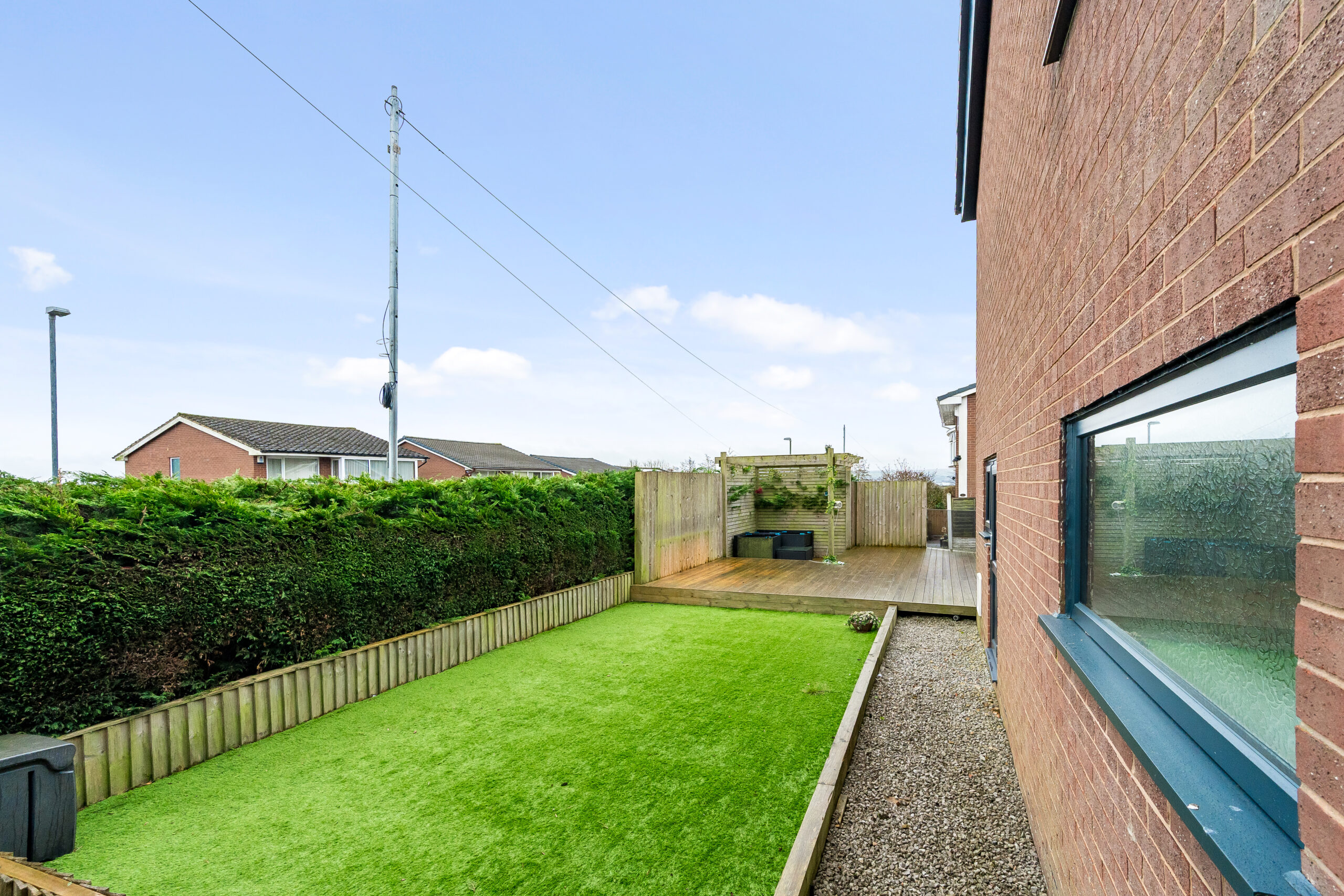 Externally, you can drive around to the rear where a private driveway provides parking and access to the garage via an electric up-and-over door. The landscaped garden has been thoughtfully designed for low maintenance, featuring decking, astro-turf, and a charming pergola-covered seating area — ideal for relaxing or entertaining. There is also a sunken hot tub for added luxury.
