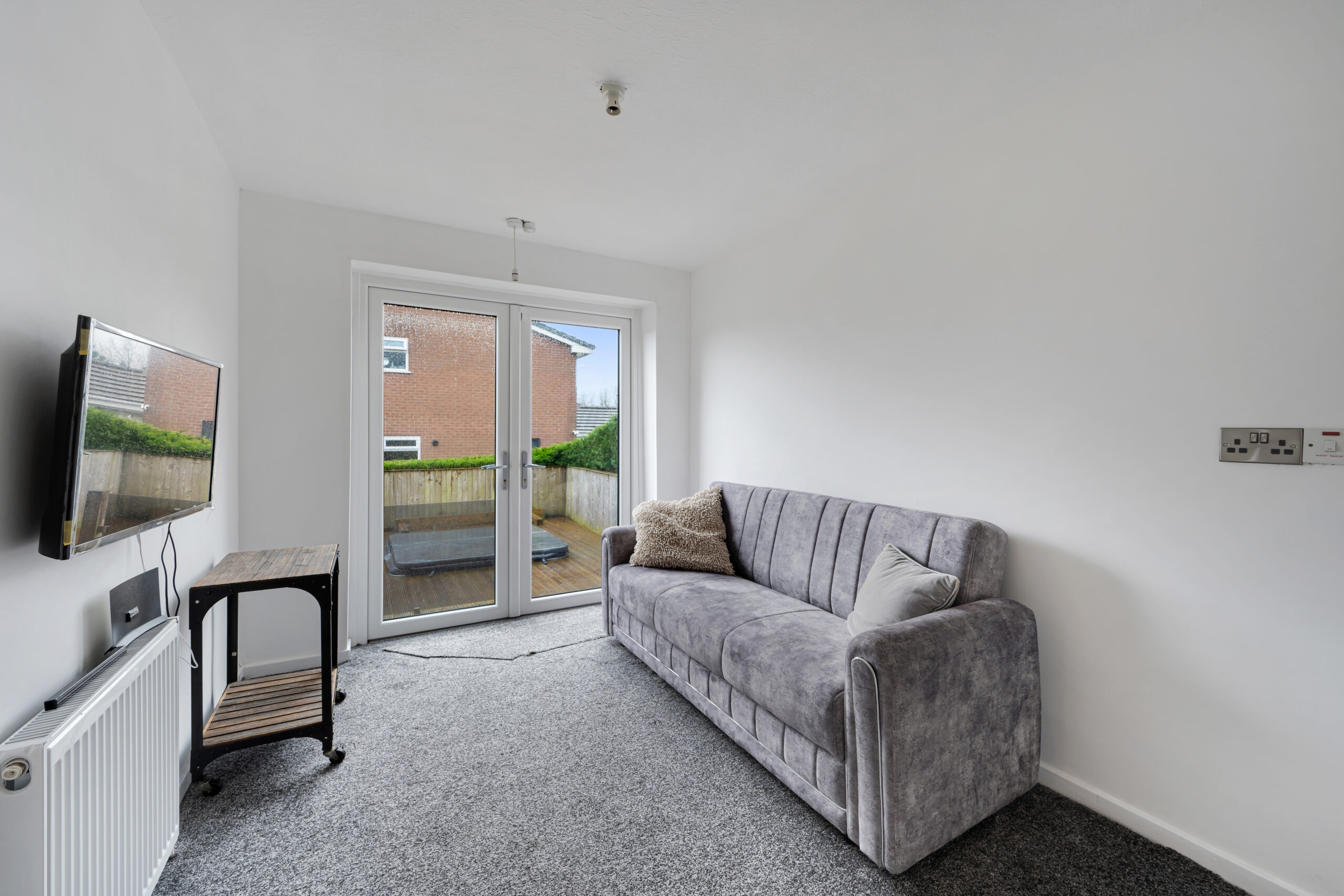 A versatile ground floor bedroom, which could equally serve as a home office or study, benefits from patio doors opening directly onto the decking and hot tub area.