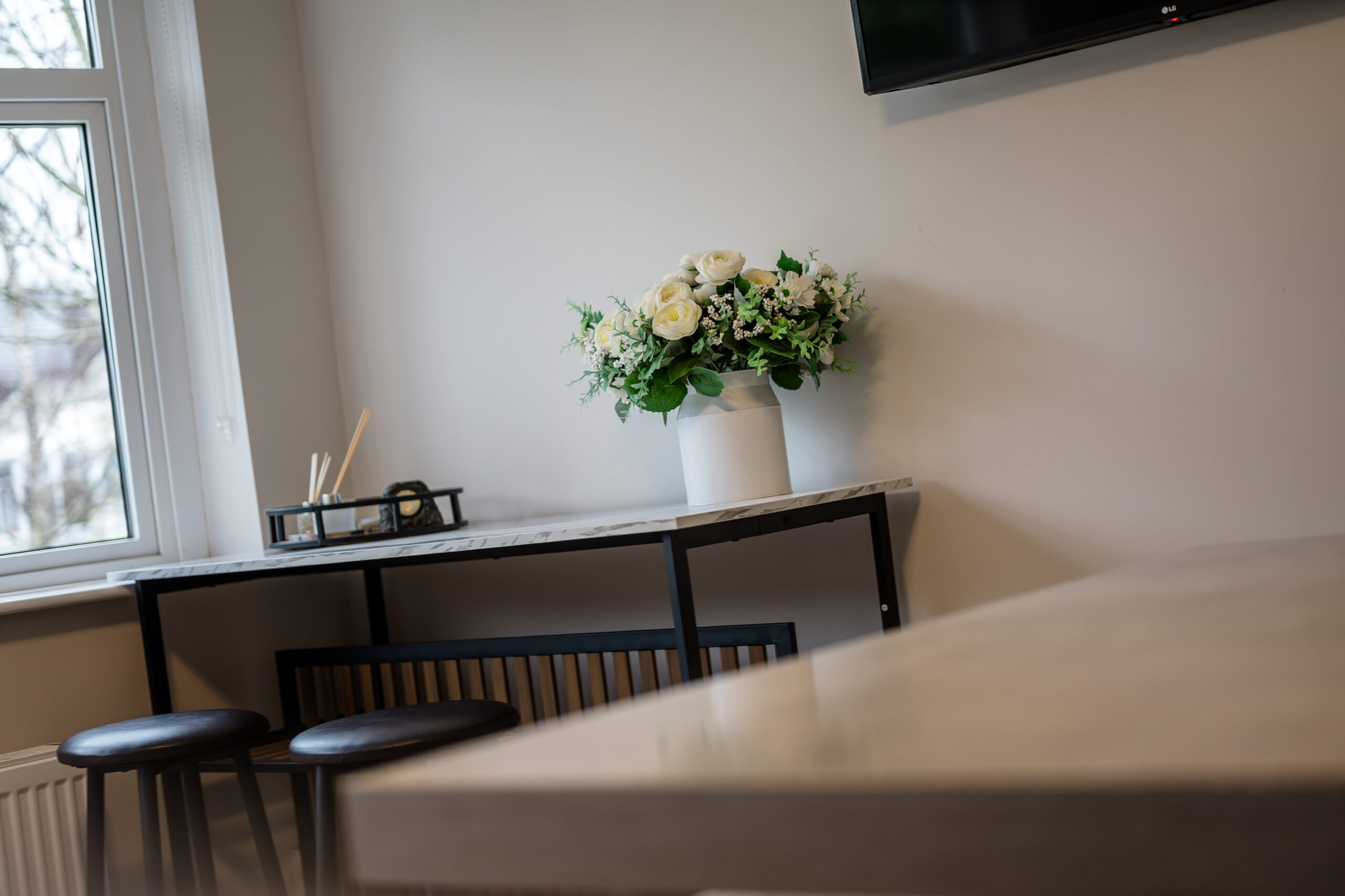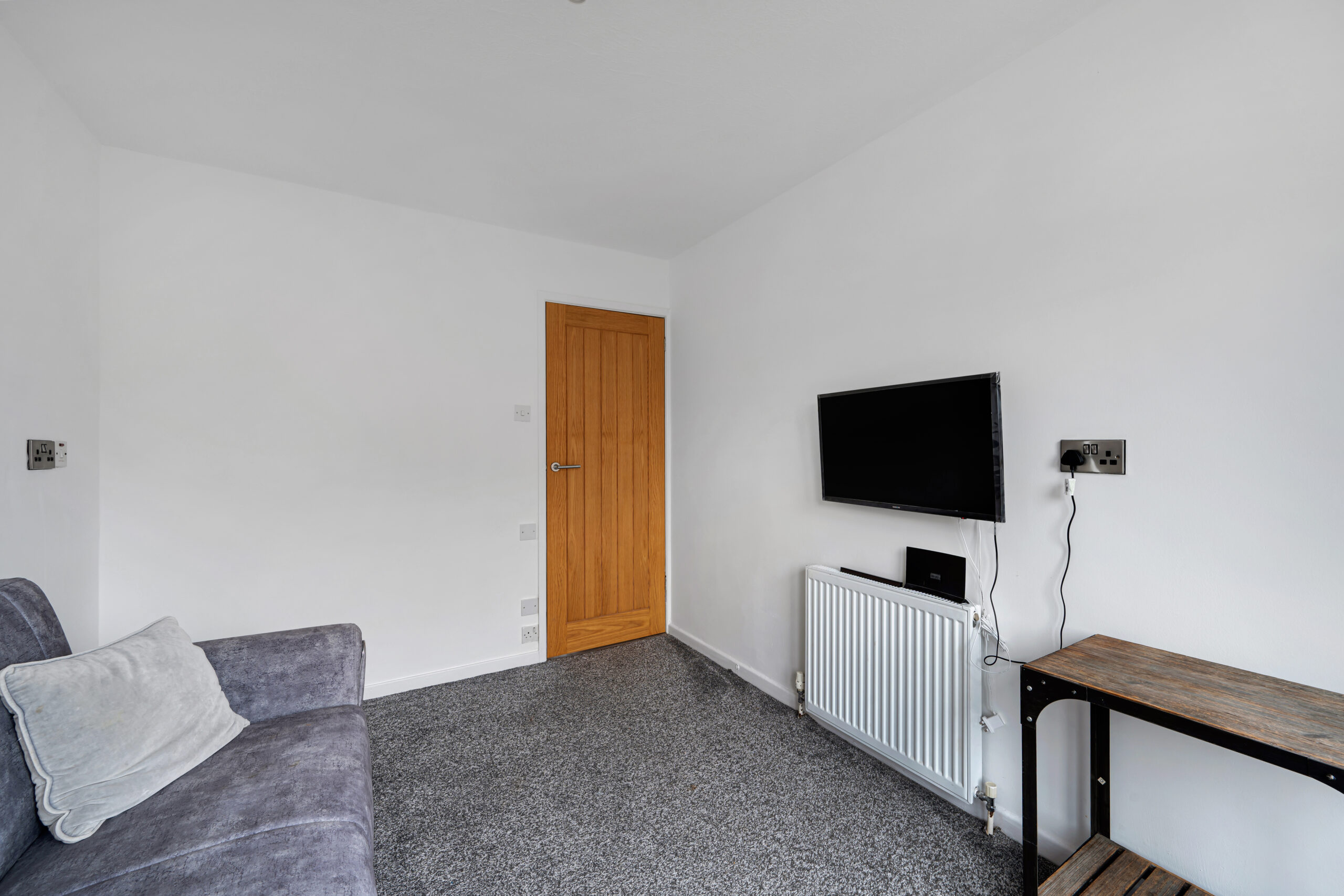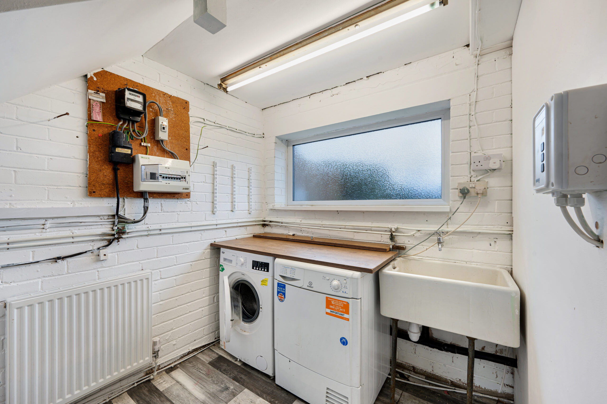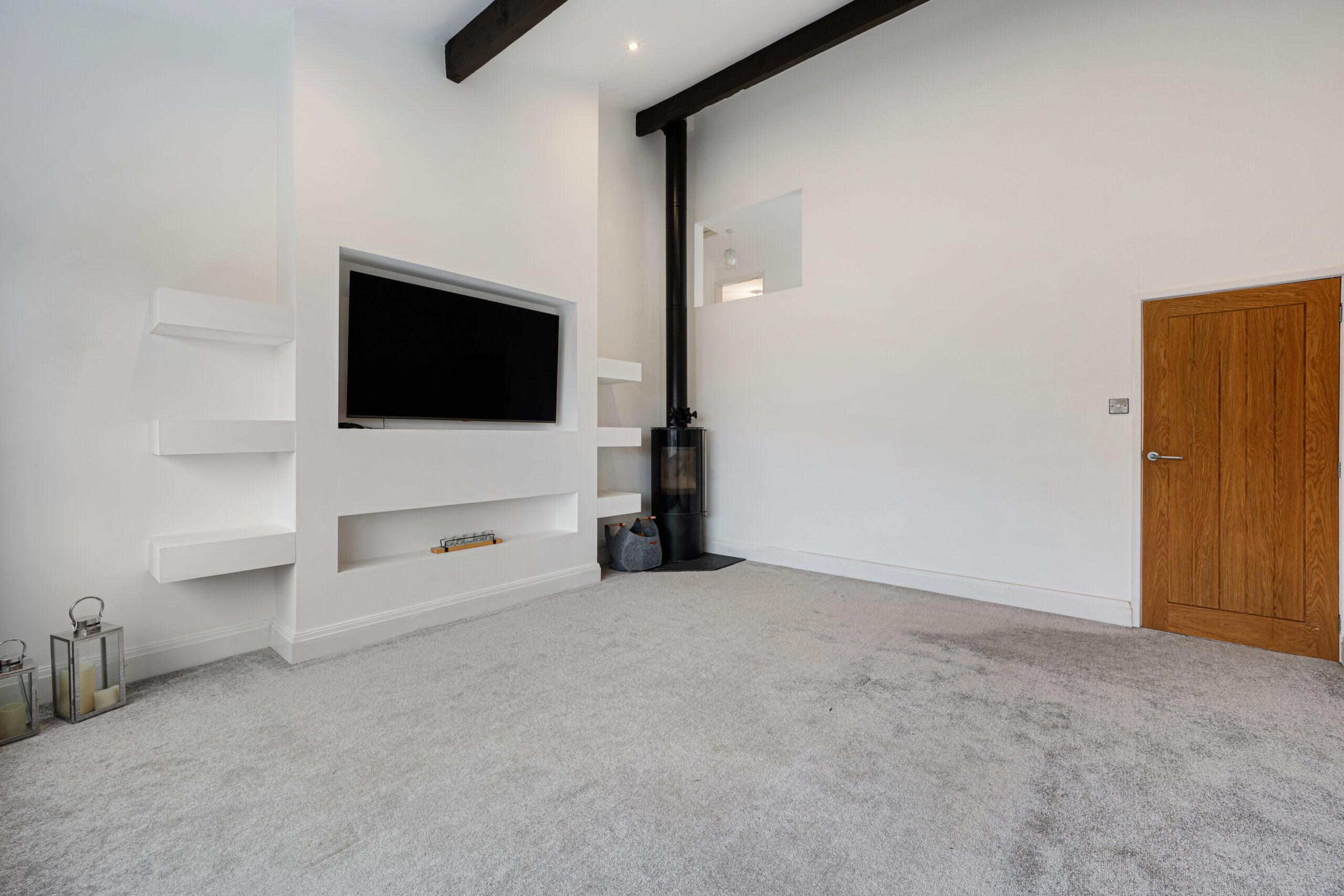 The split-level design adds character and practicality. On the lower ground floor, there is a utility room with plumbing for a washing machine and space for a dryer. The garage has been partially divided, with one section previously used as a dog grooming room and still fitted with a shower, perfect for cleaning pets after countryside walks. The remaining garage space is ideal for storage, with additional storage available beneath the property. A return staircase leads to the impressive living room, featuring vaulted ceilings, a cosy log burner set in the corner, and a stylish media wall