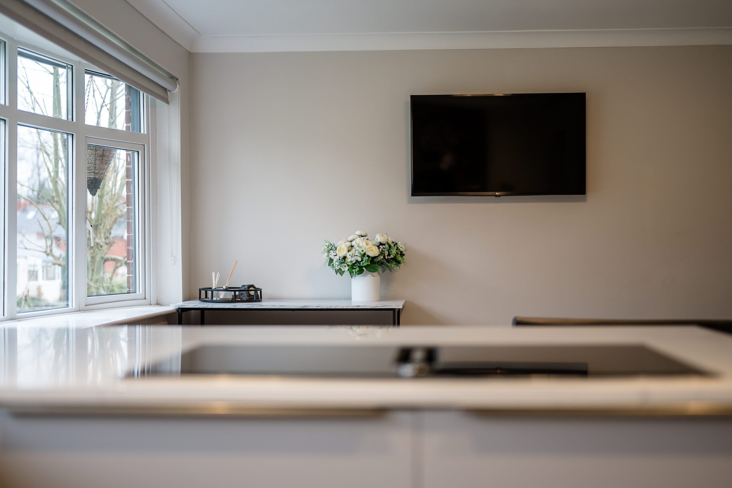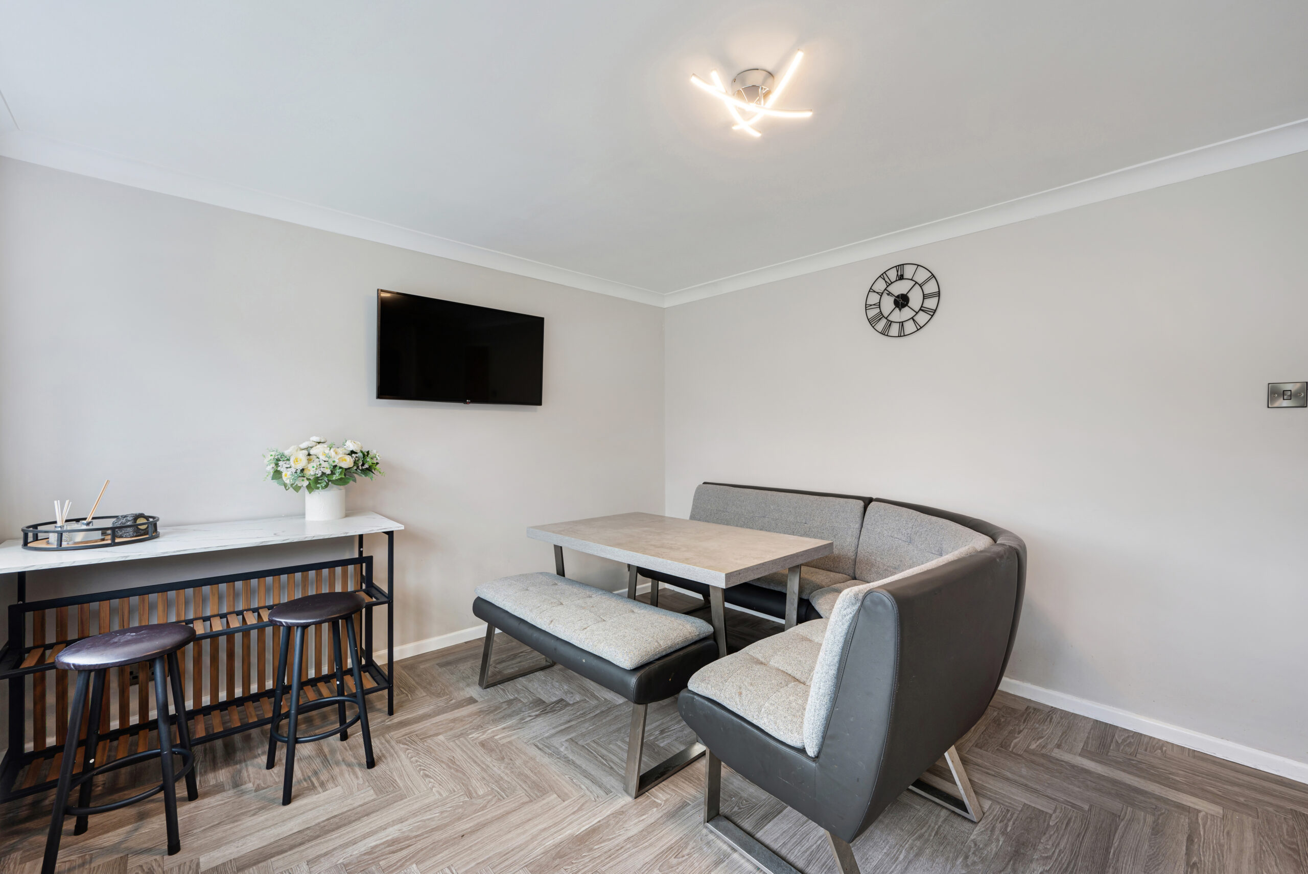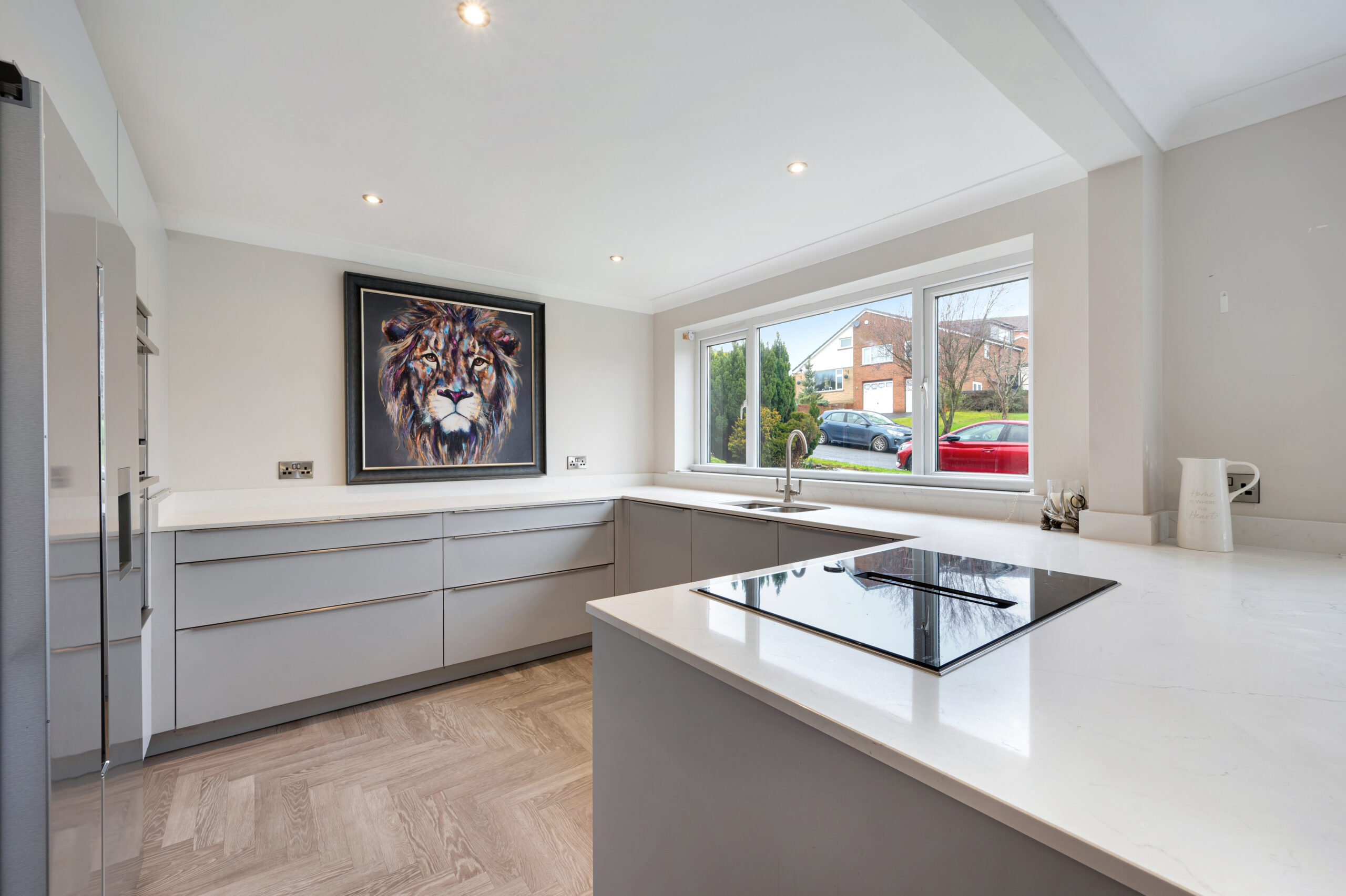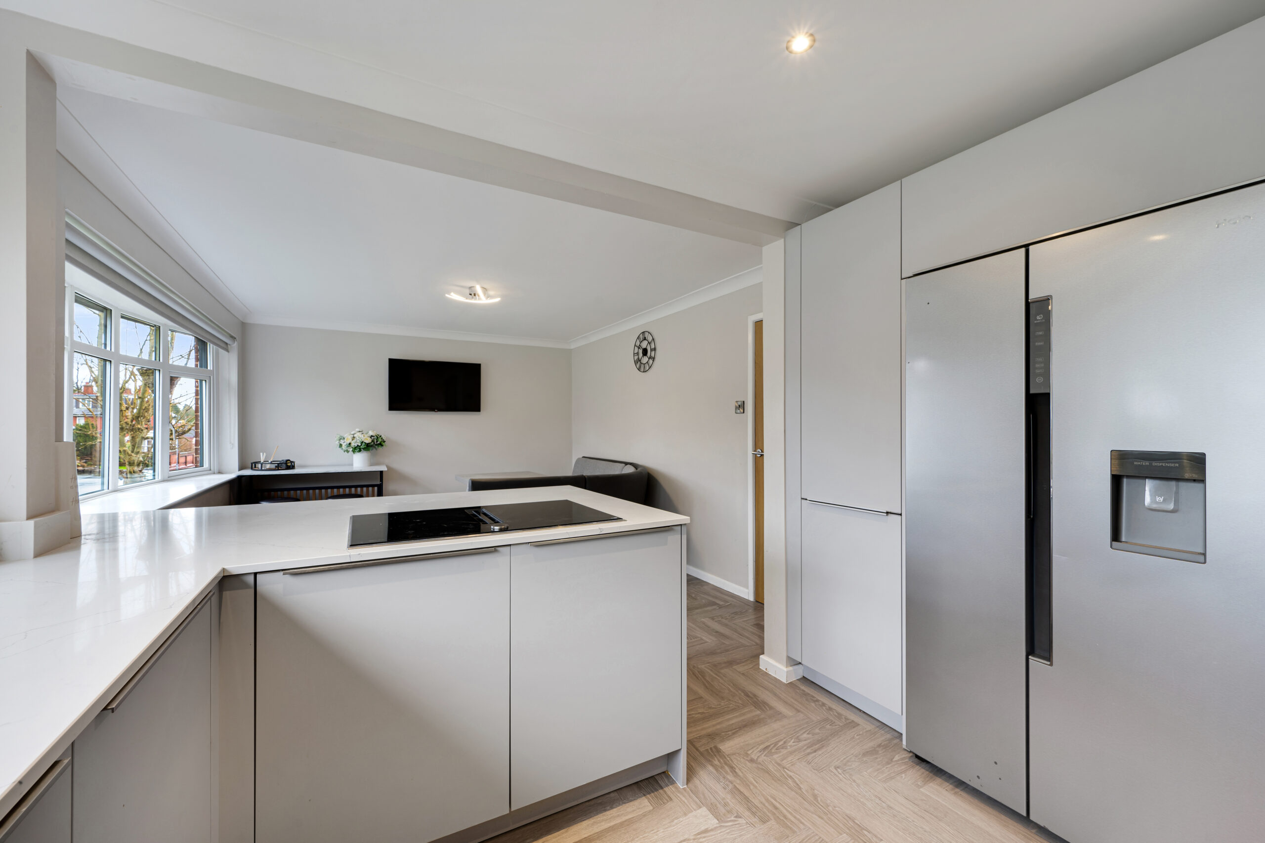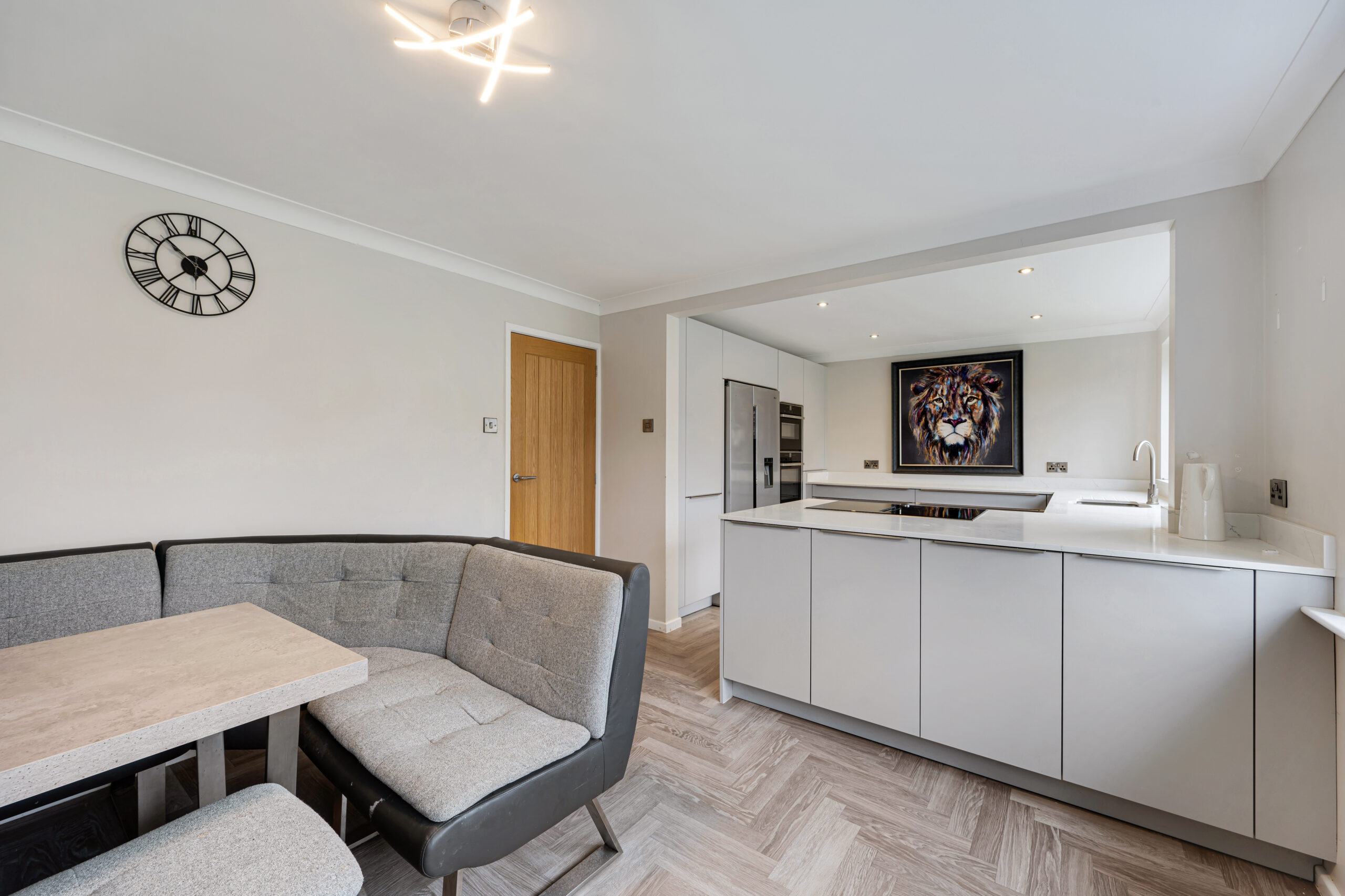 Entering from the side, a handy entrance vestibule offers the perfect space for coats and shoes. The stunning kitchen/diner is a true highlight of the home, finished in a contemporary grey matte design with quartz worktops and integrated appliances, including a dishwasher, double oven, electric hob, and built-in circulator. A convenient downstairs WC with hand wash basin also houses the combination boiler.