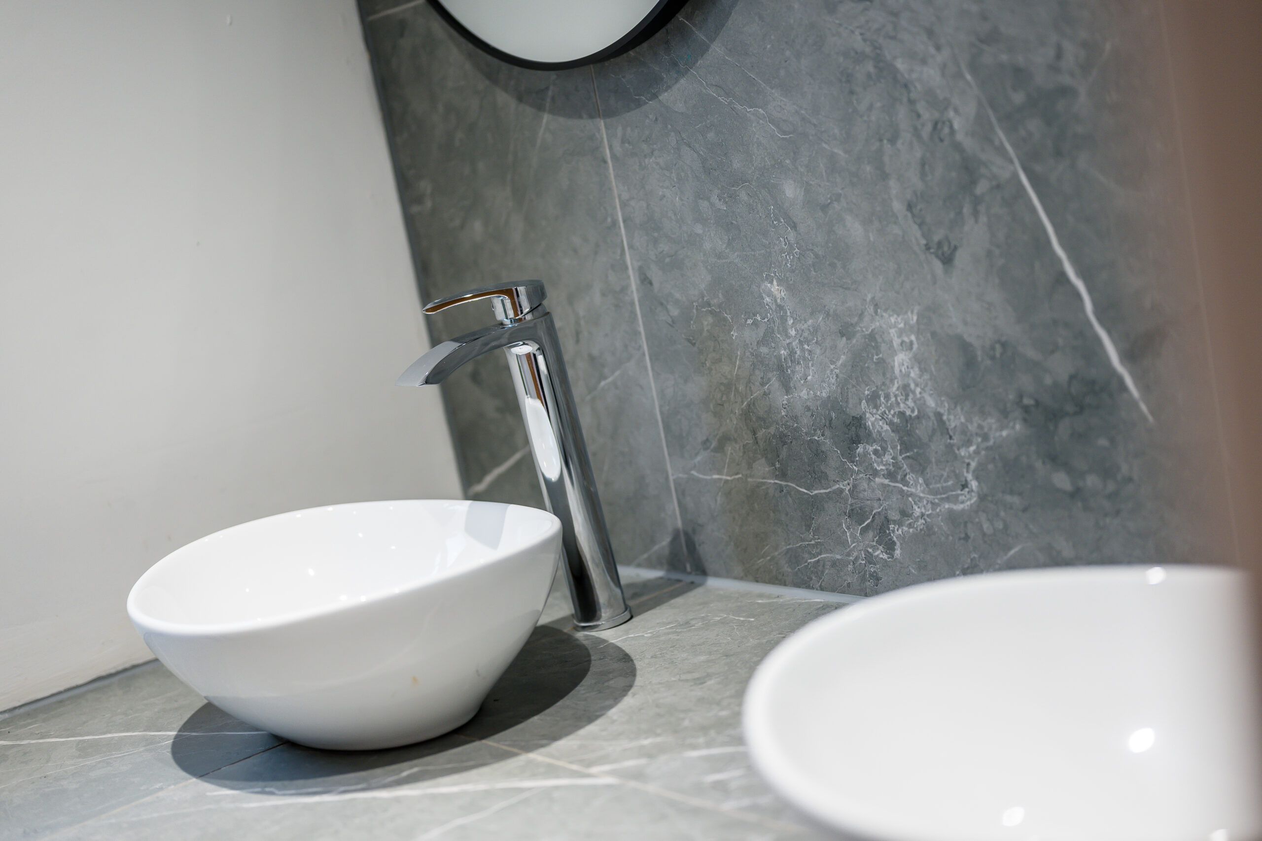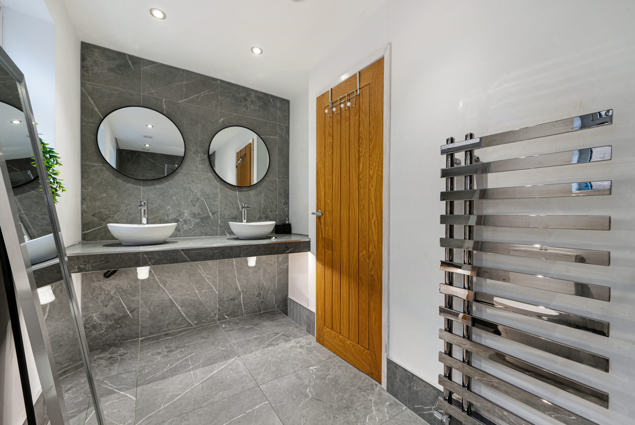 On the first floor, you’ll find three well-proportioned bedrooms, two of which benefit from built-in wardrobes. The modern family bathroom comprises a low-level WC, panelled bath with rainfall shower over, and a his-and-hers sink basin with contemporary tiled splashbacks.