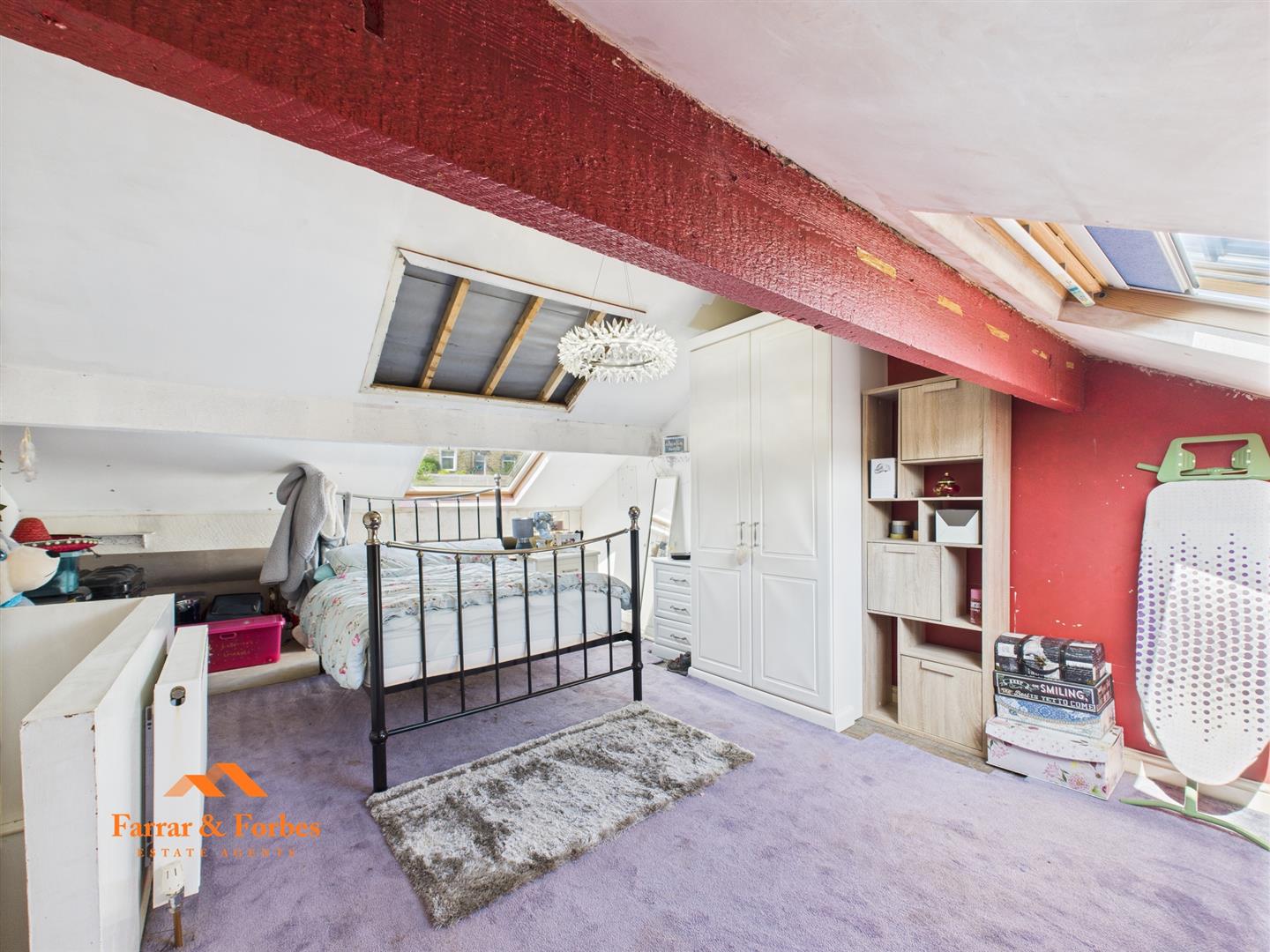 The original built attic room—re-roofed in 2021—offers versatile space, ideal as a guest room, home office, or playroom. The windows and doors were replaced in 2021.