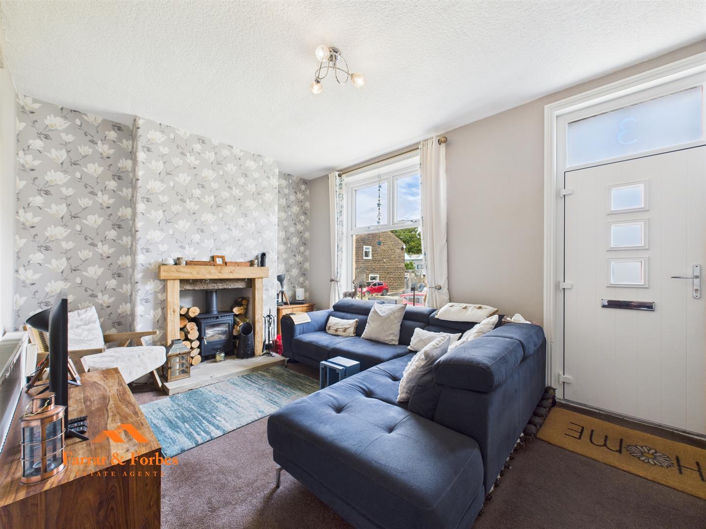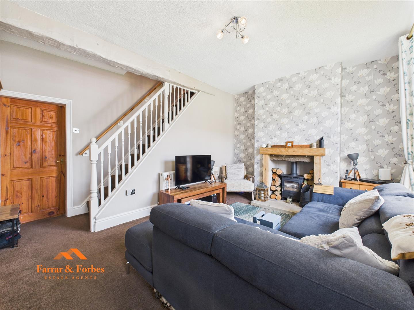 As you arrive, there is convenient on-road parking and a large, well-kept garden forecourt to the front. Stepping inside, the welcoming lounge features a log burner with a oak fire surround, creating a cosy focal point. To the rear, hard block flooring leads you into a spacious dining area with another log burner and plenty of room for a family table.