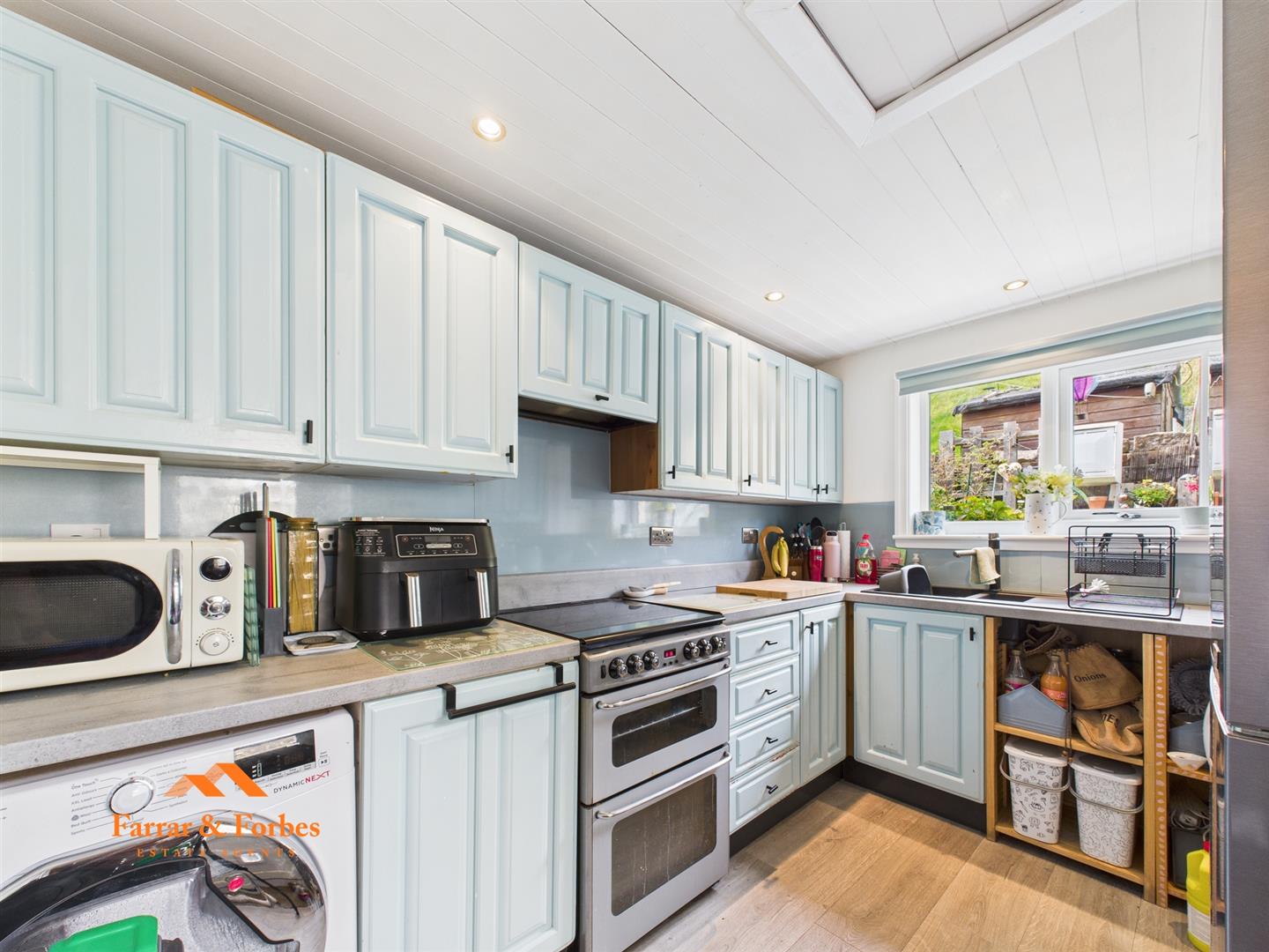 The extended kitchen is fitted with matching wall, base, and drawer units, complemented by contrasting work surfaces, providing both style and practicality.
