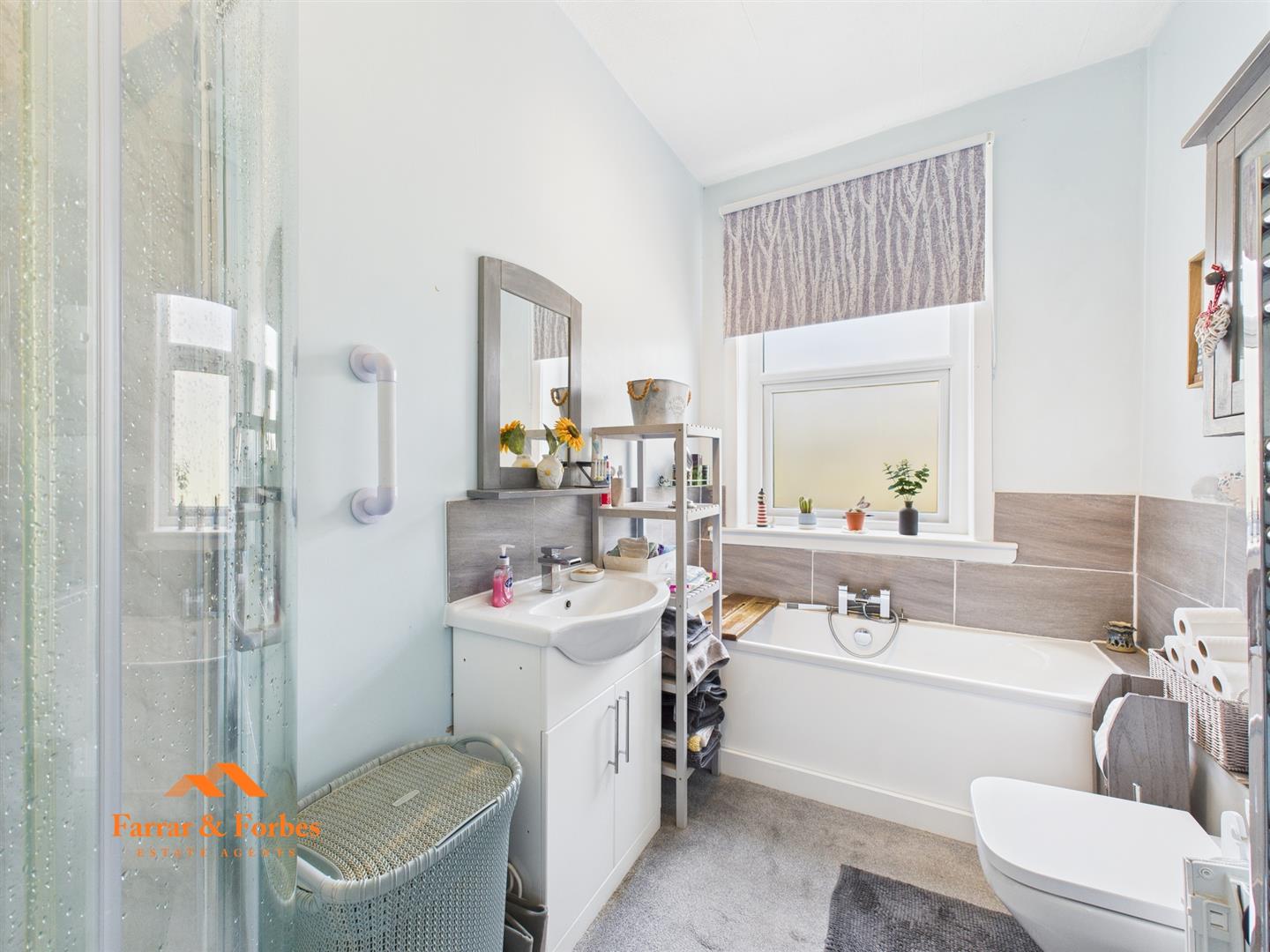 Upstairs, the first floor offers two double bedrooms. The family bathroom is fitted with a low-level WC, hand wash basin, quadrant shower, and a panelled bath, finished with modern grey tile splashbacks.