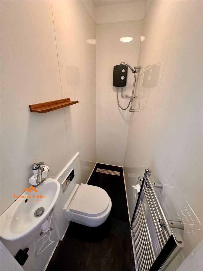 The property comprises an open plan lounge/kitchen with a range of matching wall and base units in grey and a freestanding electric cooker, one good sized double bedroom, and a shower room in white with vanity unit, chrome fixtures and fittings, and heated towel rail.