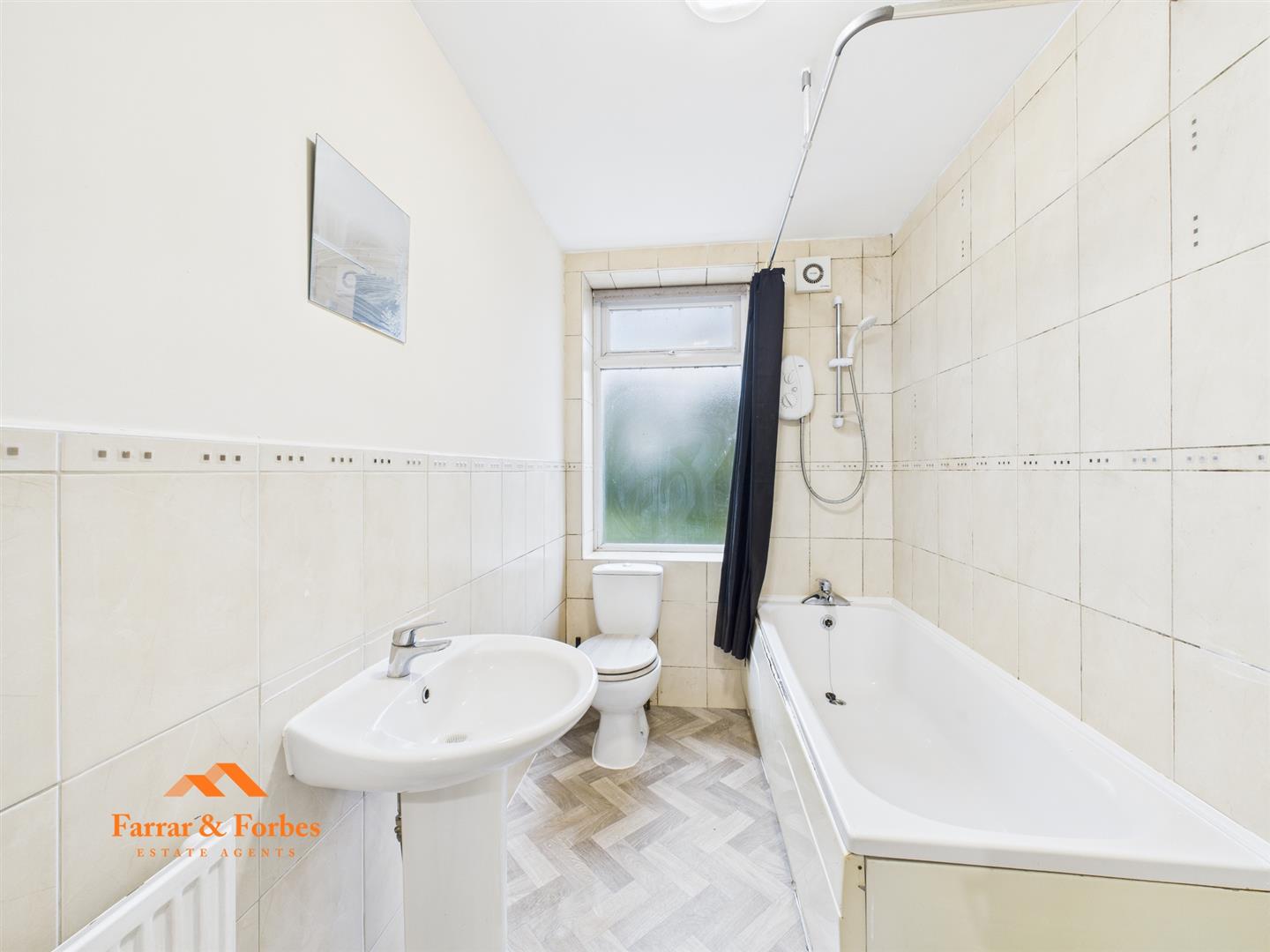 To the first floor, there are two bedrooms, comprising a spacious double bedroom and a well-proportioned single bedroom with fitted wardrobes. The bathroom is fitted with a three-piece white suite, including a low-level WC, pedestal wash hand basin and a panelled bath with overhead shower.