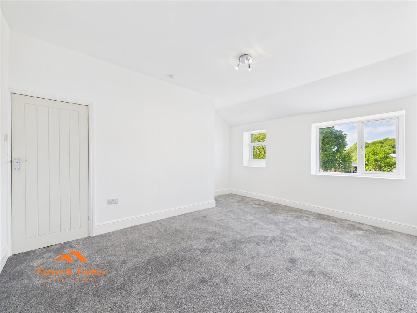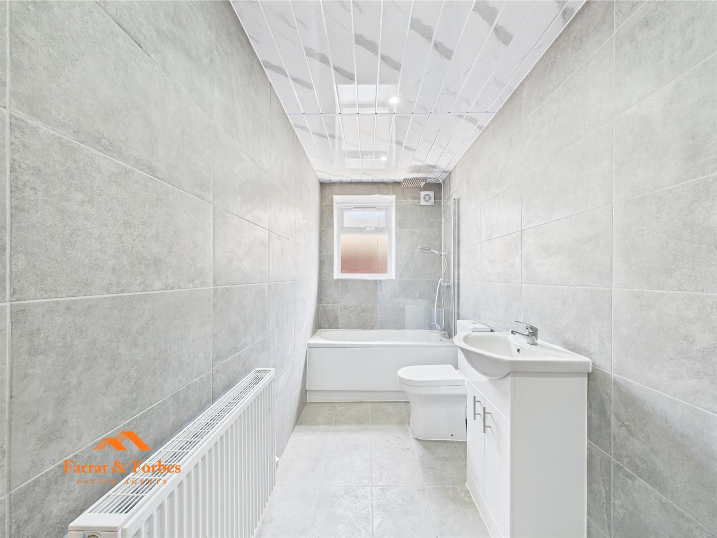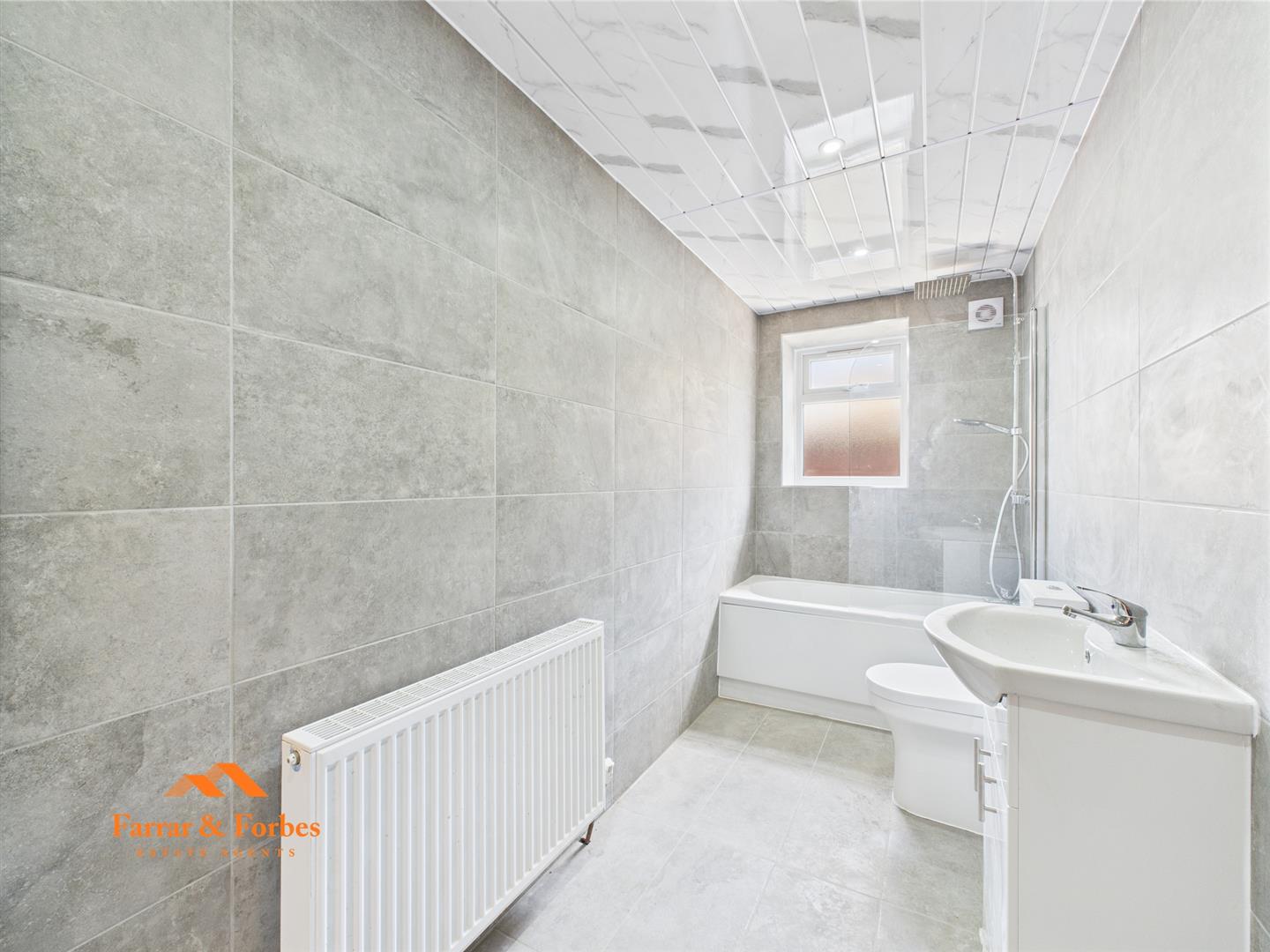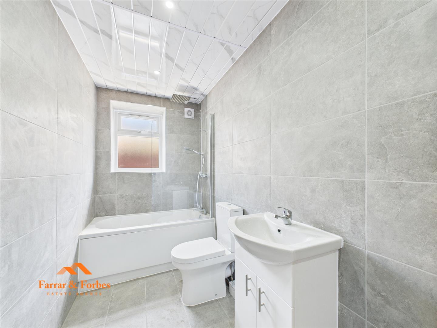 Upstairs, you’ll find two generously sized double bedrooms, freshly decorated in neutral tones, ready for your personal touch. The newly fitted bathroom is a true highlight, fully tiled from floor to ceiling with elegant panels and ceiling spotlights. It features a low-level WC, pedestal sink, and a panelled bath with overhead shower and glass screen.