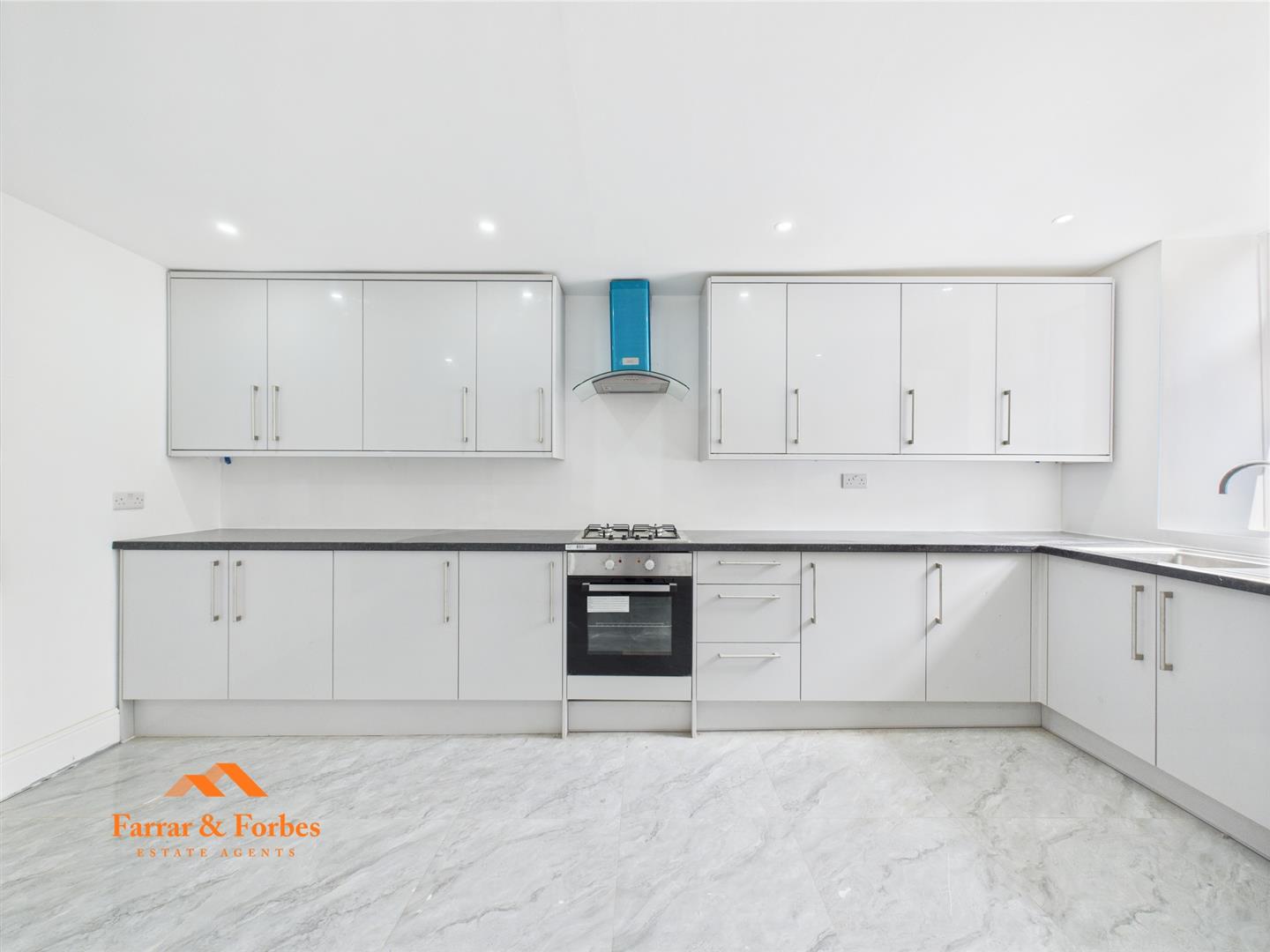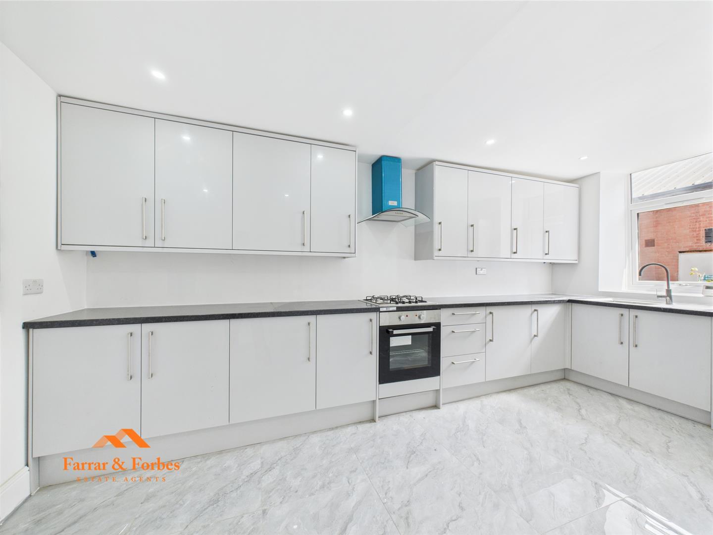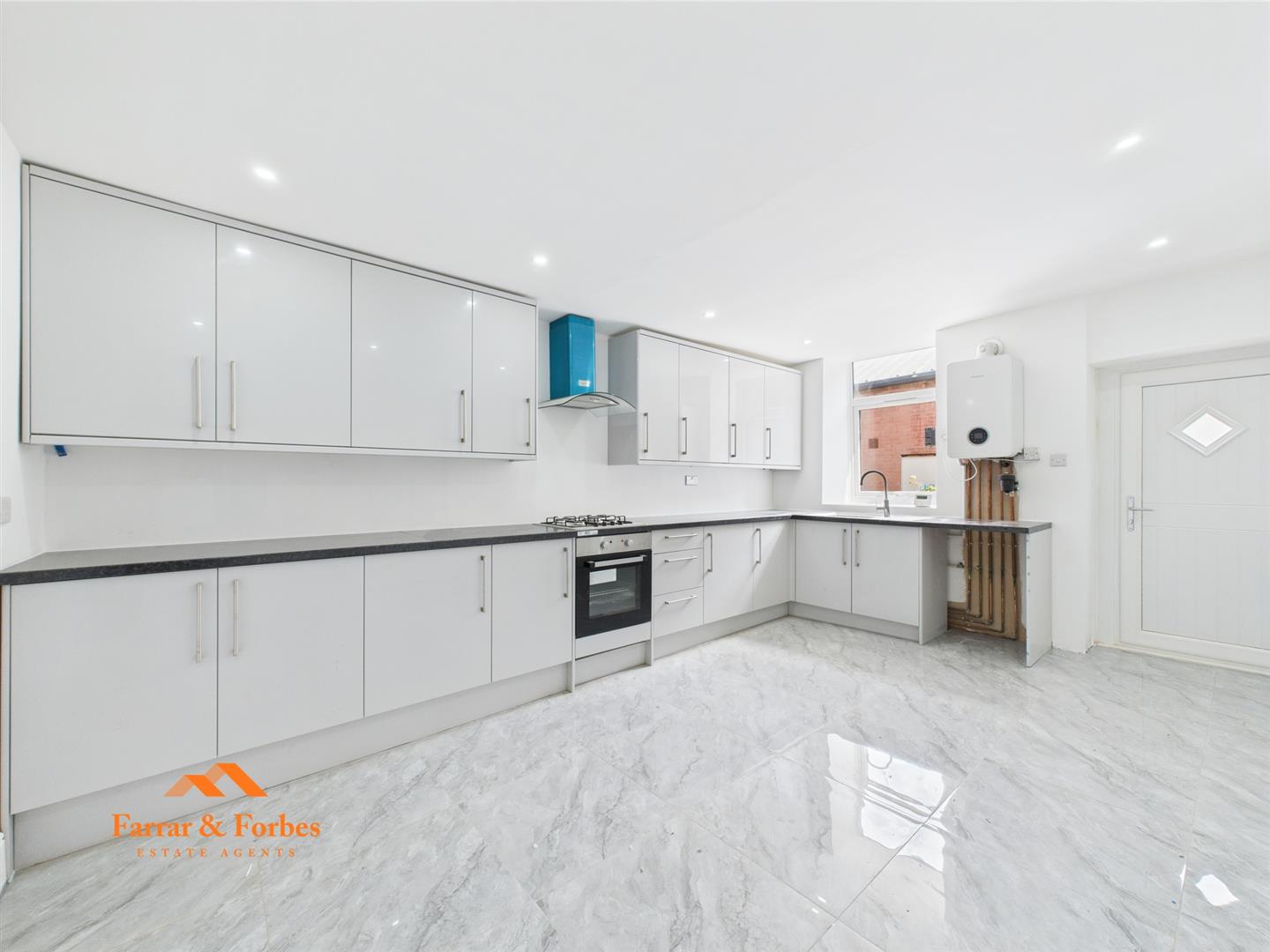 To the rear lies the heart of the home – a fully tiled kitchen/diner featuring sleek new wall, base, and drawer units with contrasting worktops. Modern appliances include an electric oven, hob, and extractor hood, all set within a contemporary design ideal for cooking and entertaining. A convenient downstairs WC with modern tiled splashbacks and hand-wash basin completes the ground floor.