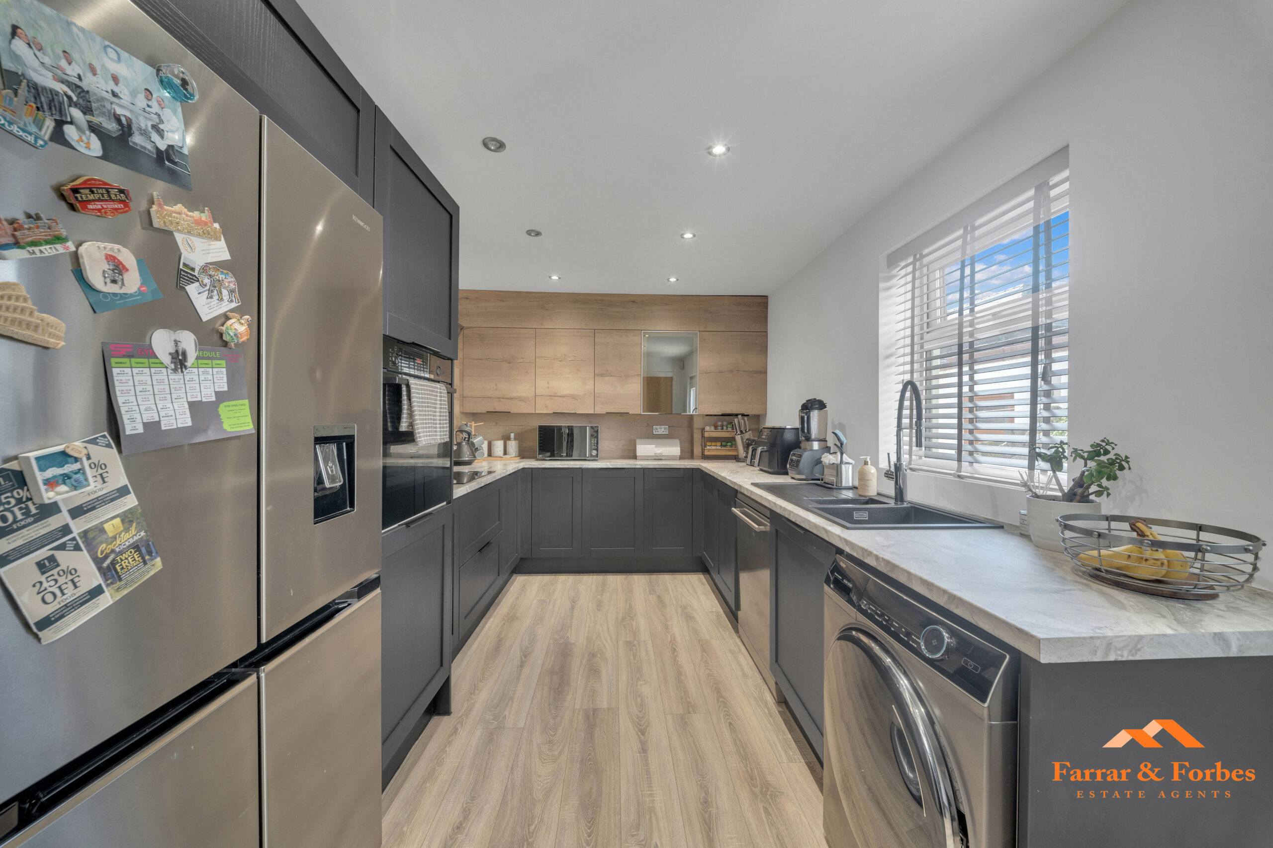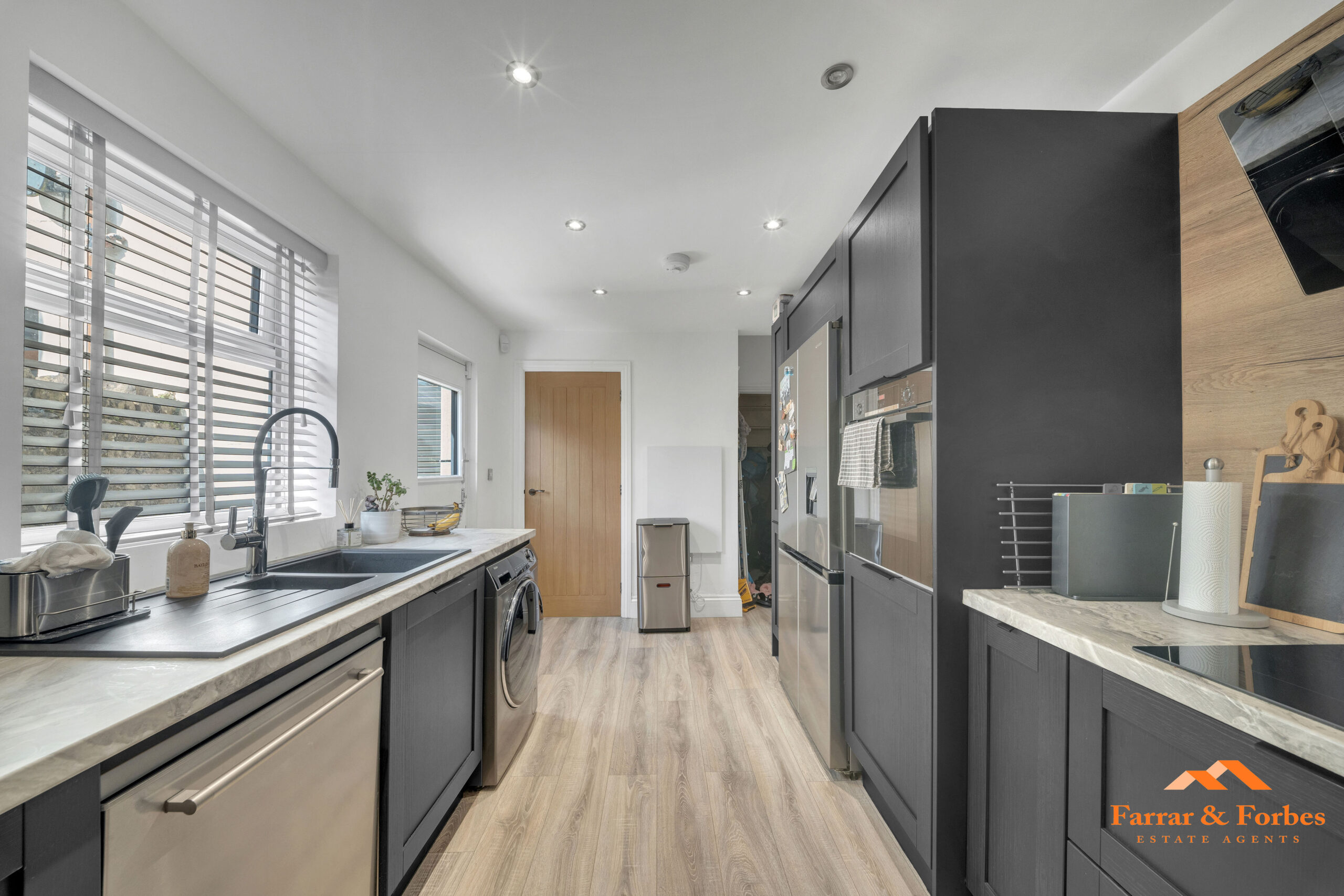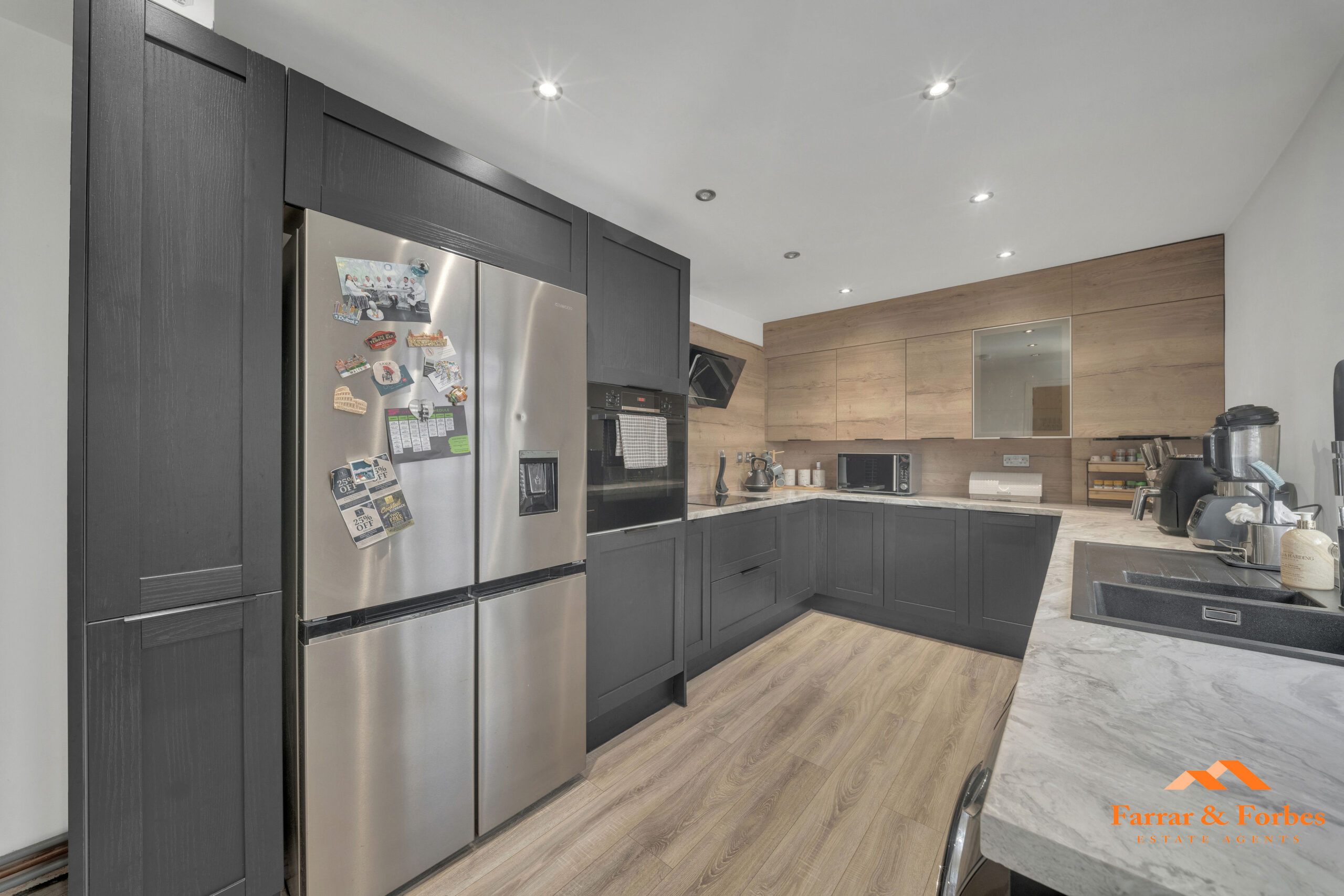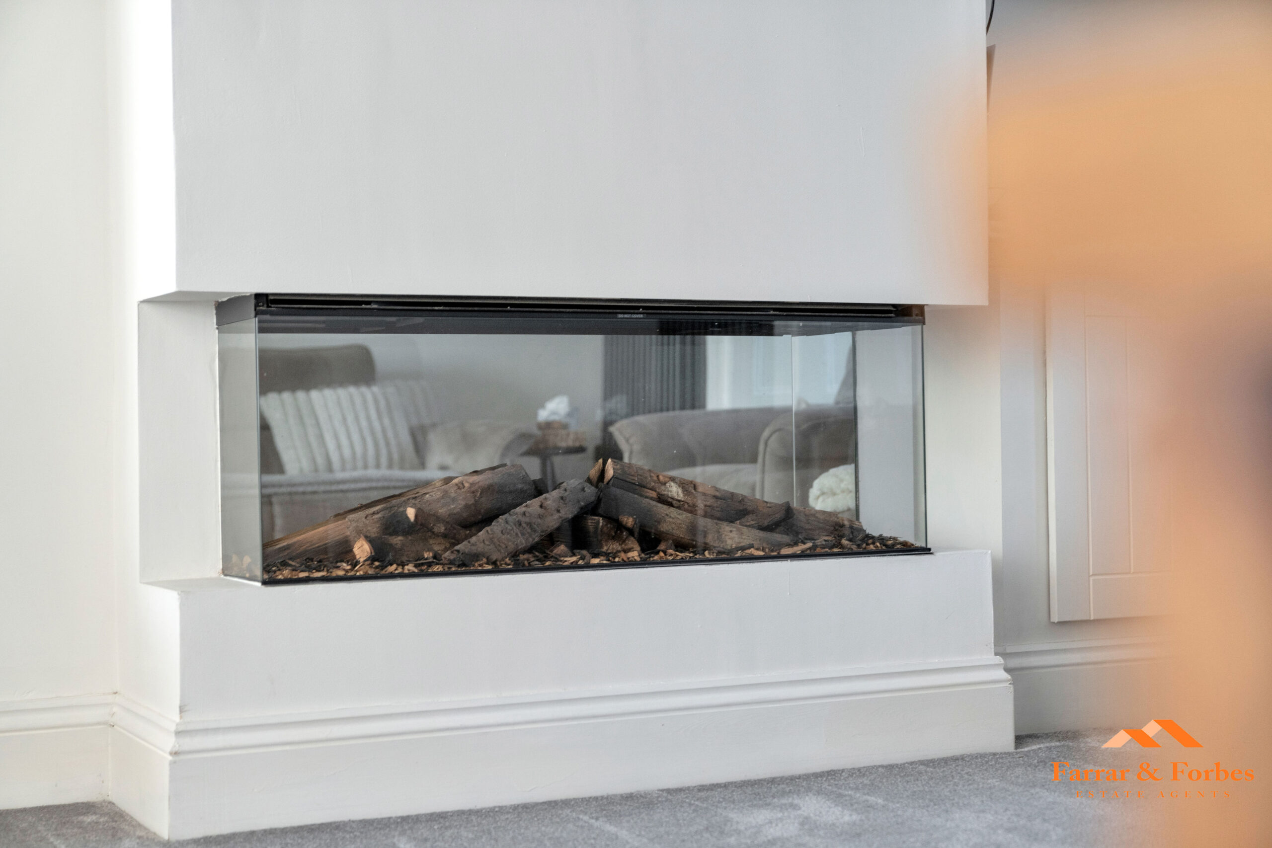 Inside, the property features a stylish custom German kitchen, fitted with high-quality electrical appliances such as dishwasher, electric oven, induction hob and washing machine. A welcoming lounge complete with a modern electric fireplace, Bay window, and open-plan dining room.