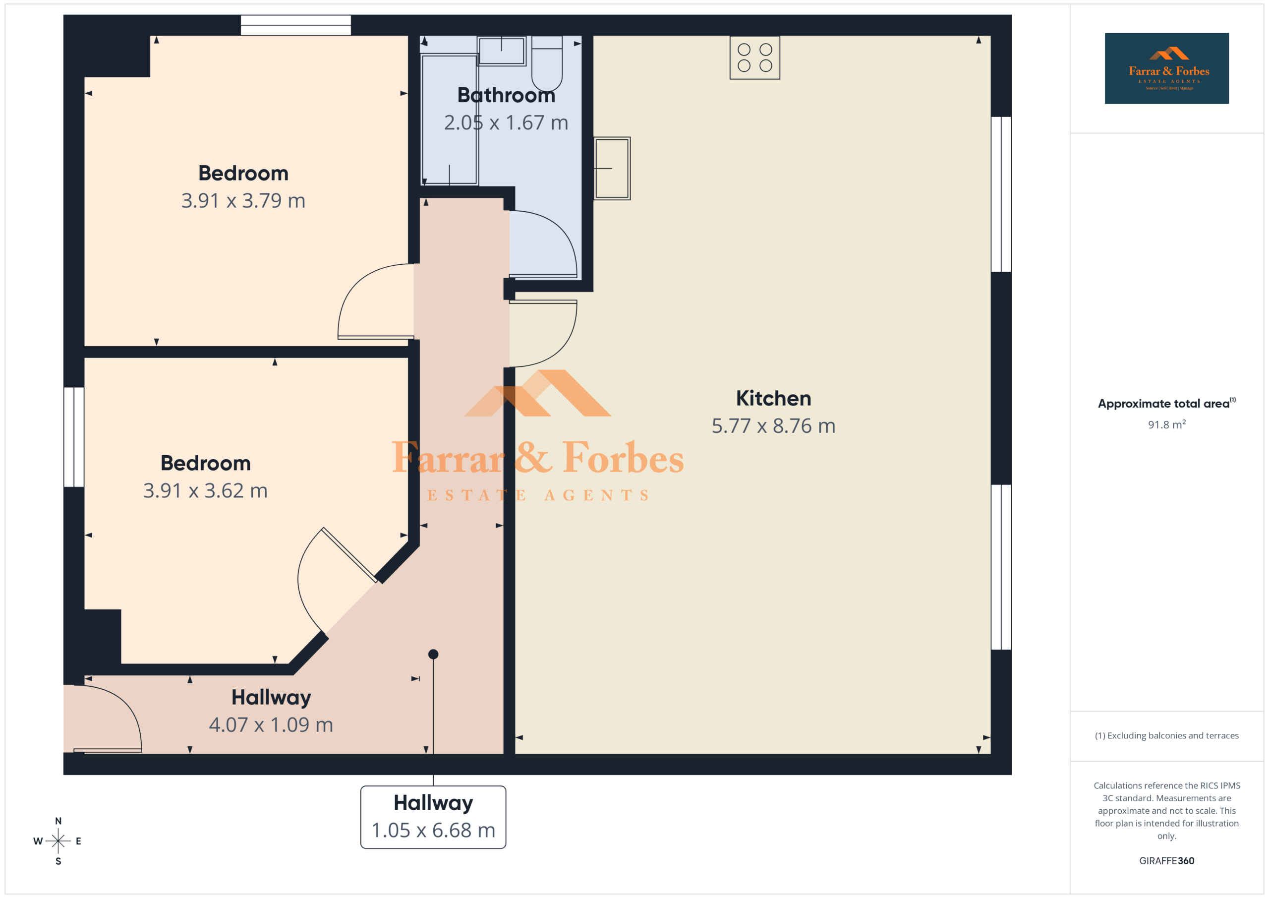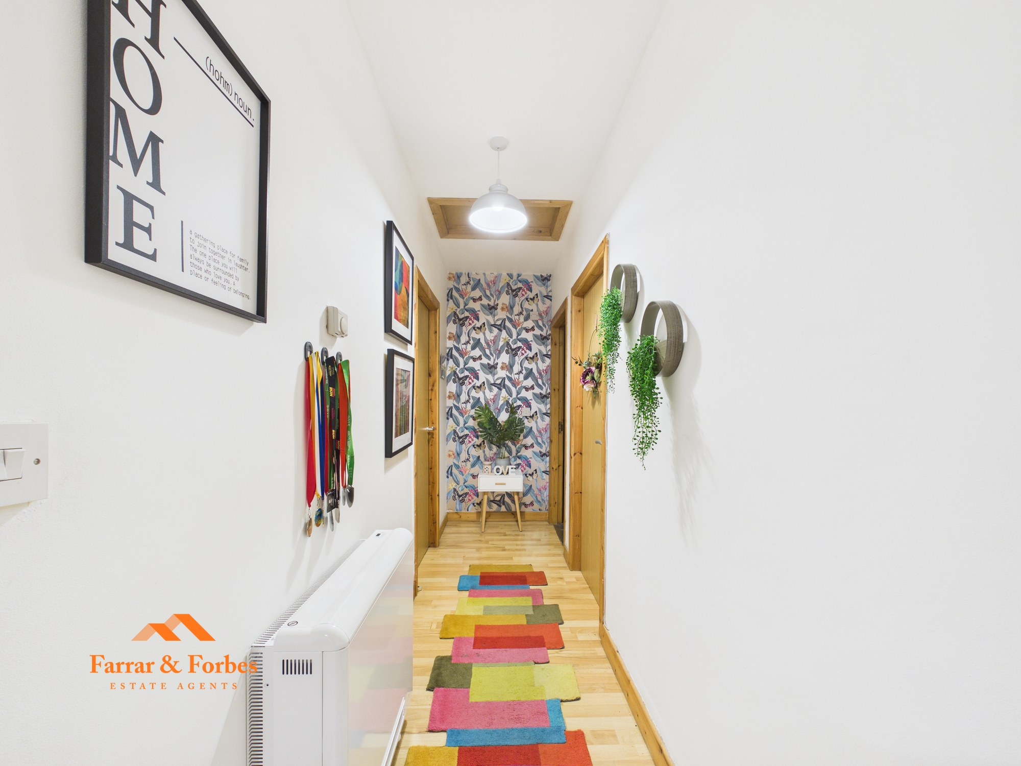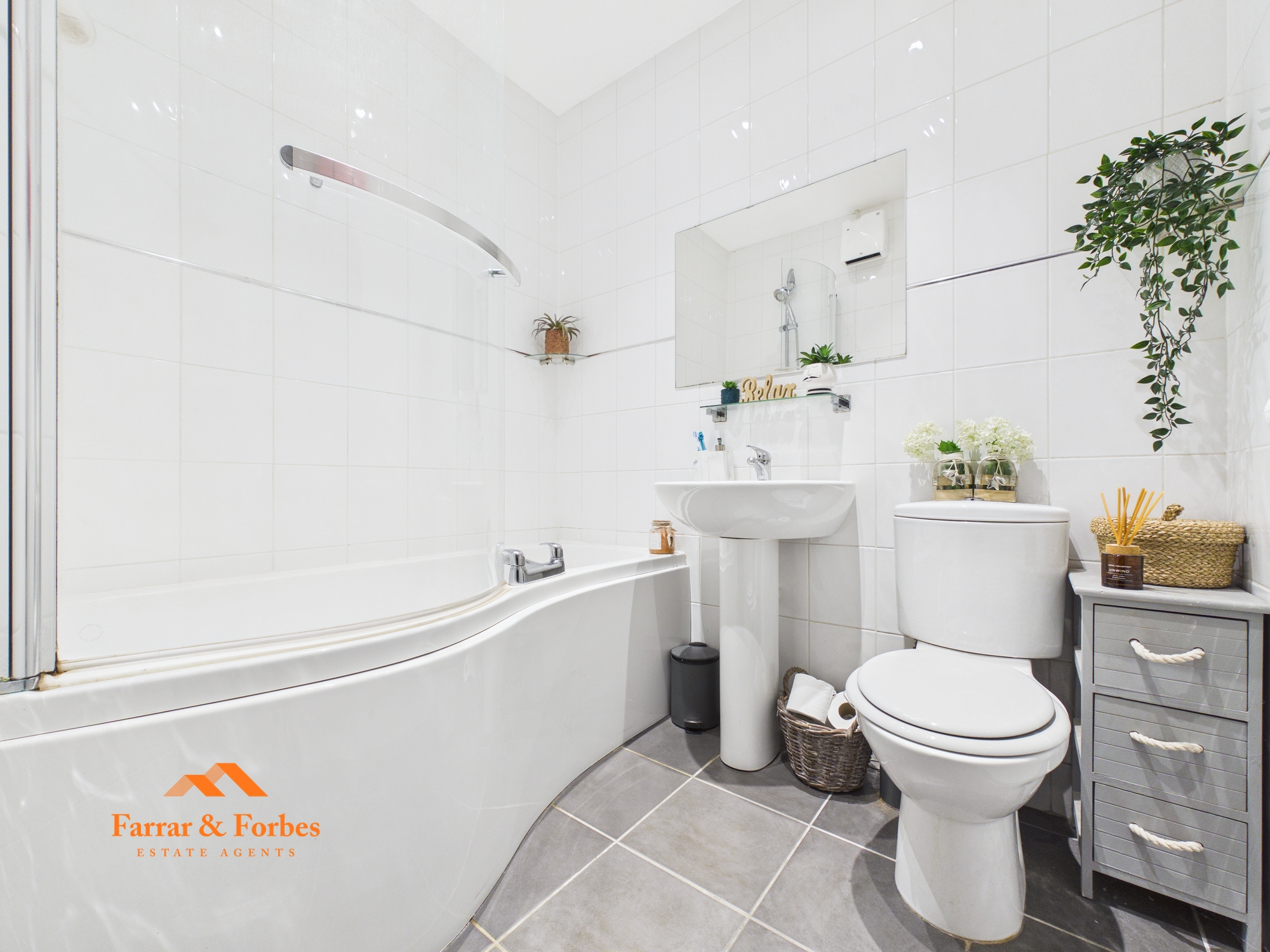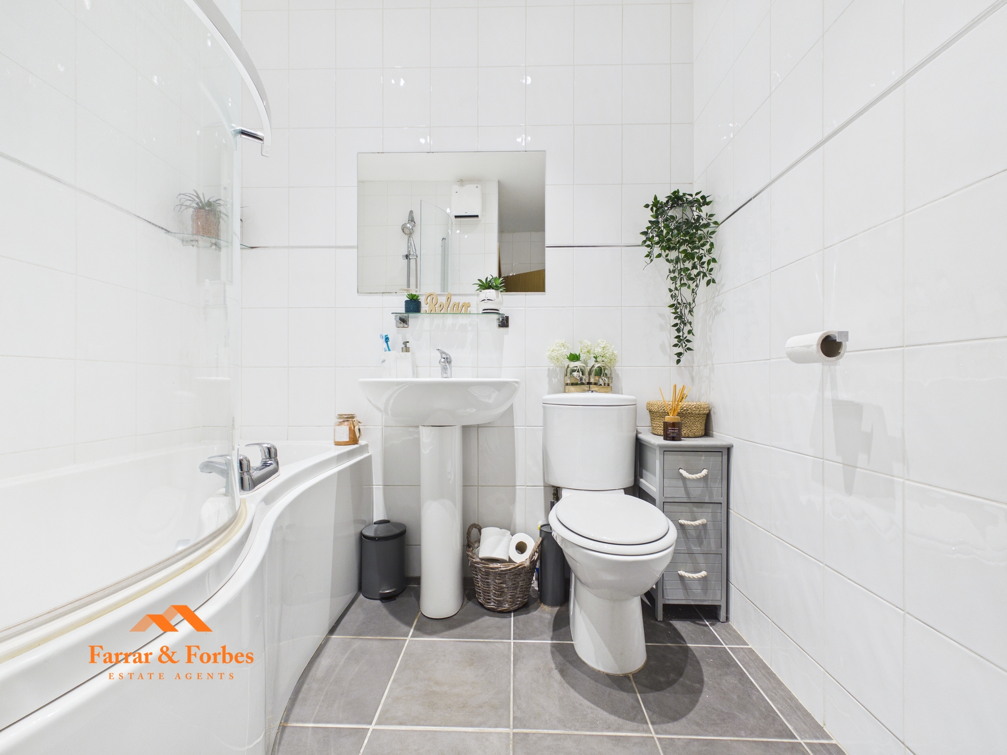 Upon entering the property, an L-shaped hallway provides access to all rooms. There are two generously sized double bedrooms, along with a modern three-piece bathroom suite comprising a low-level WC, pedestal hand wash basin, and a panelled bath with overhead shower and white tiled splashback.