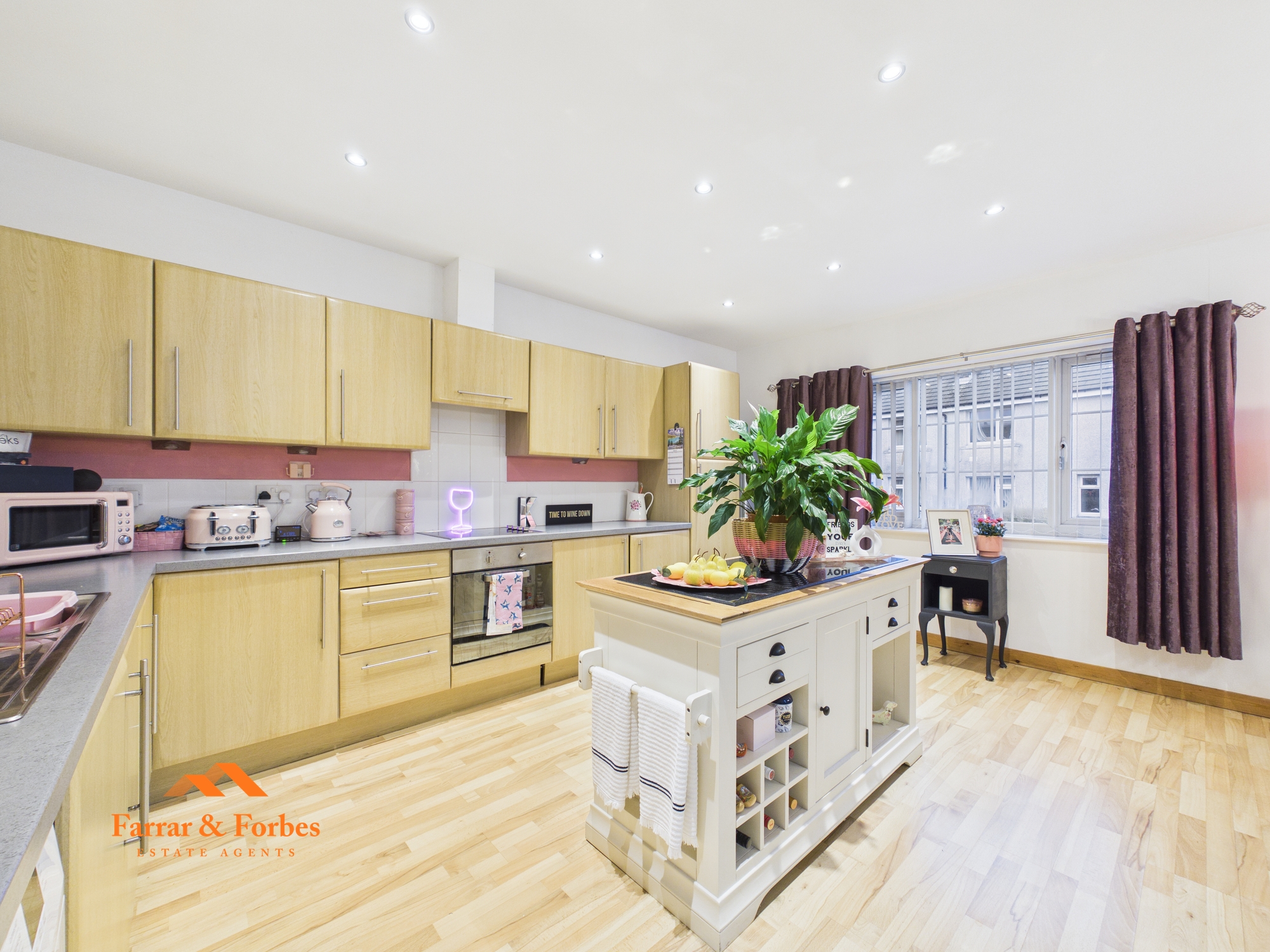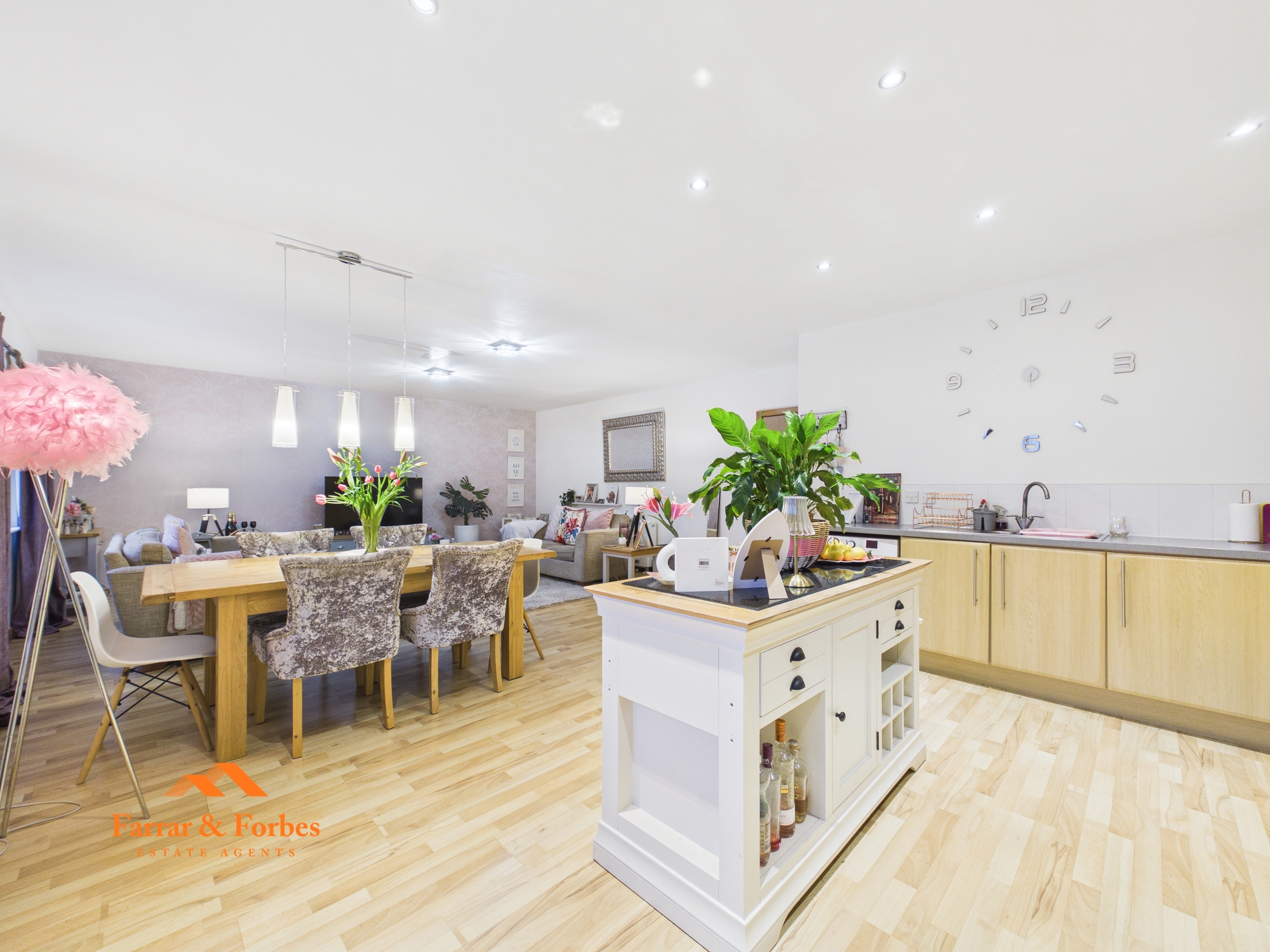 The apartment’s standout feature is the impressive open-plan kitchen and living area, offering a bright and versatile. The kitchen is arranged in an L-shape and currently includes a moveable island, along with an electric oven, hob, and circulator hood. There is ample room for a family dining table, seamlessly flowing into the living area. Large windows flood the space with natural light, creating an airy and welcoming atmosphere.