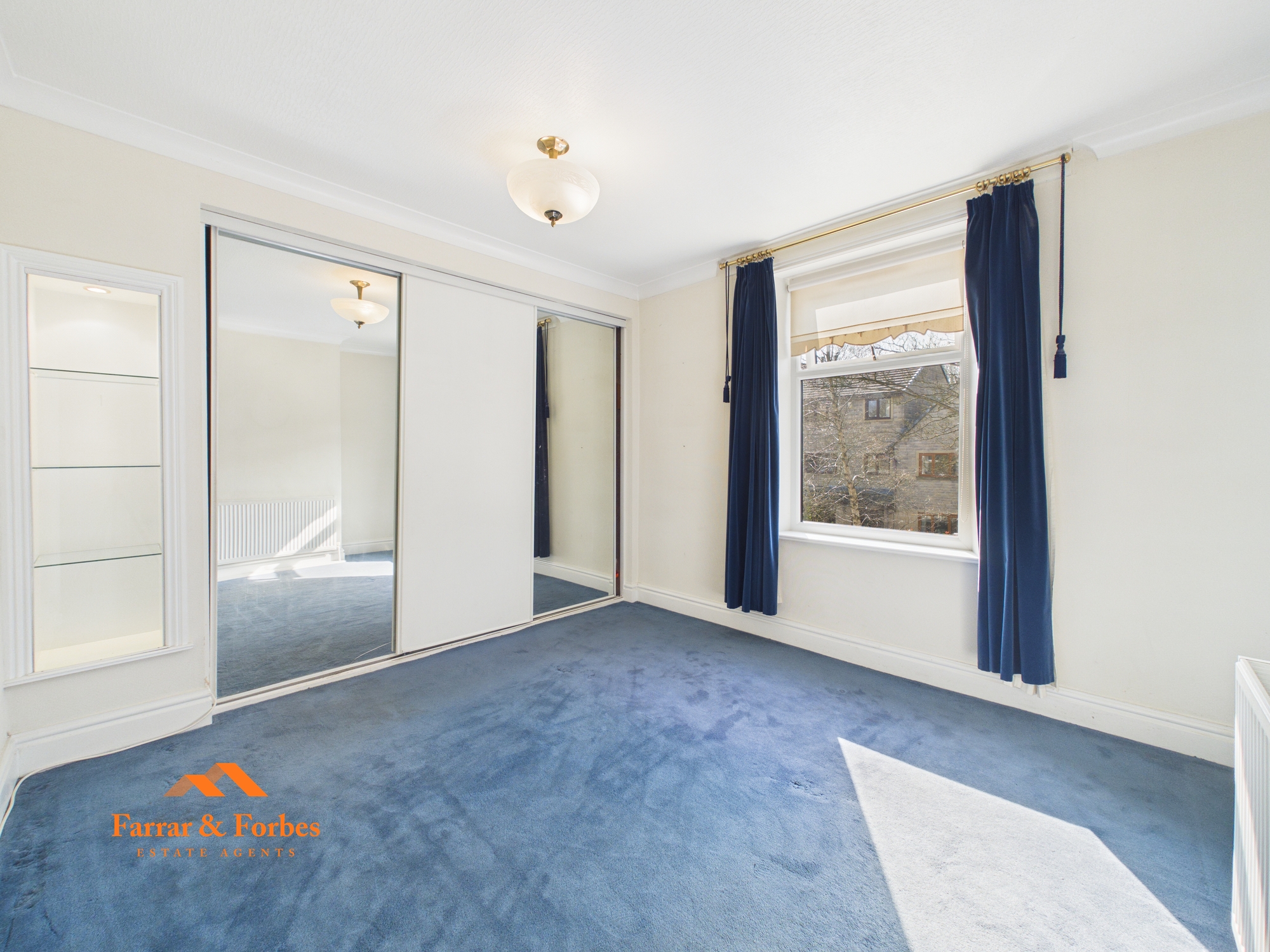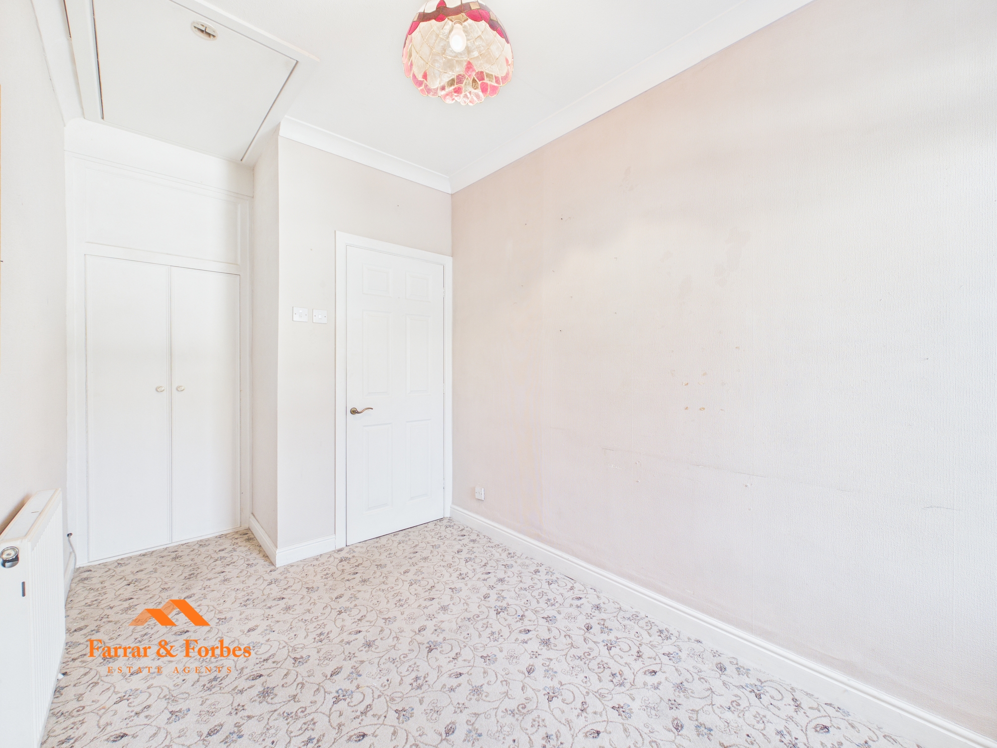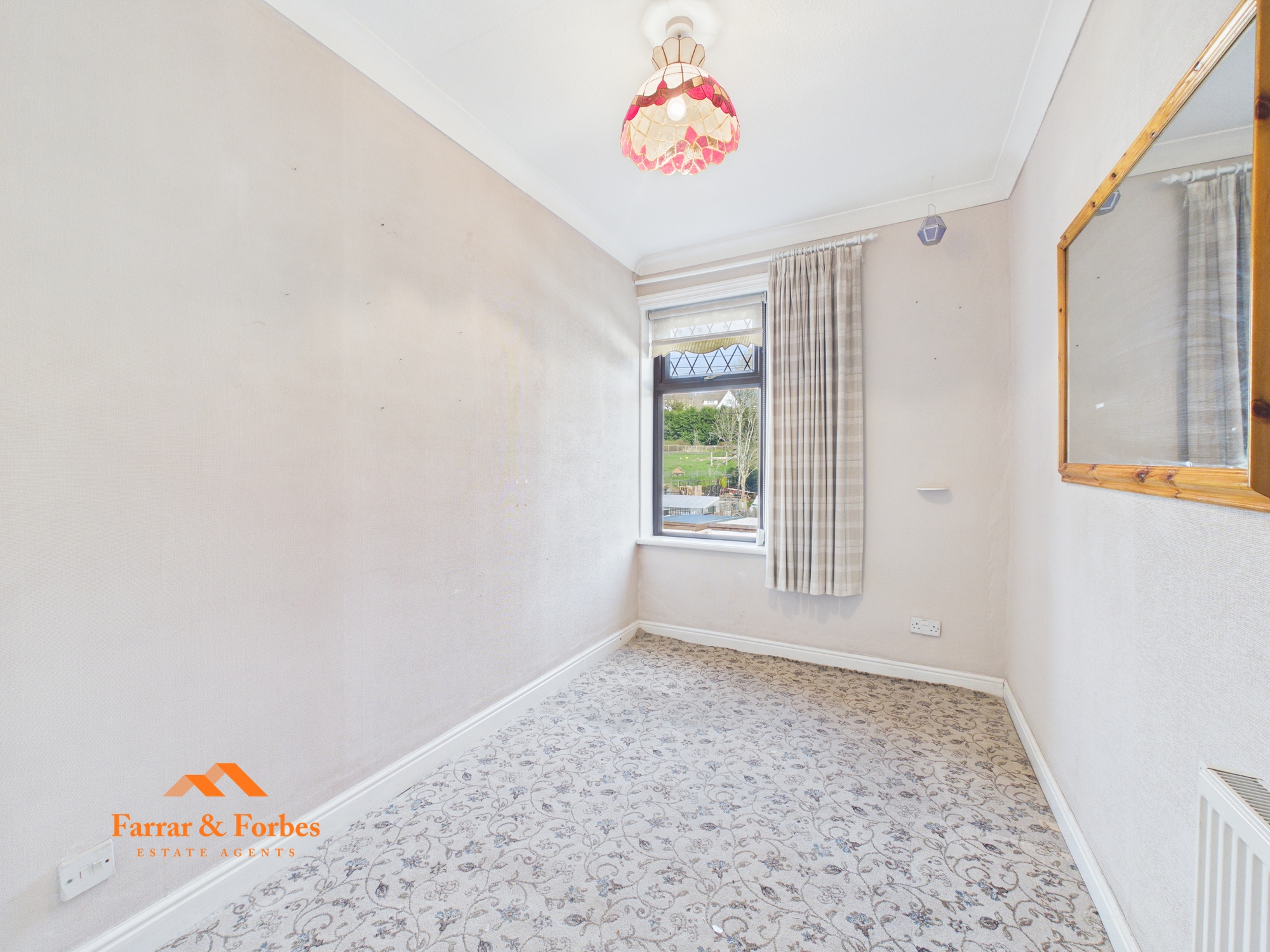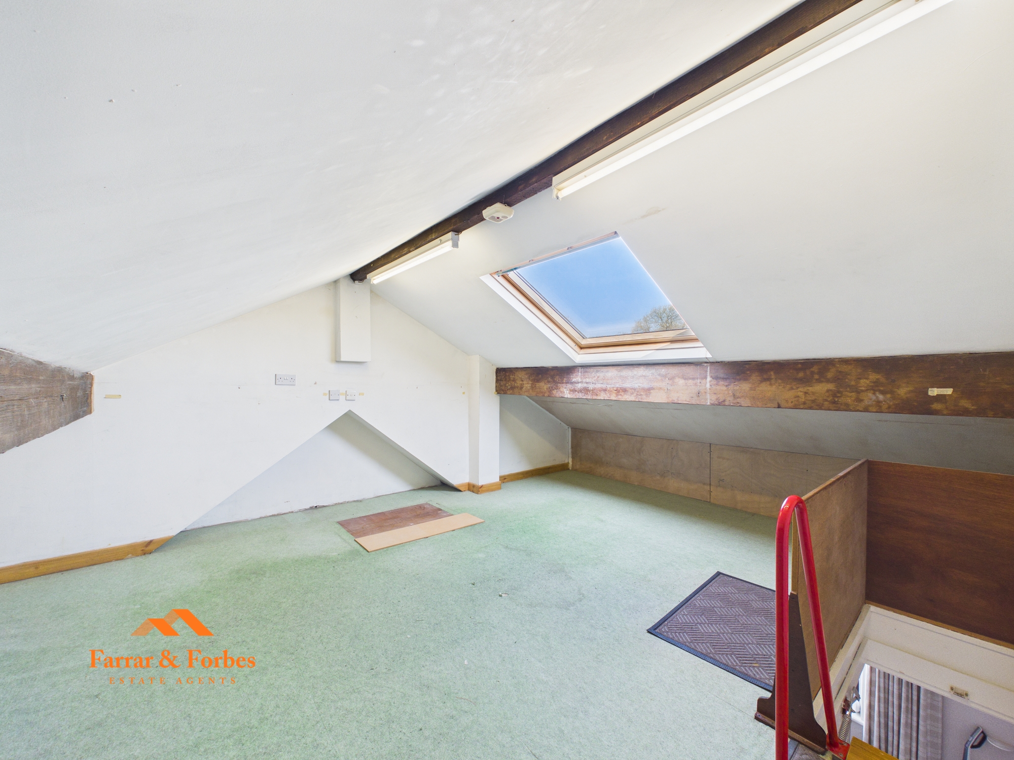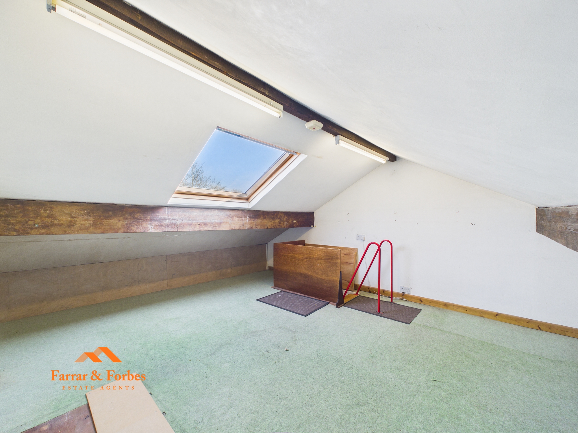 To the first floor are two bedrooms, including a generous main double bedroom with fitted wardrobes. The second bedroom provides access to a fully boarded loft space, previously used as a hobby room, complete with a Velux-style window.