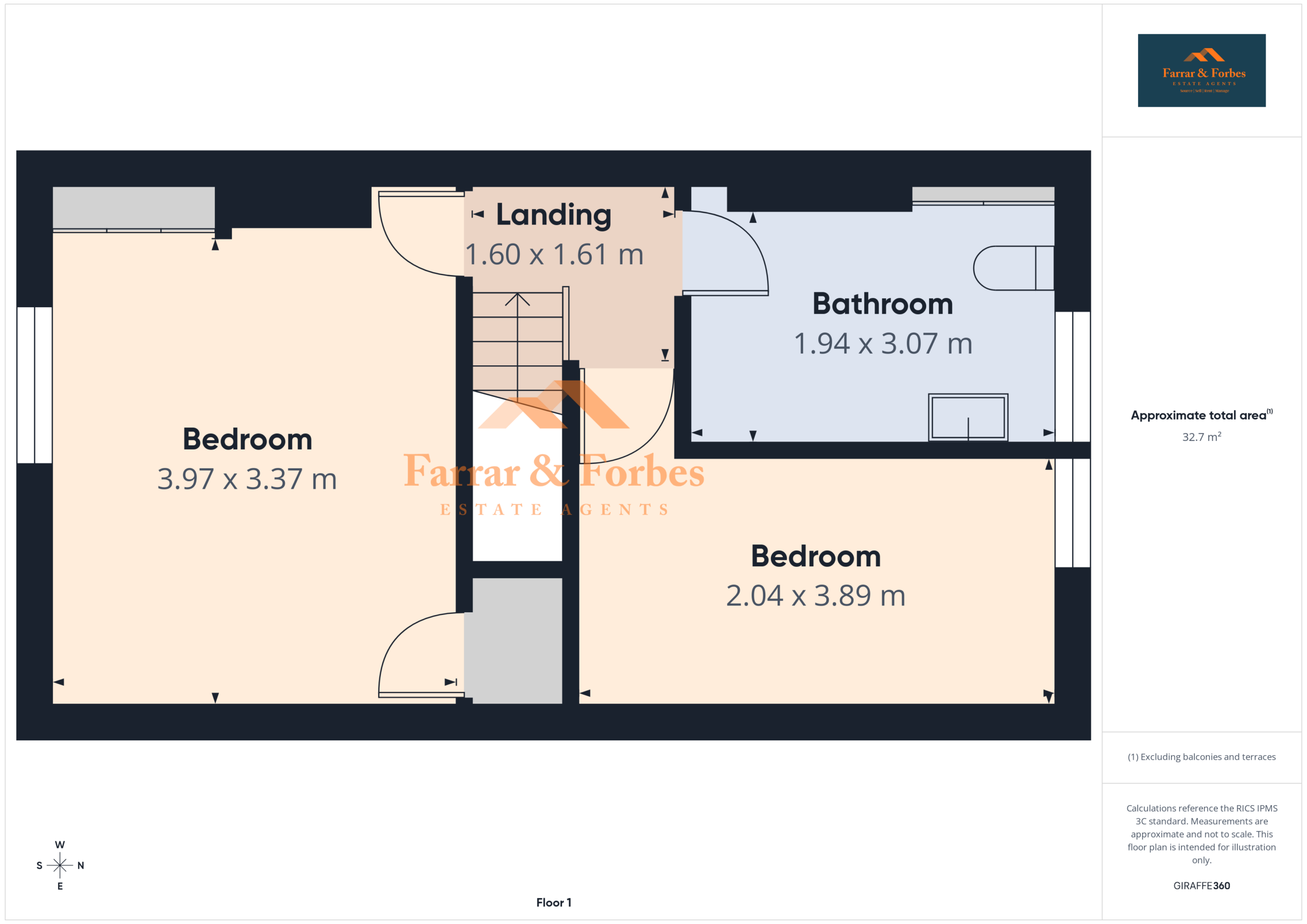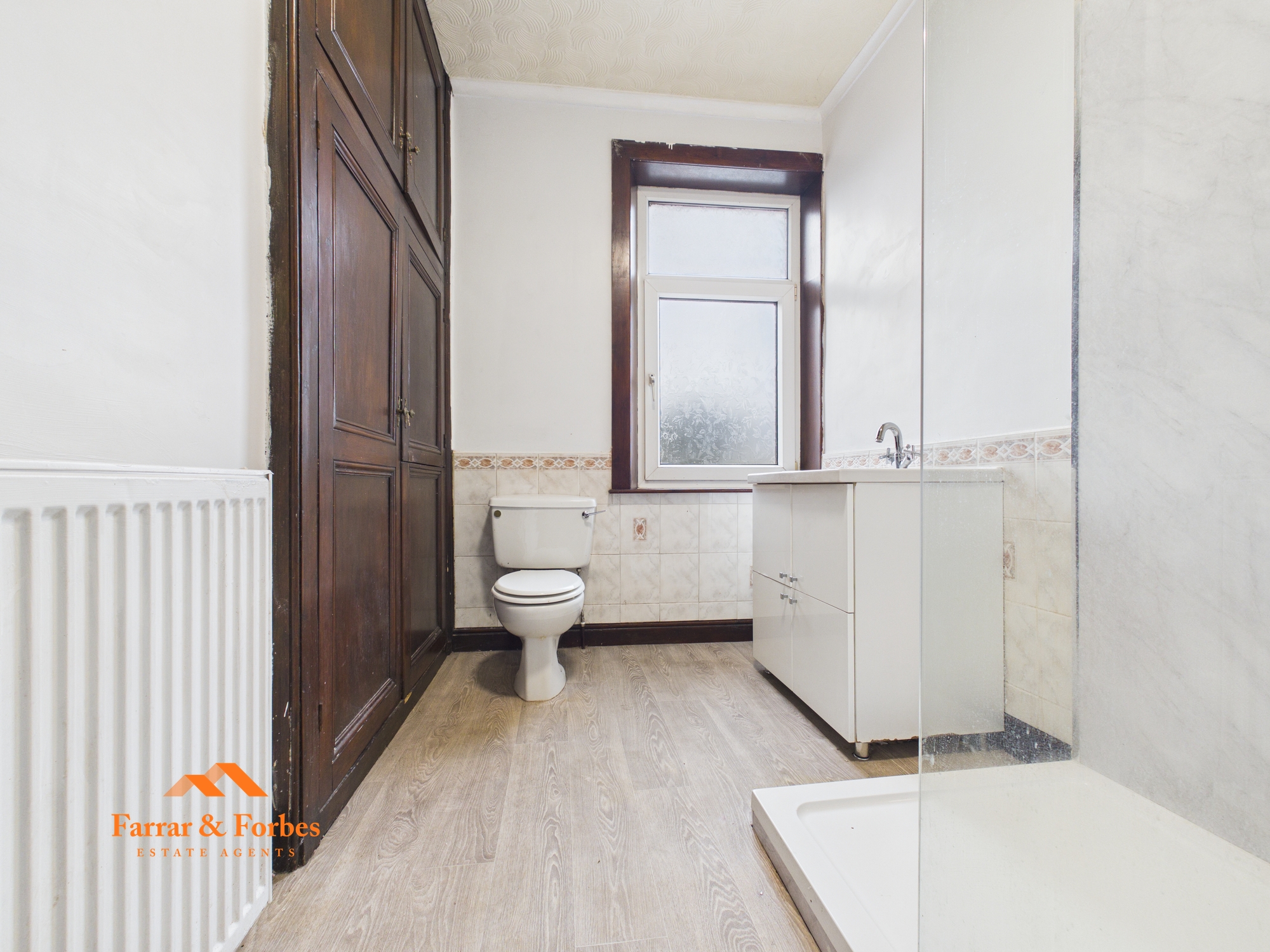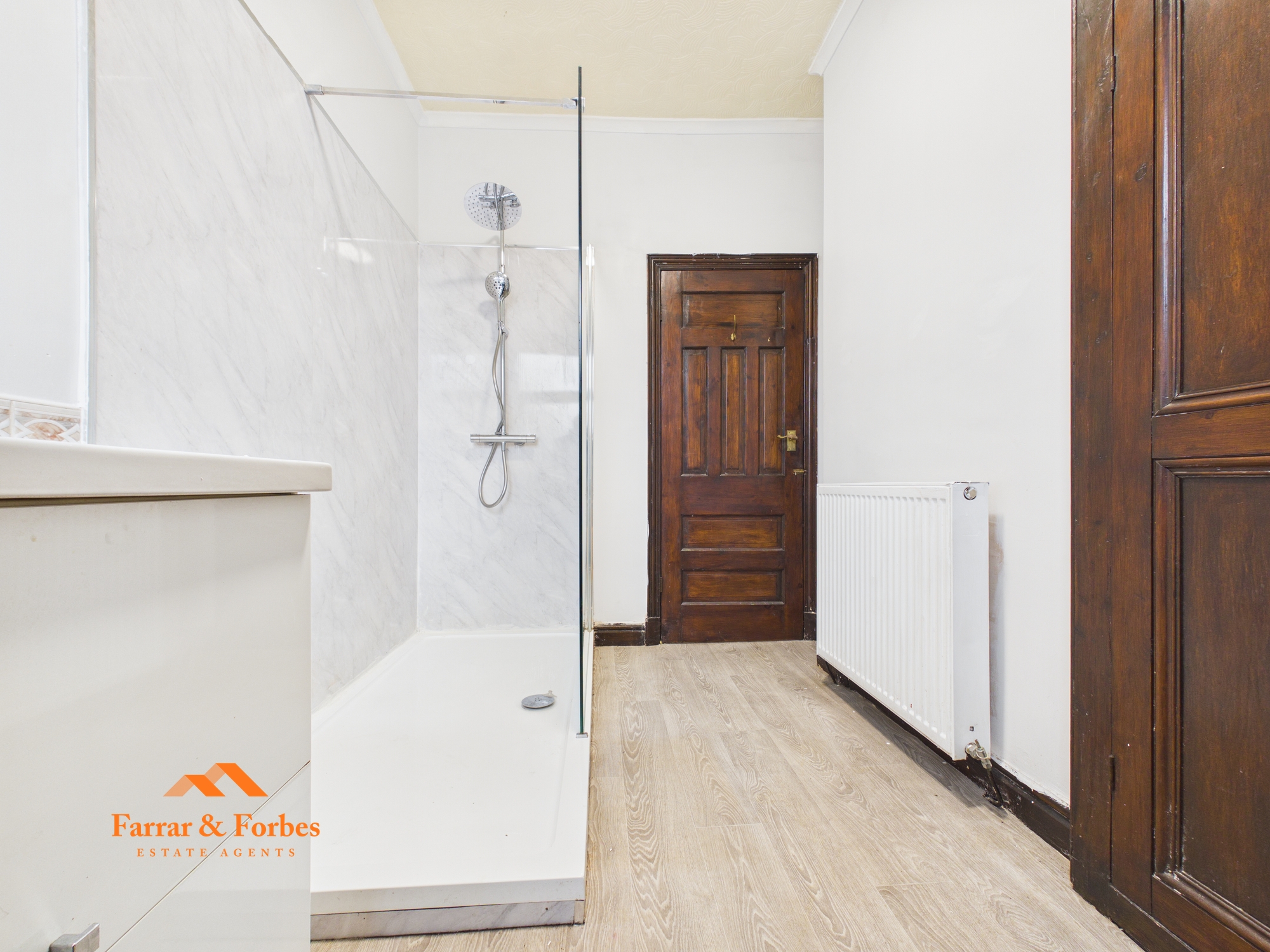 To the first floor are two bedrooms comprising a generous double and a well-sized single. The bathroom is fitted with a modern three-piece suite including a low-level WC, pedestal wash hand basin, and a walk-in shower.