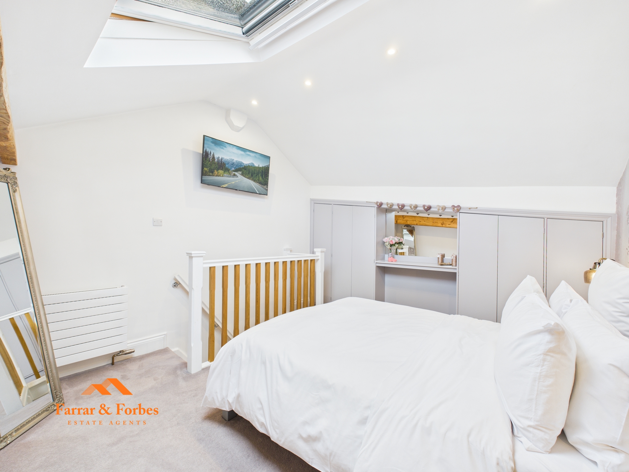 The top floor provides a characterful guest room, showcasing exposed beams that retain the home’s original charm. This room also benefits from built-in wardrobe space and a Velux window, allowing for plenty of natural light.