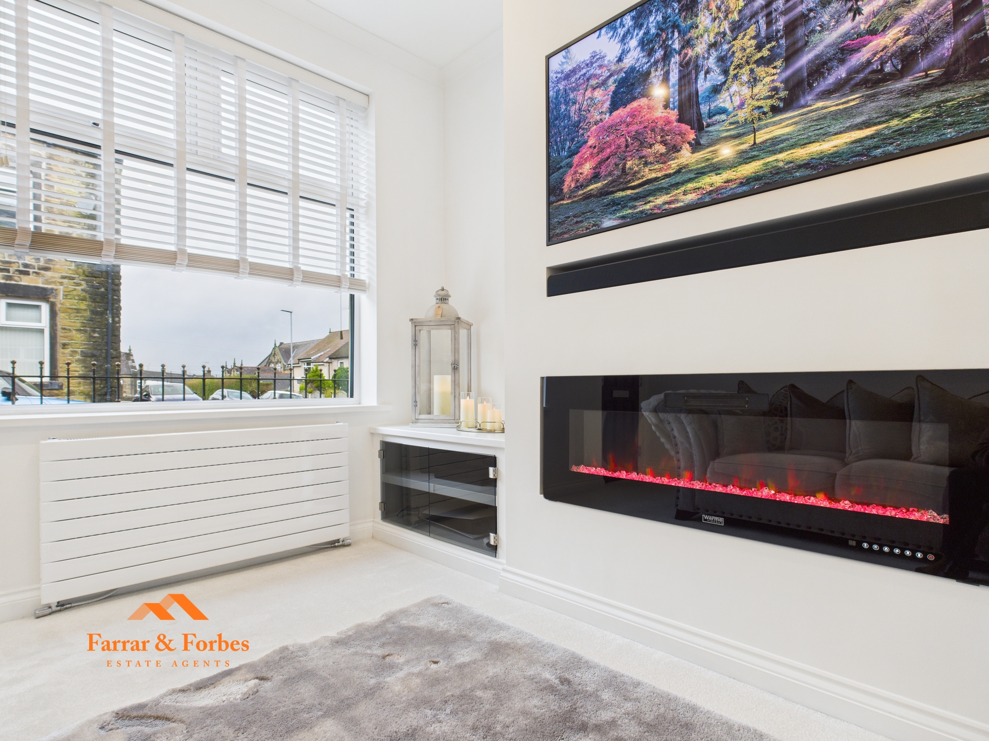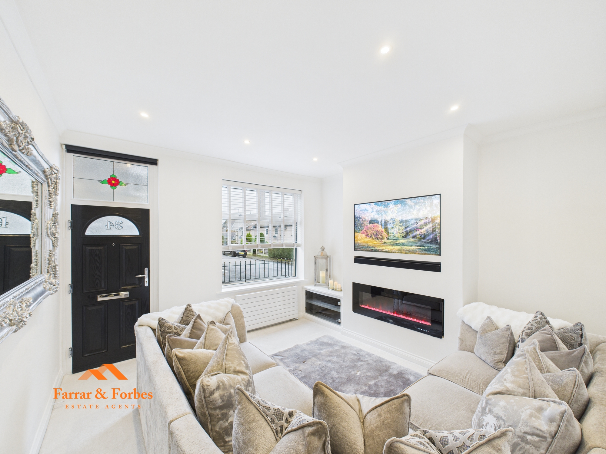 On approach, the property immediately impresses with its sandblasted stone frontage and attractive front courtyard. Step inside to a stylish lounge featuring a bespoke media wall with an electric fire and a sleek glass-fronted display cabinet, creating a warm yet contemporary living space.