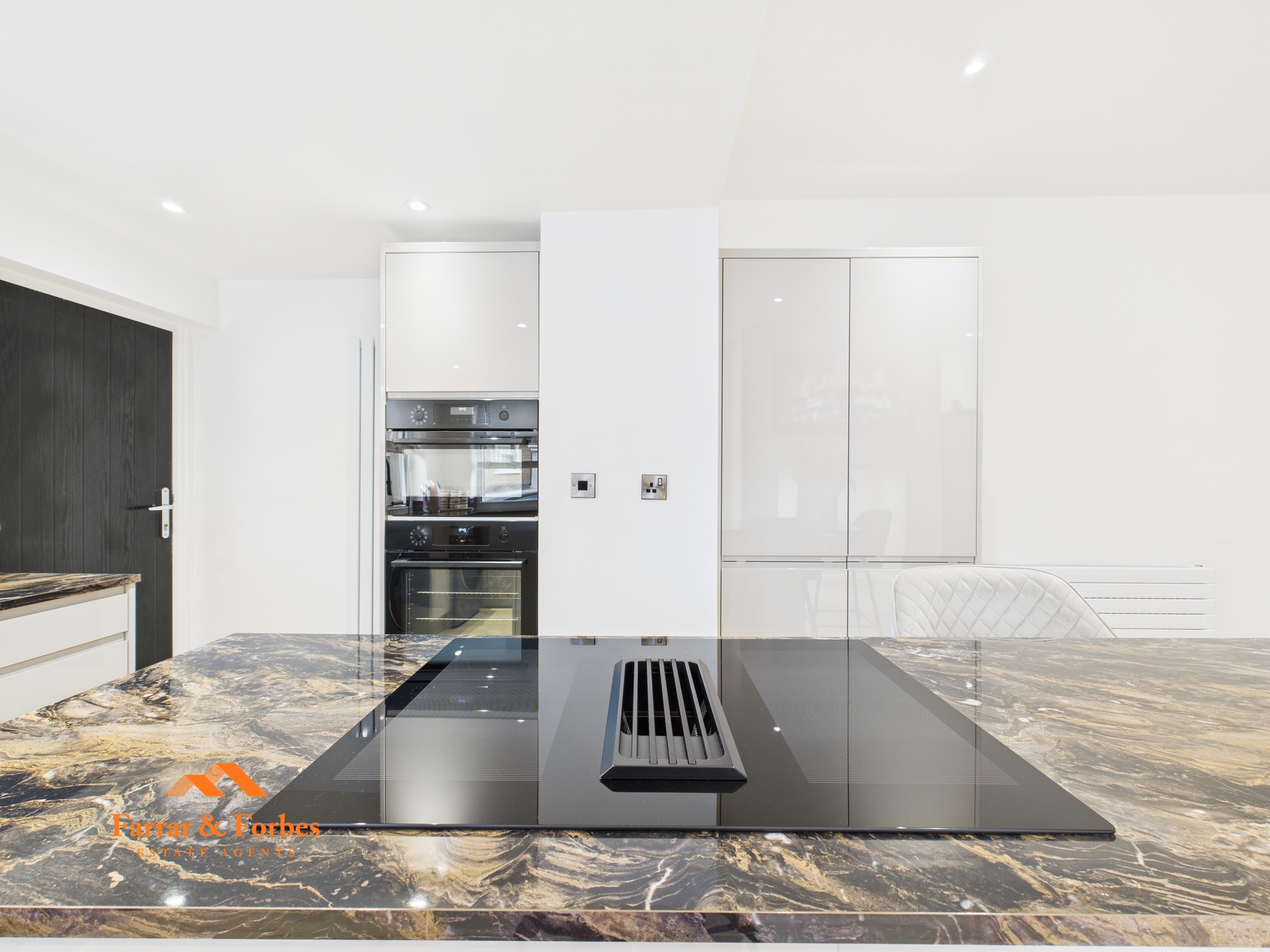 To the rear, the home opens into a stunning extended open-plan kitchen diner. The kitchen is fitted with matching wall, base and drawer units, integrated oven, fridge and freezer, and a striking matte black sink and drainer. A central island with electric hob and built-in circulator provides both a focal point and a practical breakfast bar, with ample space for dining and entertaining.