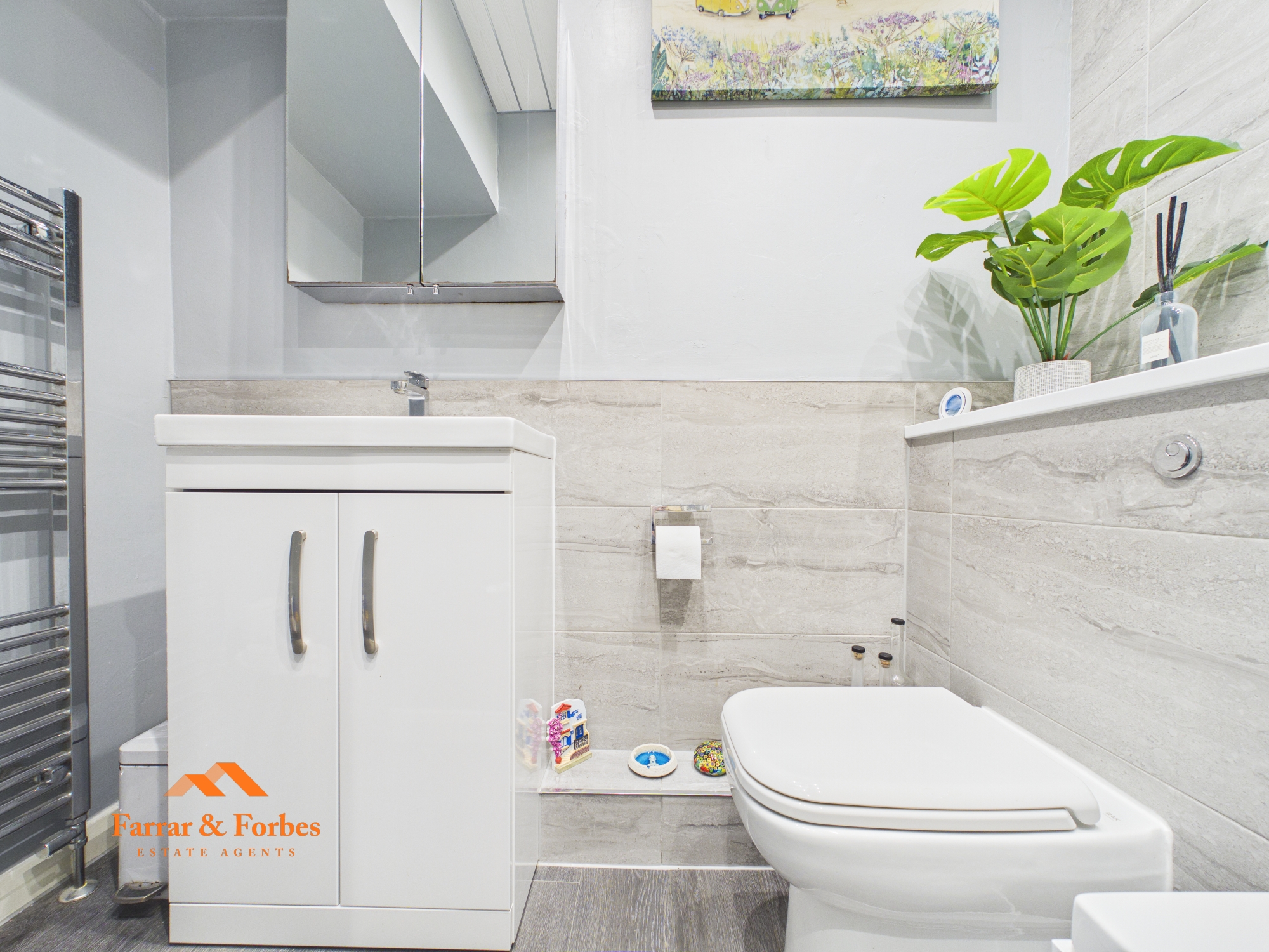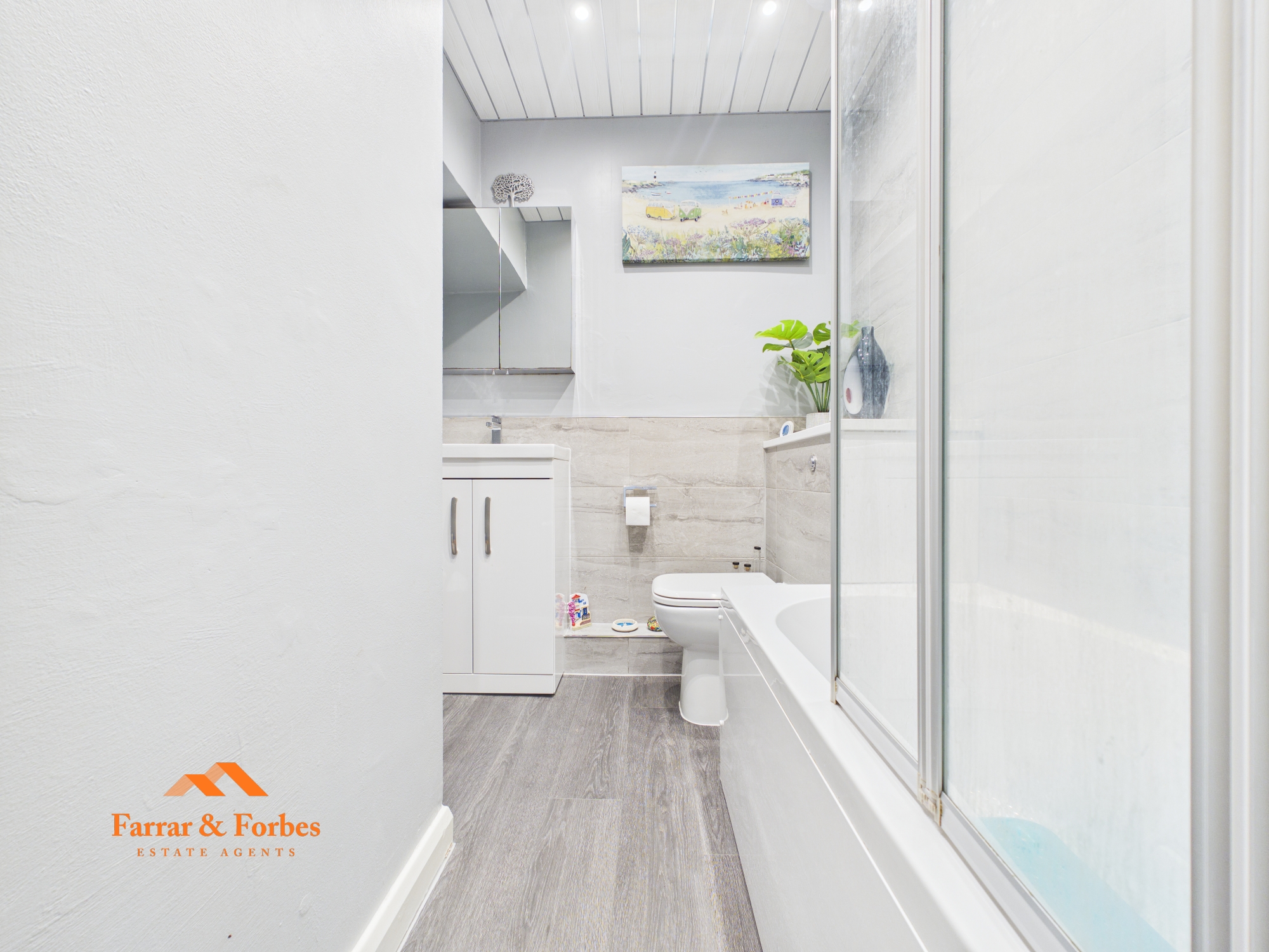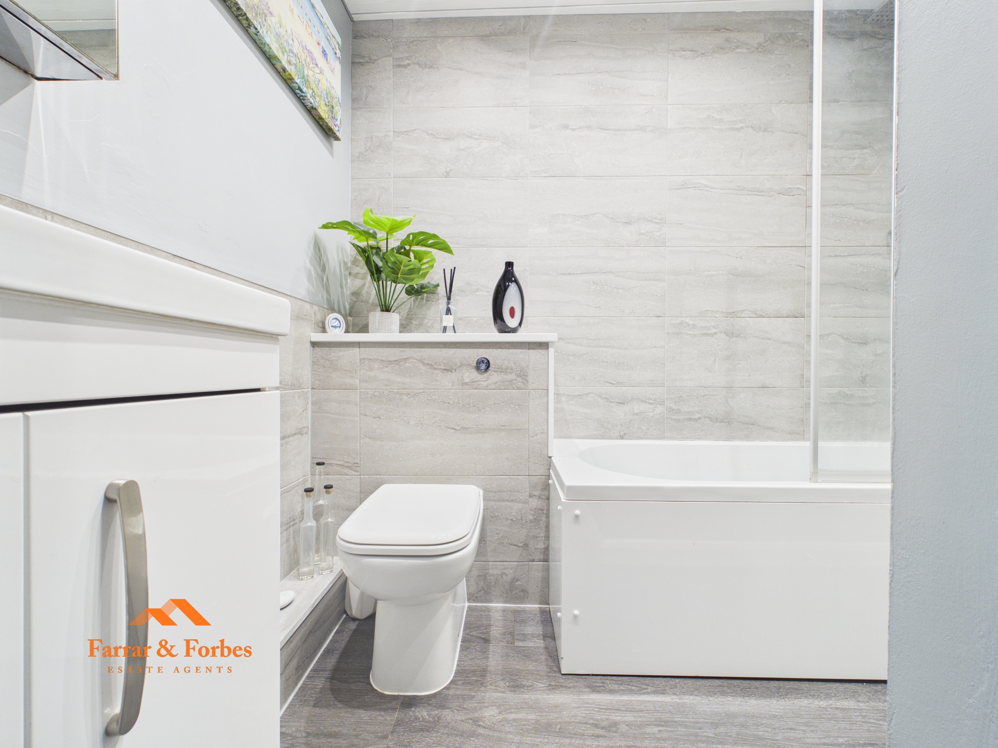To the first floor, there are two well-proportioned double bedrooms. The bathroom is centrally located over the stairs and comprises a low-level WC, a cabinet hand wash basin, and a panelled bath with overhead shower, complemented by a grey tiled splashback and glass shower screen.