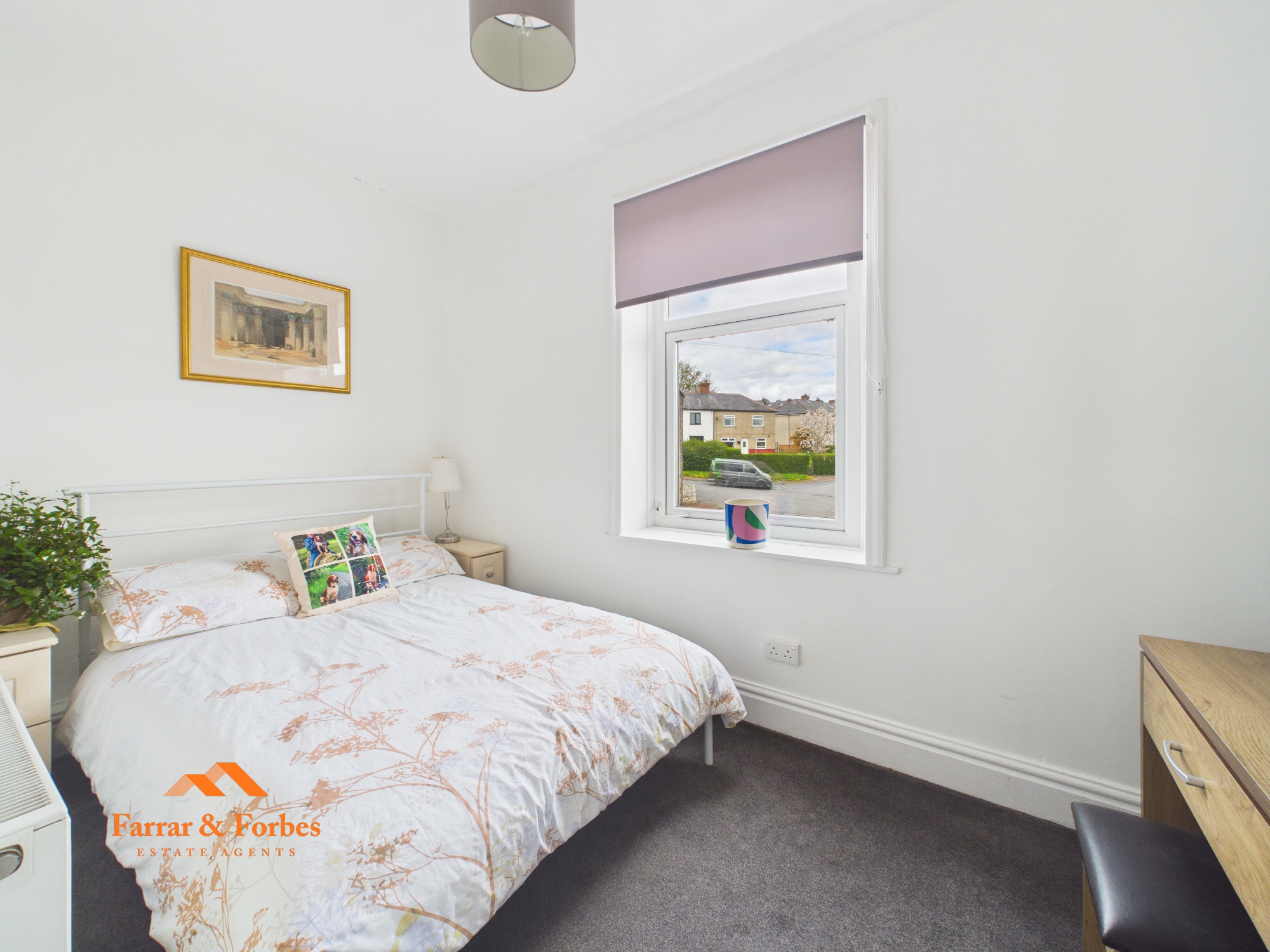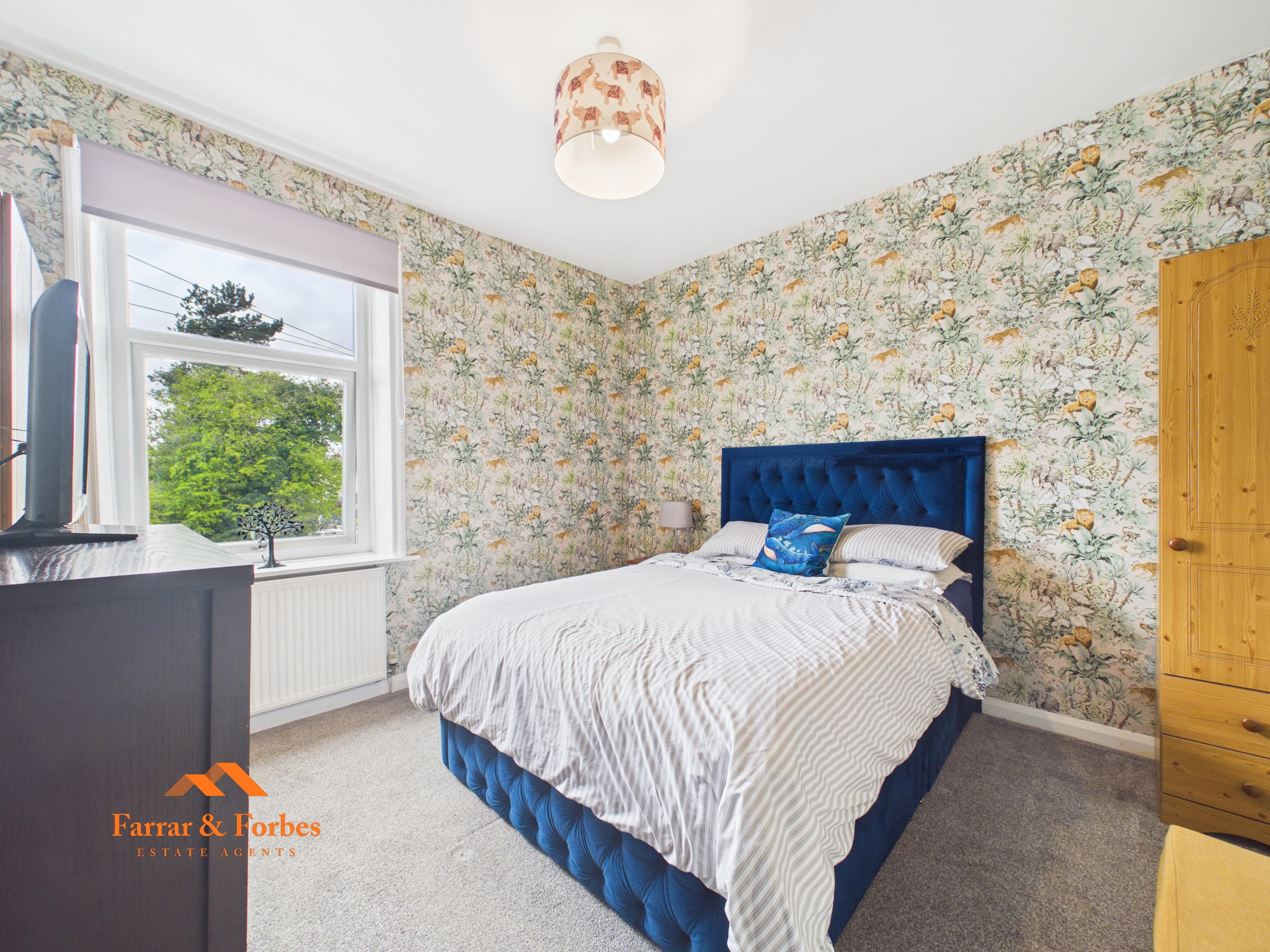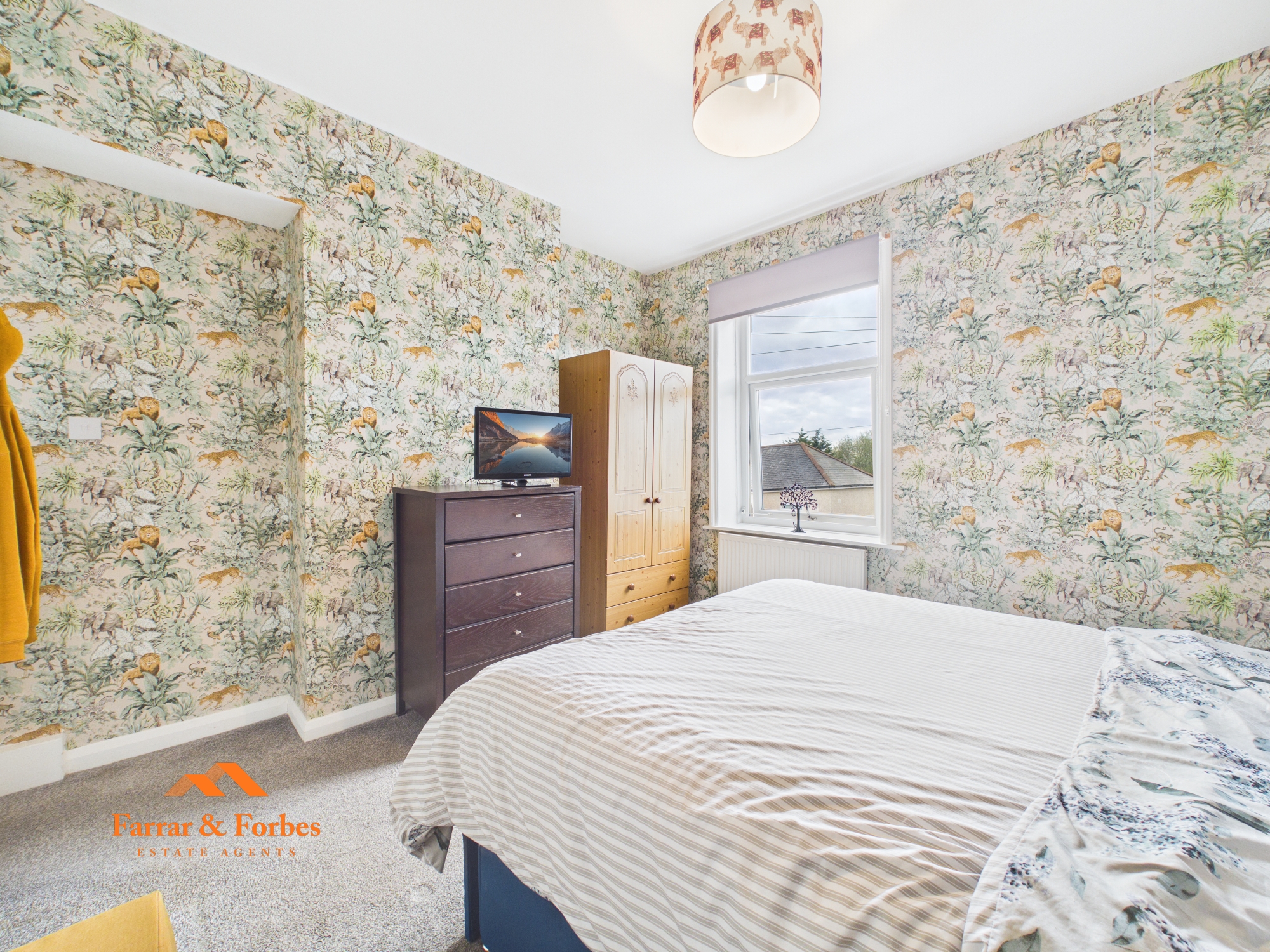 To the first floor, there are two well-proportioned double bedrooms. The bathroom is centrally located over the stairs and comprises a low-level WC, a cabinet hand wash basin, and a panelled bath with overhead shower, complemented by a grey tiled splashback and glass shower screen.