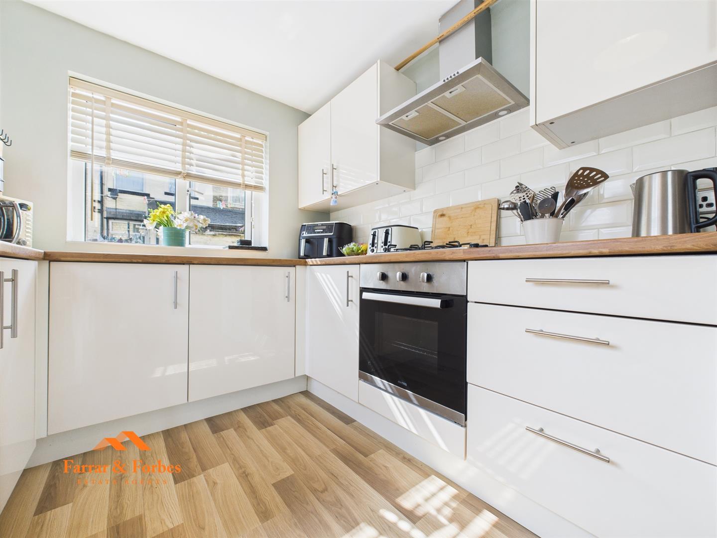 To the rear, the property has been extended to offer a generously sized kitchen, fitted with matching wall, base, and drawer units, contrasting worktops, and integrated appliances including an electric oven, hob, and extractor hood.
