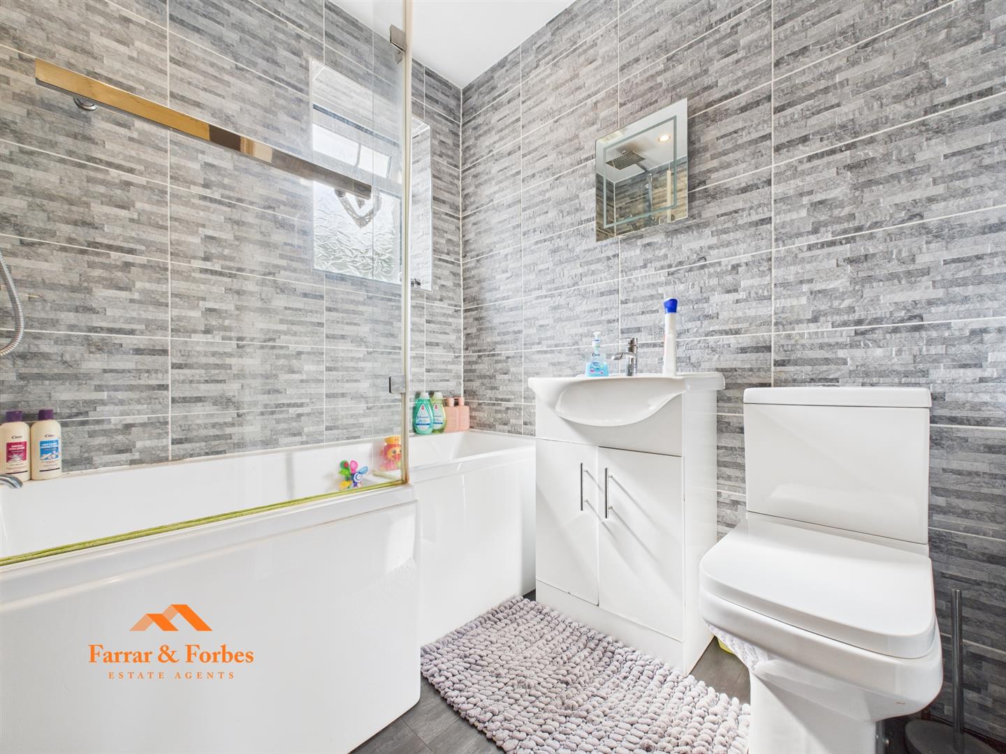 Upstairs, you’ll find two bedrooms — a double and a good-sized single — along with a modern three-piece bathroom suite featuring a low-level WC, cabinet hand wash basin, and a P-shaped panelled bath with an overhead shower and stylish grey tile splashback.