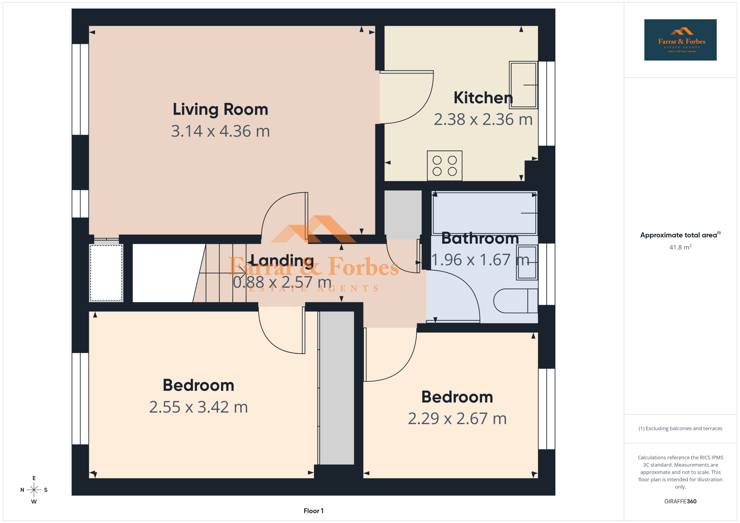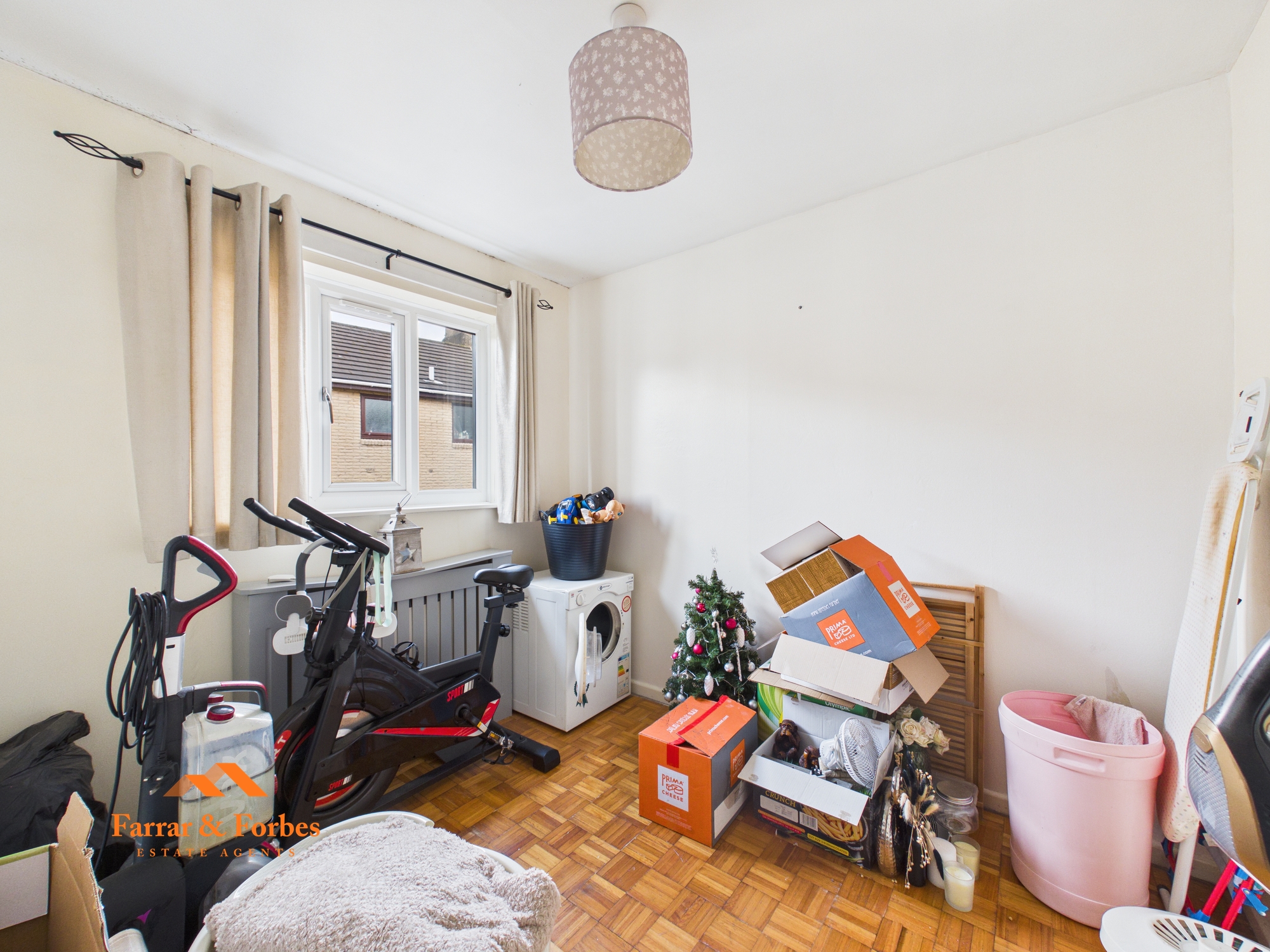 Accessed via a shared entrance with a garden forecourt, stairs lead to the first-floor accommodation. The layout comprises a spacious double bedroom to the front and a generously sized single bedroom to the rear, featuring attractive parquet flooring.