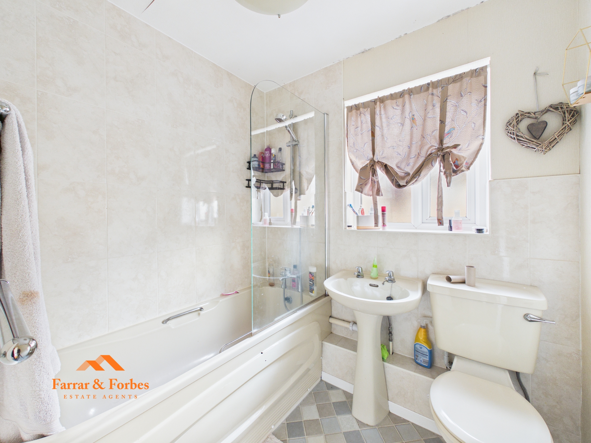 The bathroom is fitted with a three-piece suite in a sage finish, including a low-level WC, pedestal wash basin, and a panelled bath with overhead shower.