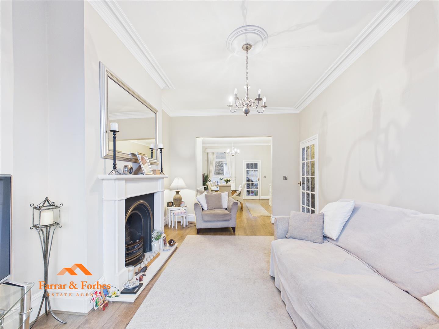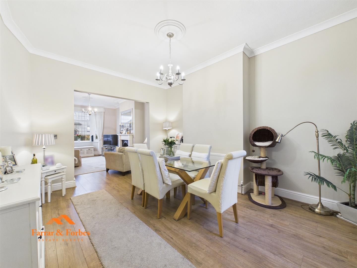 To the front of the property is a garden forecourt leading into a welcoming vestibule and hallway, with a staircase rising to the first floor. The lounge features a stunning bay window and a gas fire with an attractive surround, creating a warm focal point. To the rear, the dining room flows seamlessly from the lounge in an open-plan layout.