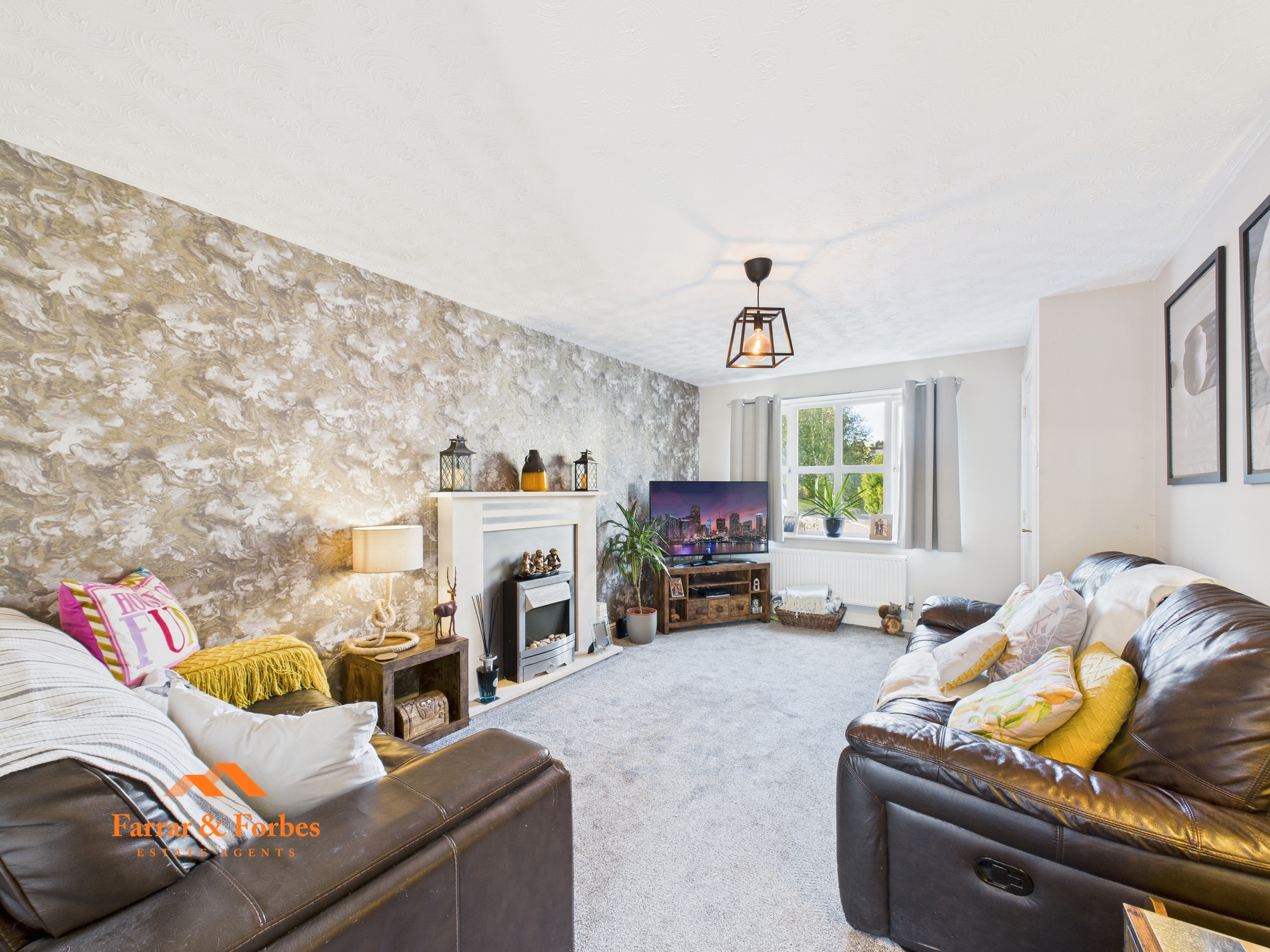 On entering, a welcoming vestibule with staircase to the first floor leads into the spacious lounge. This light-filled room features a striking electric fire with wood surround, providing a warm focal point for the space. To the rear, the open-plan kitchen/diner is arranged in a practical horseshoe design, fitted with a range of matching wall, base, and drawer units complemented by contrasting work surfaces. Integrated appliances include a gas hob, electric oven, and extractor hood. Sliding patio doors open directly onto the rear garden, creating seamless indoor-outdoor living.