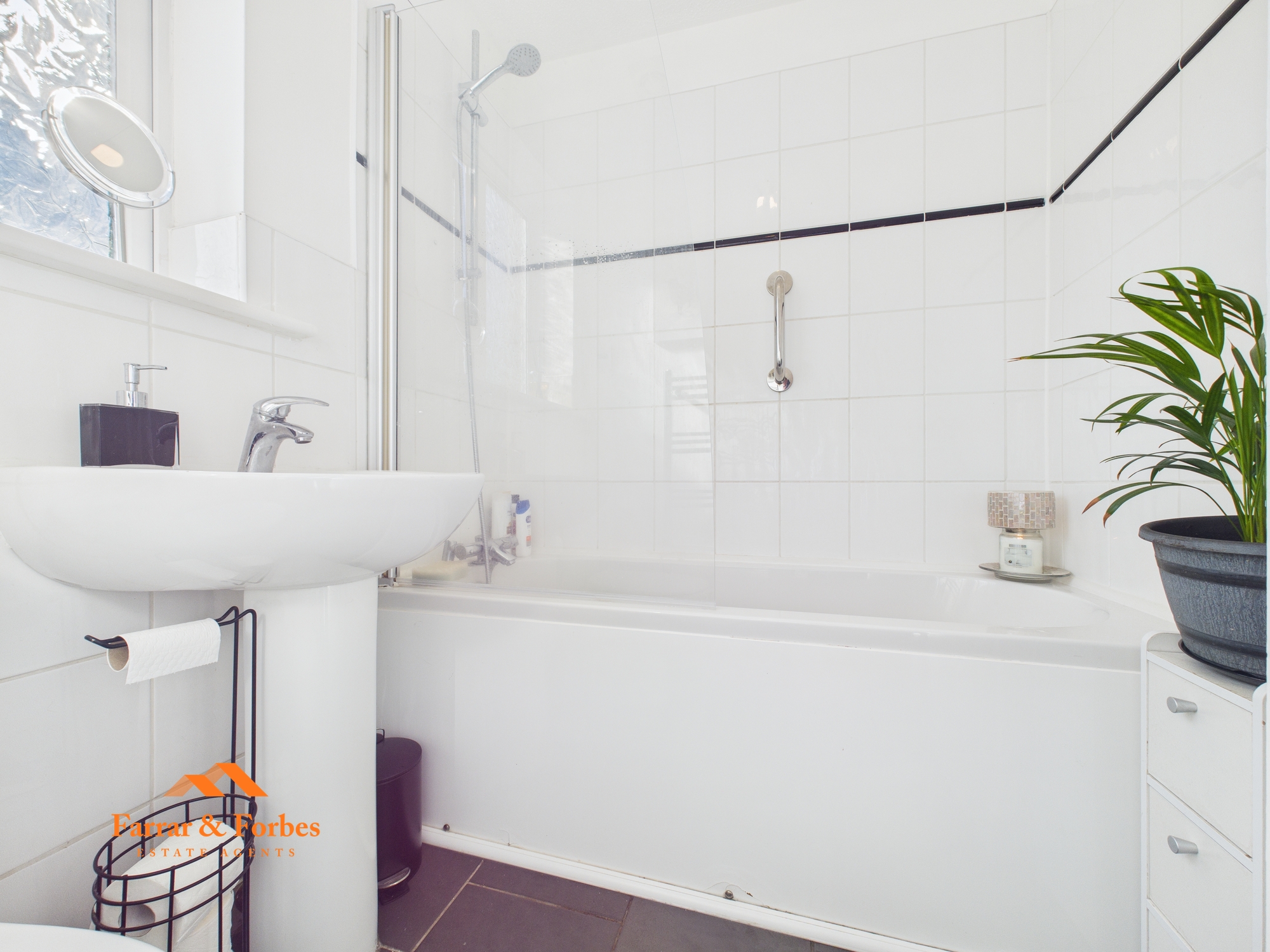 Upstairs, the accommodation comprises two generously sized single bedrooms and a large double master bedroom, which includes a built-in storage cupboard currently used as a wardrobe. The family bathroom is fitted with a modern three-piece suite: low-level WC, pedestal hand wash basin, and a panelled bath with overhead shower and glass screen.