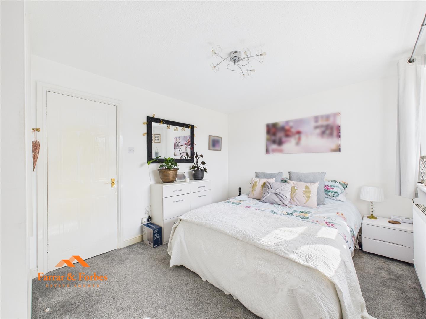 Upstairs, the accommodation comprises two generously sized single bedrooms and a large double master bedroom, which includes a built-in storage cupboard currently used as a wardrobe. The family bathroom is fitted with a modern three-piece suite: low-level WC, pedestal hand wash basin, and a panelled bath with overhead shower and glass screen.
