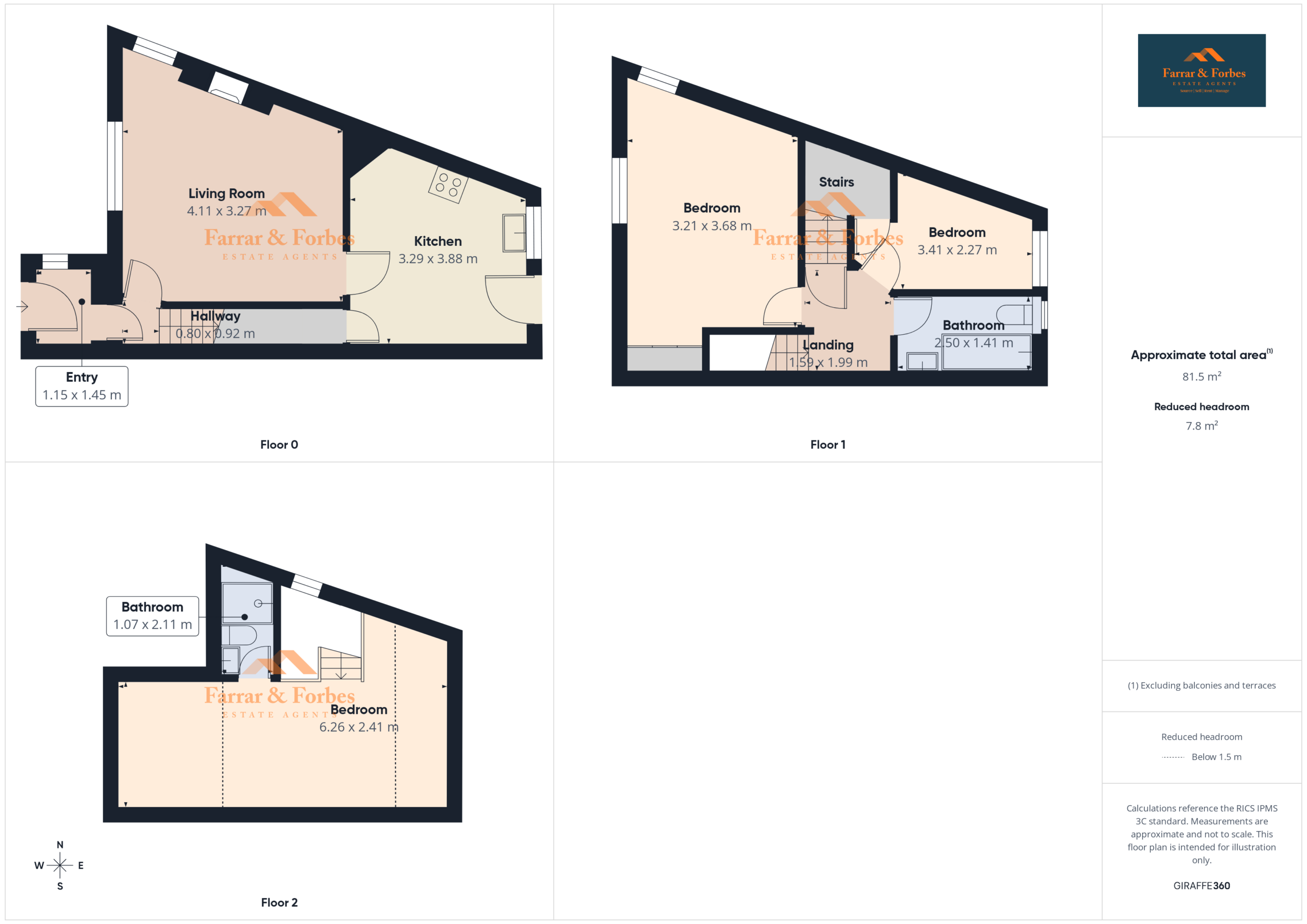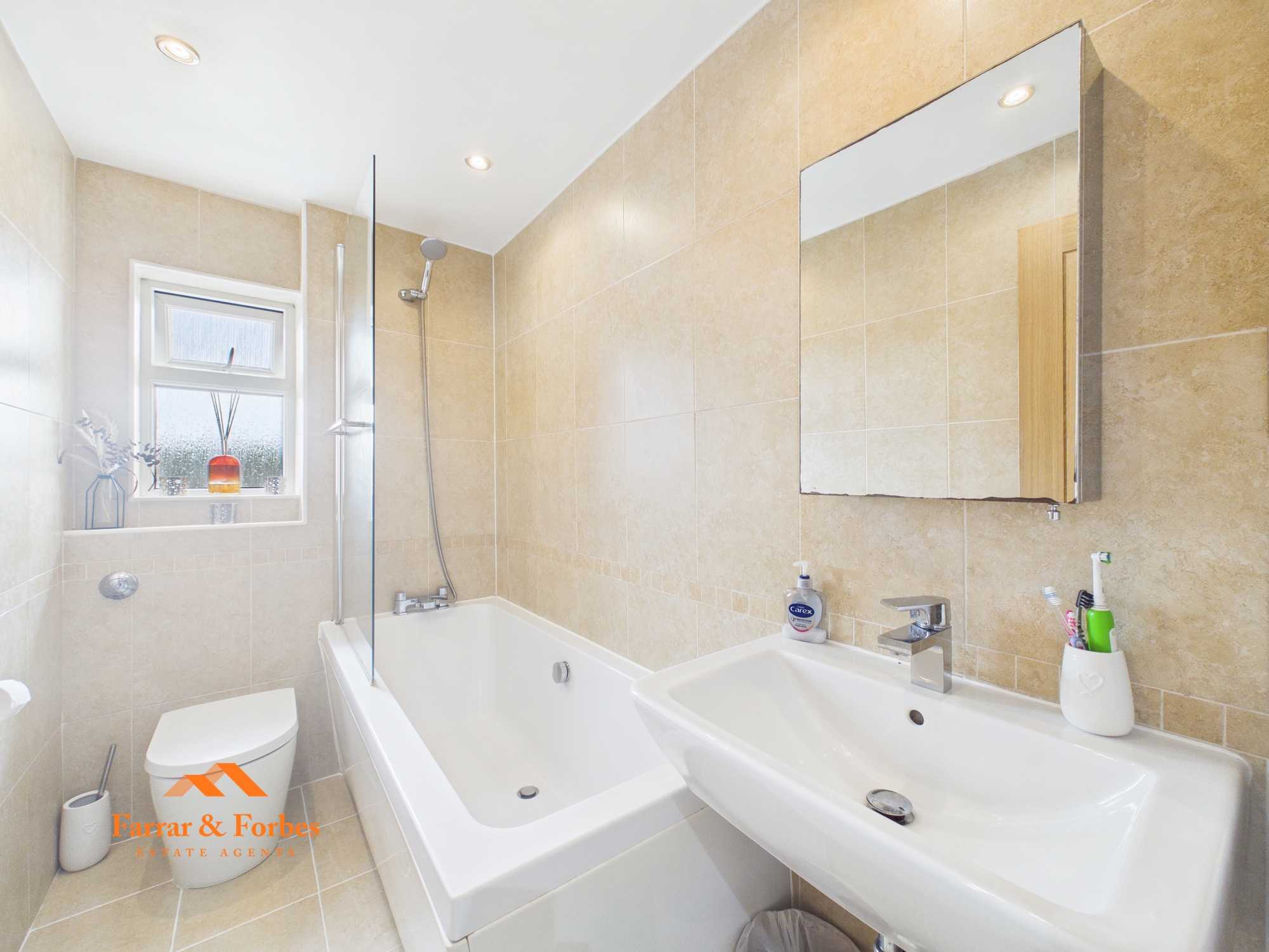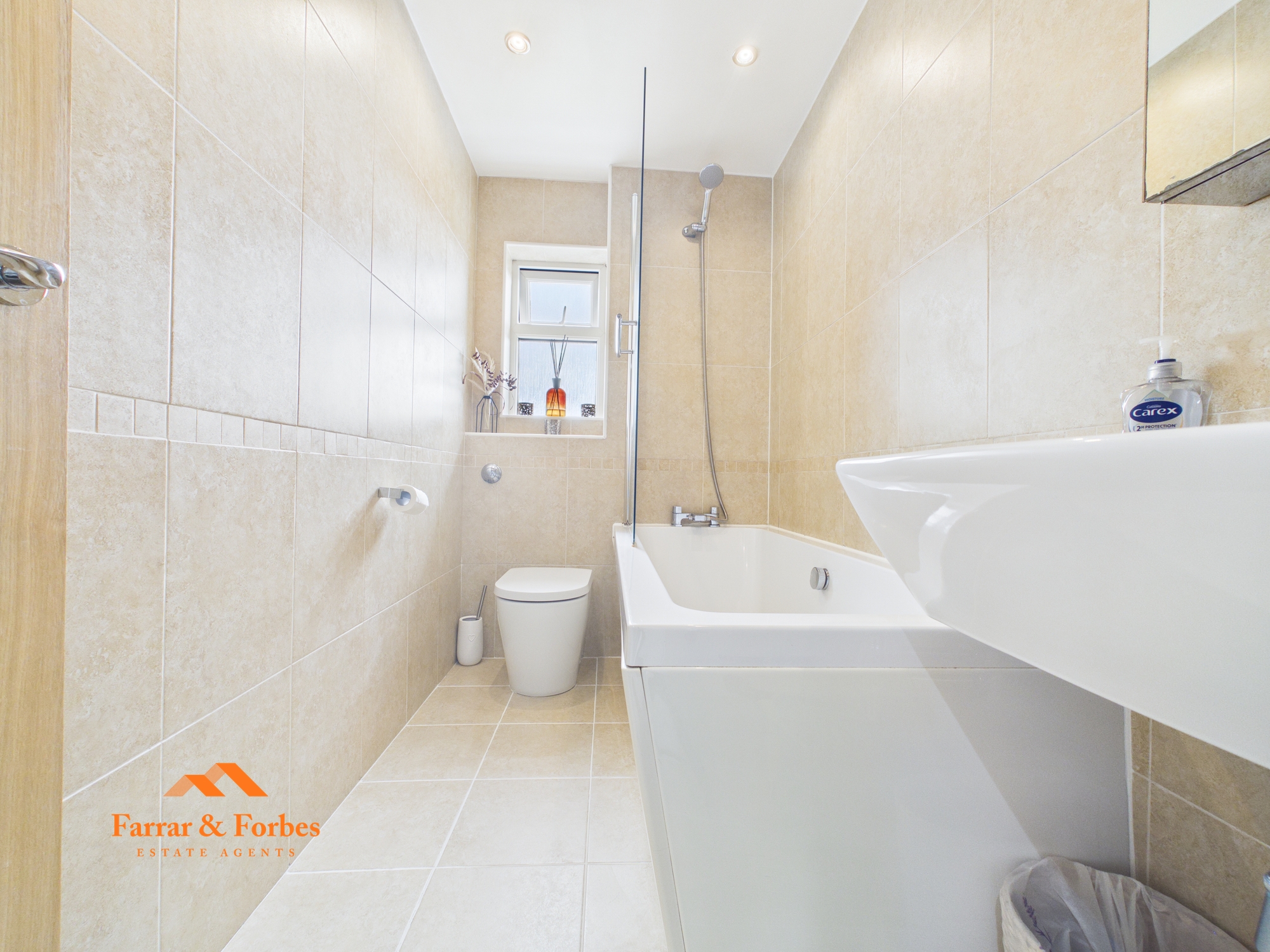 On the first floor, the main bedroom includes fitted wardrobes. The third bedroom is a generous single room and features a cupboard housing the combination boiler. The family bathroom comprises a three-piece suite including a low-level WC, pedestal wash basin, and a panelled bath with overhead shower and tiled splashback.