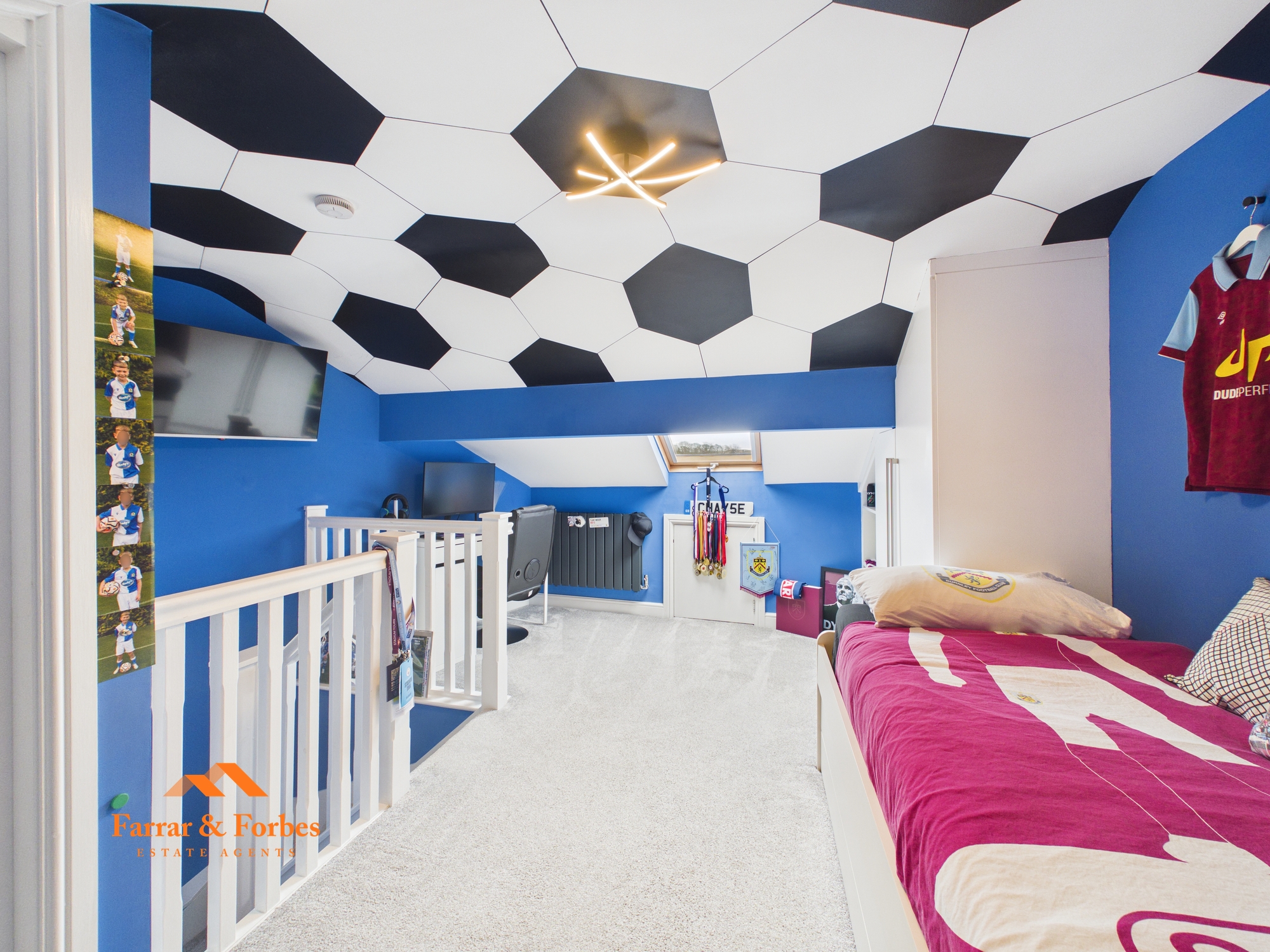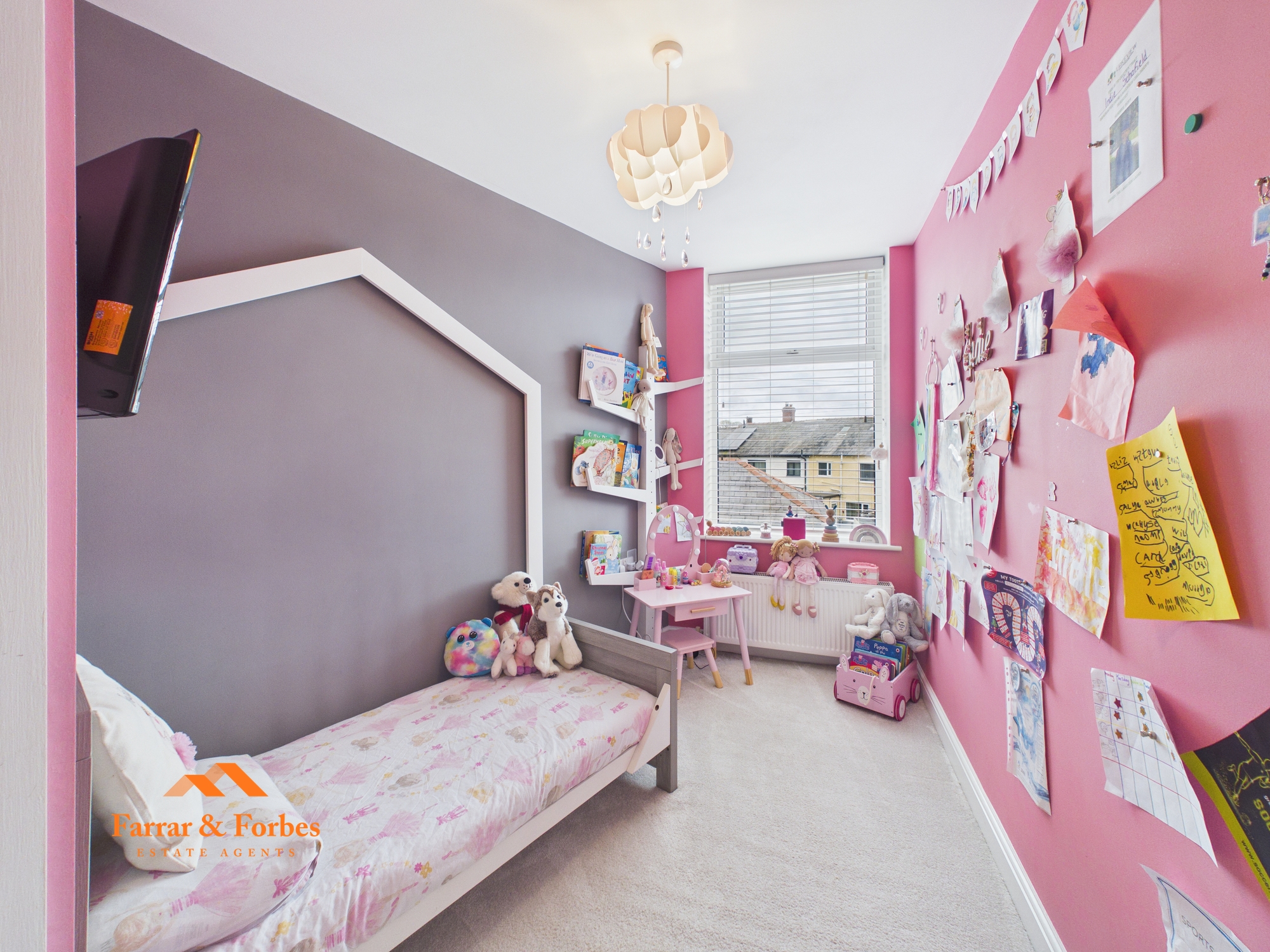 The loft has been converted into a bedroom, offering a unique and spacious additional living area. A quirky feature throughout the bedrooms is magnetic plaster, allowing children’s pictures and decorations to be displayed on the walls using magnets without causing damage. The attic bedroom spans the full length and width of the house, includes a Velux window, and benefits from an ensuite with a low-level WC, floating wash basin, and walk-in shower, finished with tiled floors and walls.