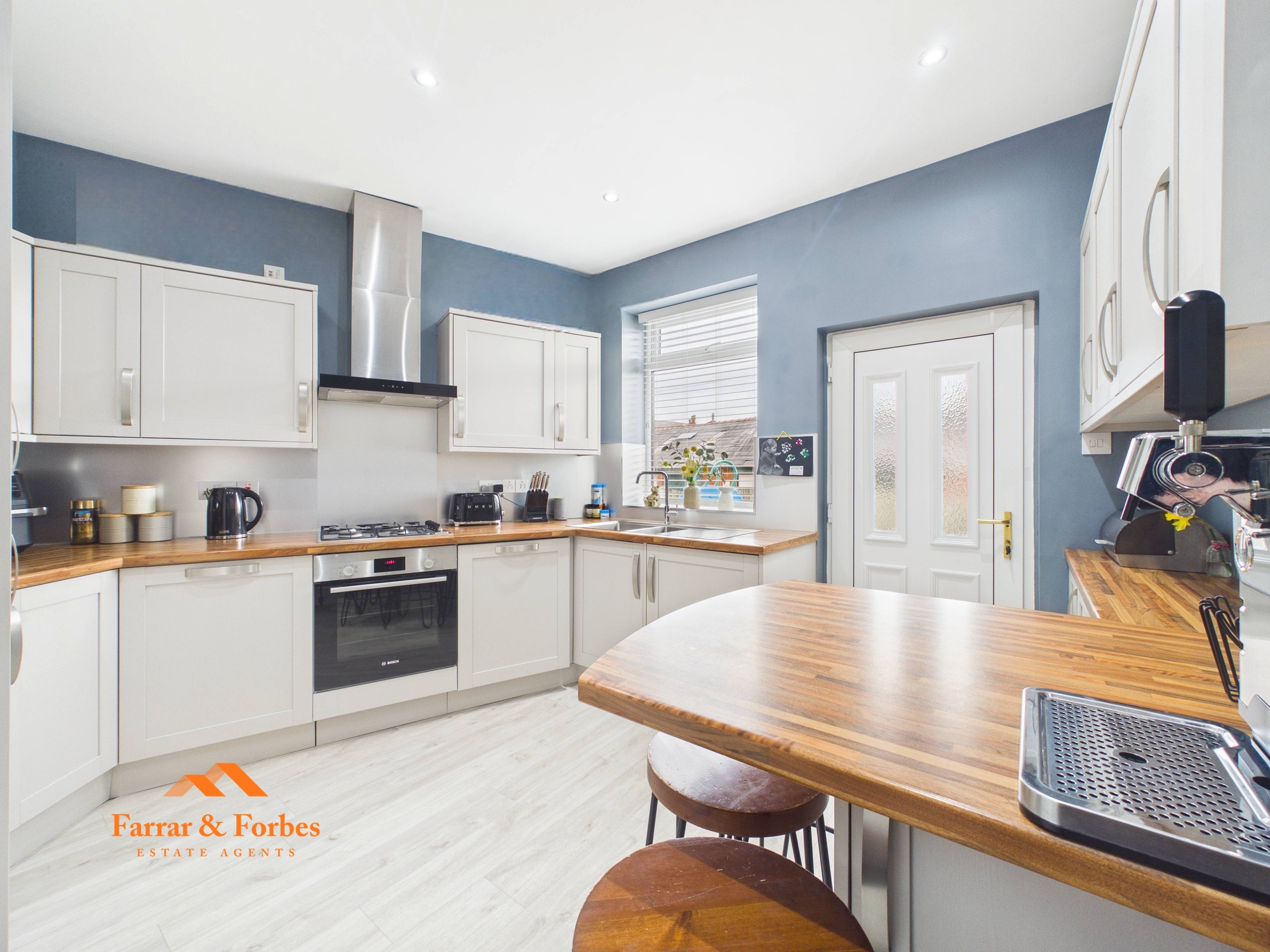 To the rear of the property is a fitted kitchen arranged in a horseshoe layout, with contrasting work surfaces and a range of appliances including an electric oven, gas hob, fridge/freezer, and dishwasher. There is also a breakfast area, providing a space for family dining, along with a useful understairs storage cupboard.
