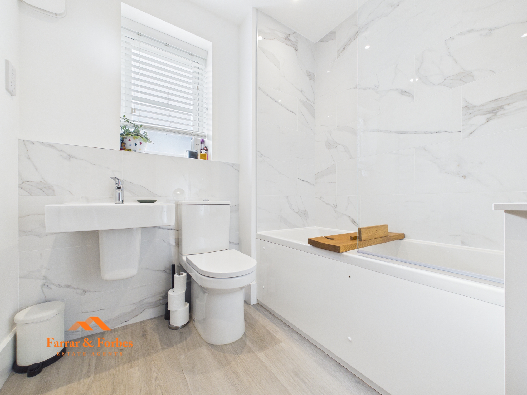 To the first floor, the property offers four bedrooms, including three doubles and a generously sized single. The main bedroom benefits from fitted wardrobes and a modern three-piece en-suite comprising a low-level WC, pedestal hand wash basin, and a walk-in shower with rainfall shower. The family bathroom is finished to a stylish standard and includes a low-level WC, pedestal hand wash basin, and a panelled bath with overhead shower and contemporary tiled splashback.
