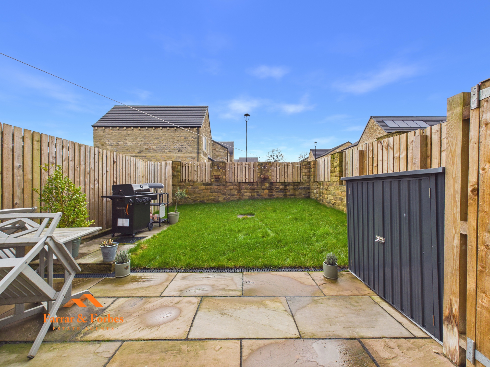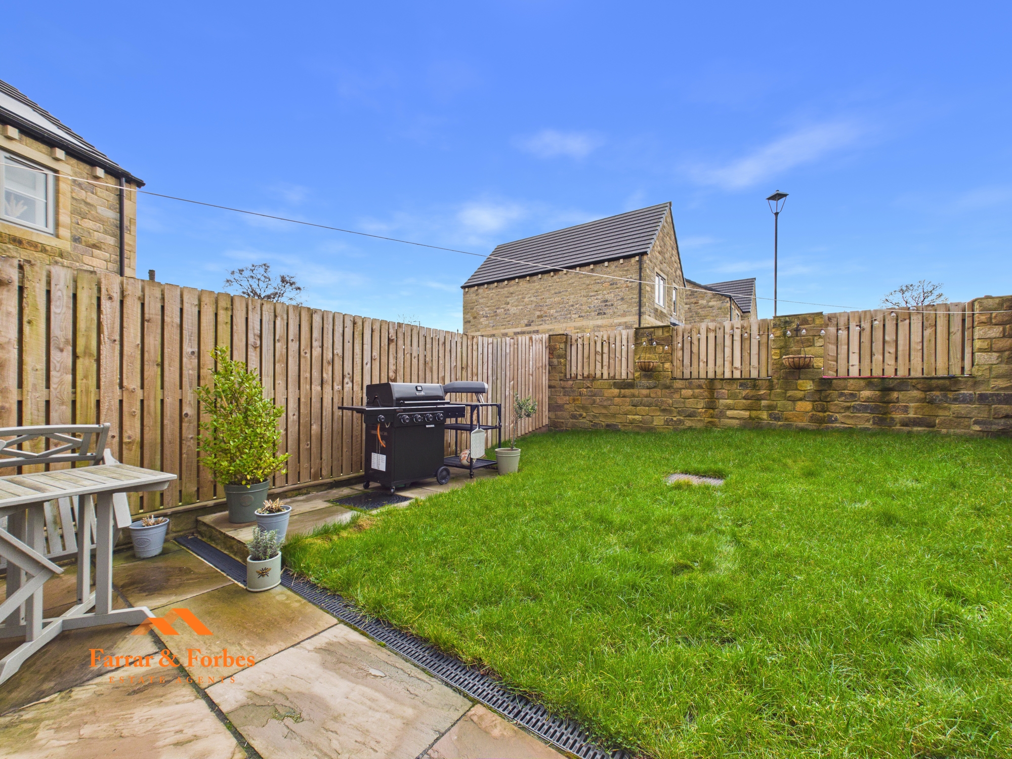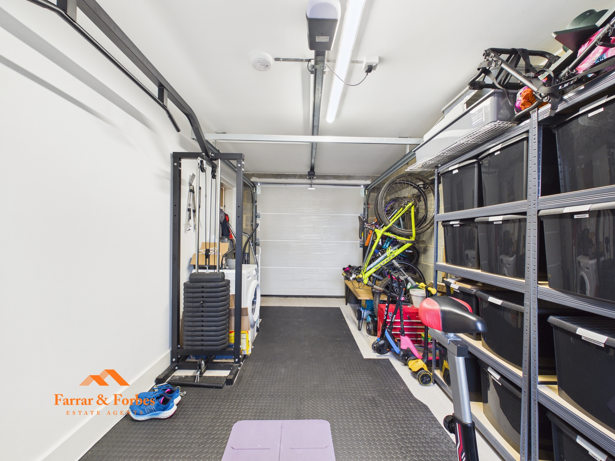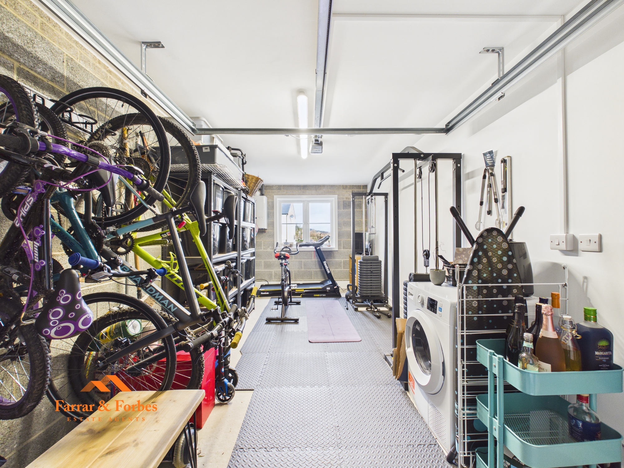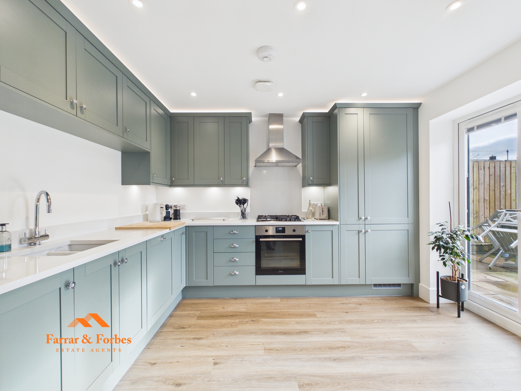 The contemporary L-shaped kitchen is fitted with matching wall, base and drawer units, complemented by quartz worktops and a sunken sink. Integrated appliances include an oven, fridge, freezer and dishwasher, and there is ample space for a dining table. Patio doors open onto the rear garden, creating a seamless indoor–outdoor flow ideal for family living and entertaining. The garden features a patio seating area and a lawned space. The garage, accessed internally from the kitchen, is currently utilised as a home gym and benefits from plumbing for a washing machine, an electric roller door, and access to the rear double block-paved driveway.