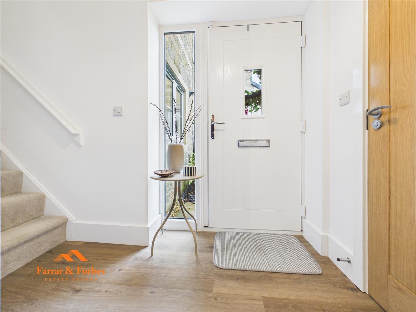 Approached via stone flagging to the front, the home enjoys an elevated setting that enhances its outlook and kerb appeal. The welcoming entrance hall leads to a convenient downstairs WC with hand wash basin. The lounge is generously proportioned, providing an excellent space for relaxing and entertaining, while oak internal doors throughout add warmth and a premium finish.
