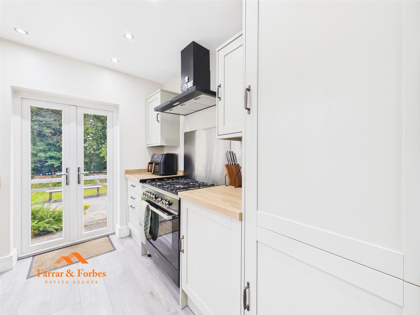 To the rear, the extended kitchen is the standout feature — fitted with stylish sage green wall, base and drawer units, and a five-ring range cooker. The extension includes a utility area and patio doors that open onto a decked area and the generous rear garden, perfect for outdoor dining and family relaxation.