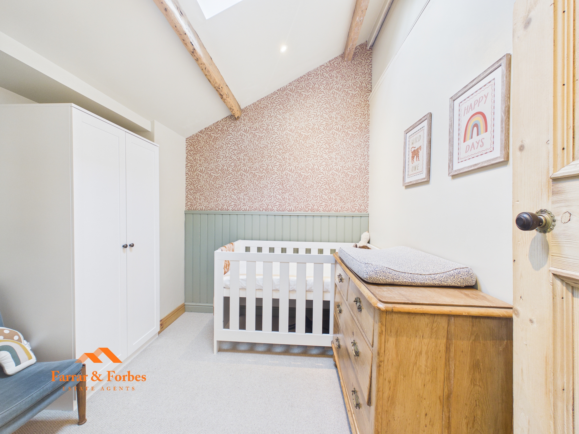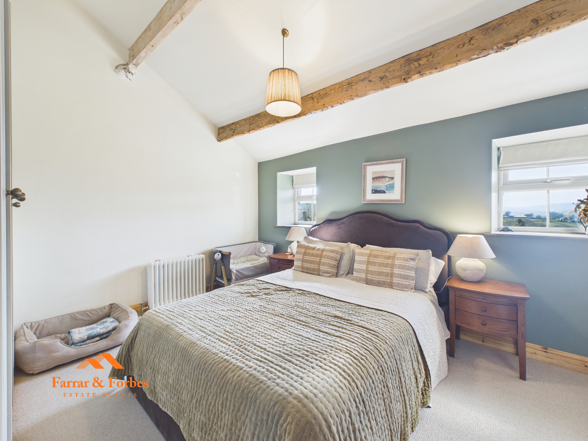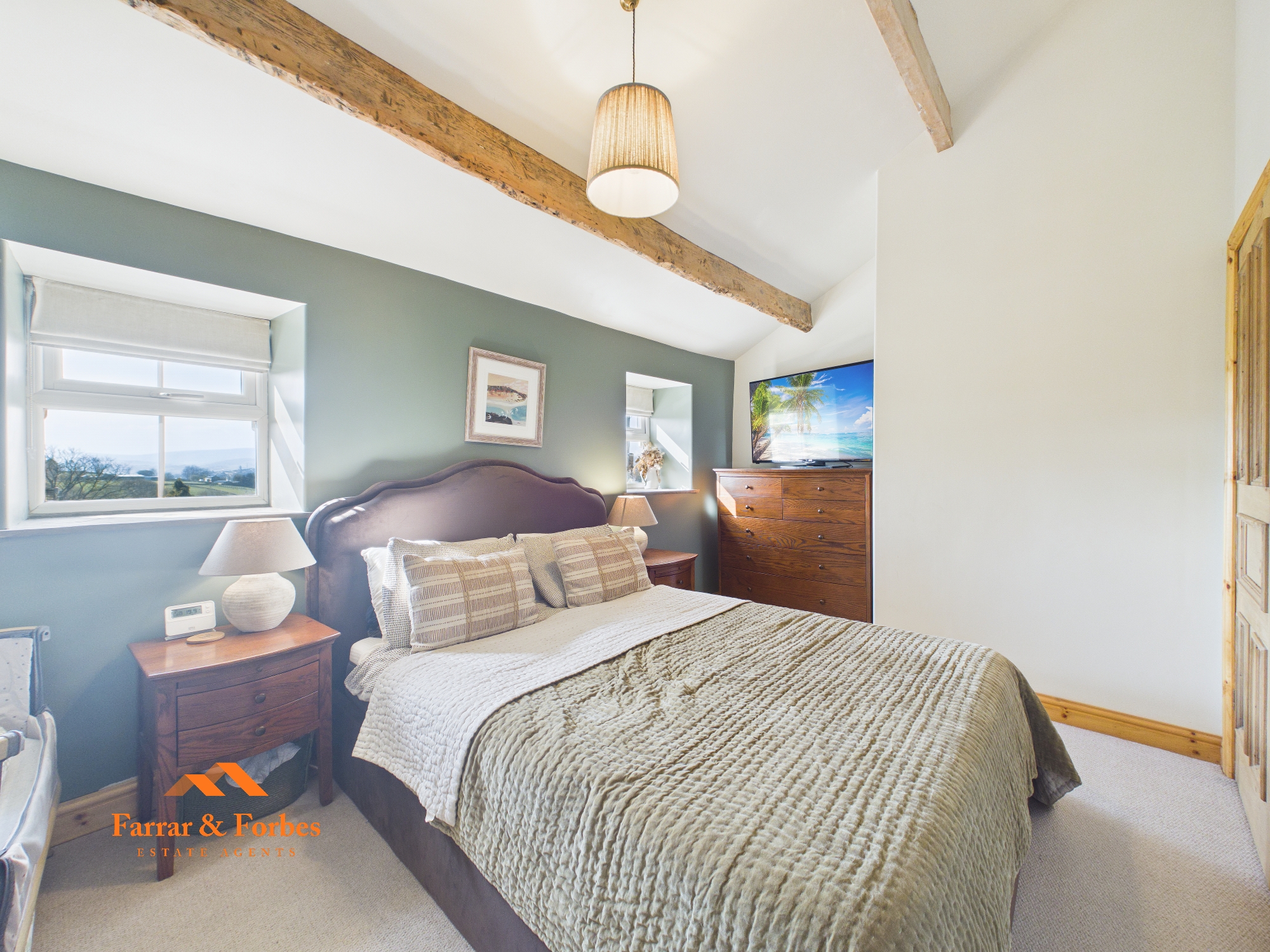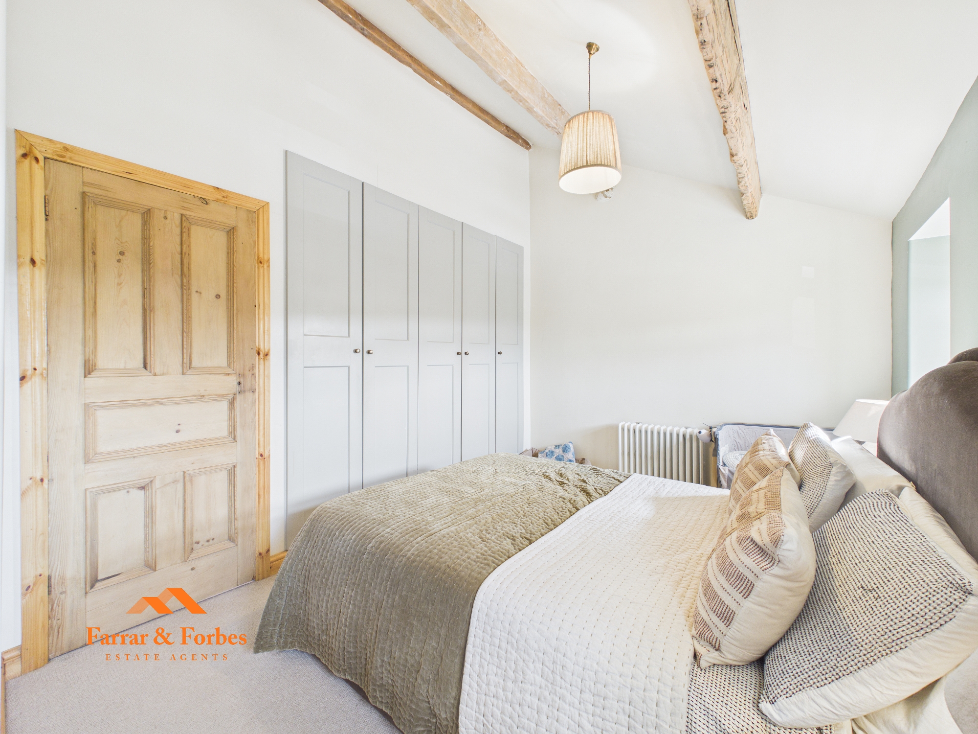 Upstairs, the property offers a generous double bedroom with a vaulted ceiling, exposed original beams, and fitted wardrobes. There are two further well-proportioned single bedrooms, with the central bedroom also benefiting from a vaulted ceiling and a remote-controlled solar blind, allowing natural light to flood the landing.
