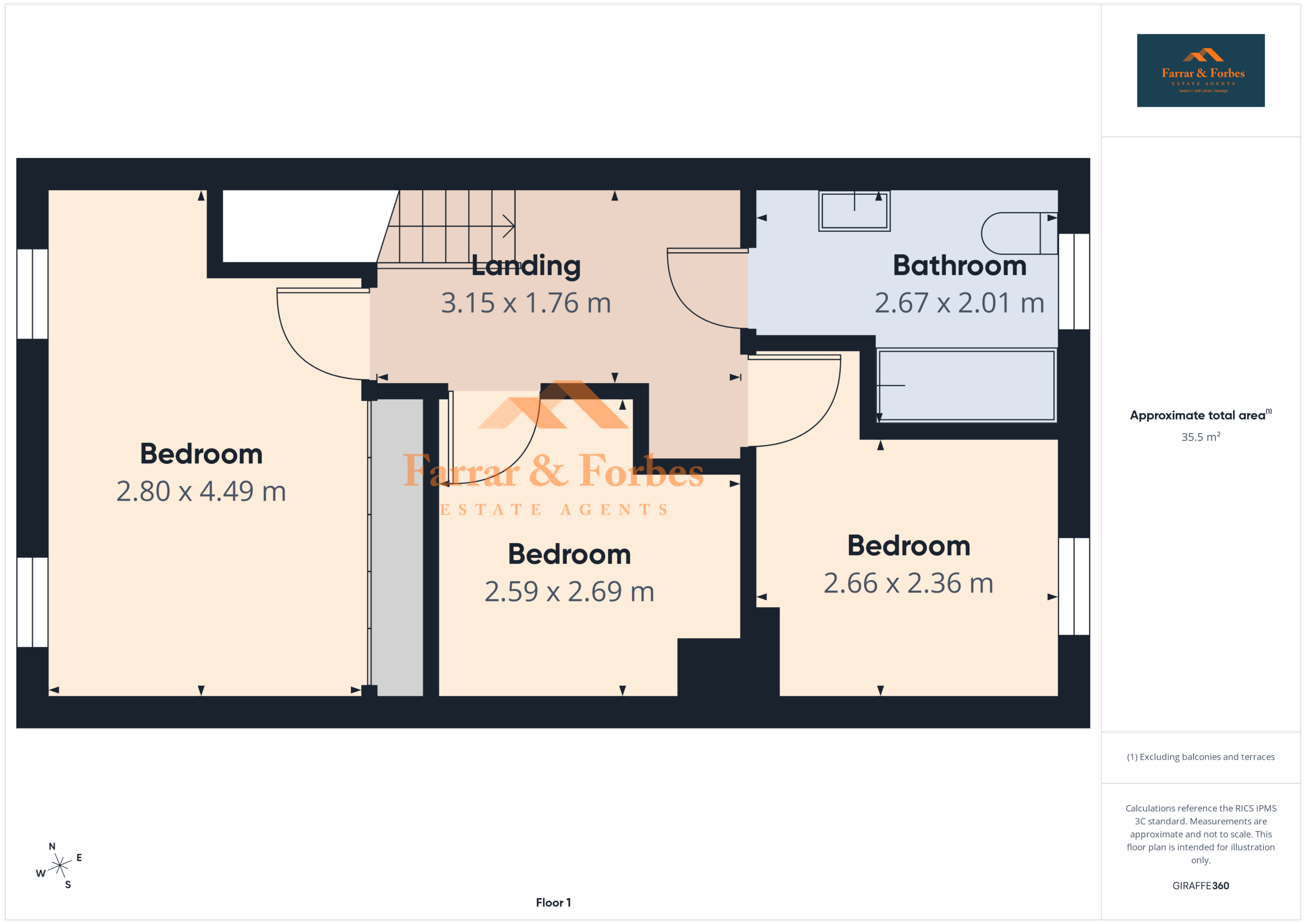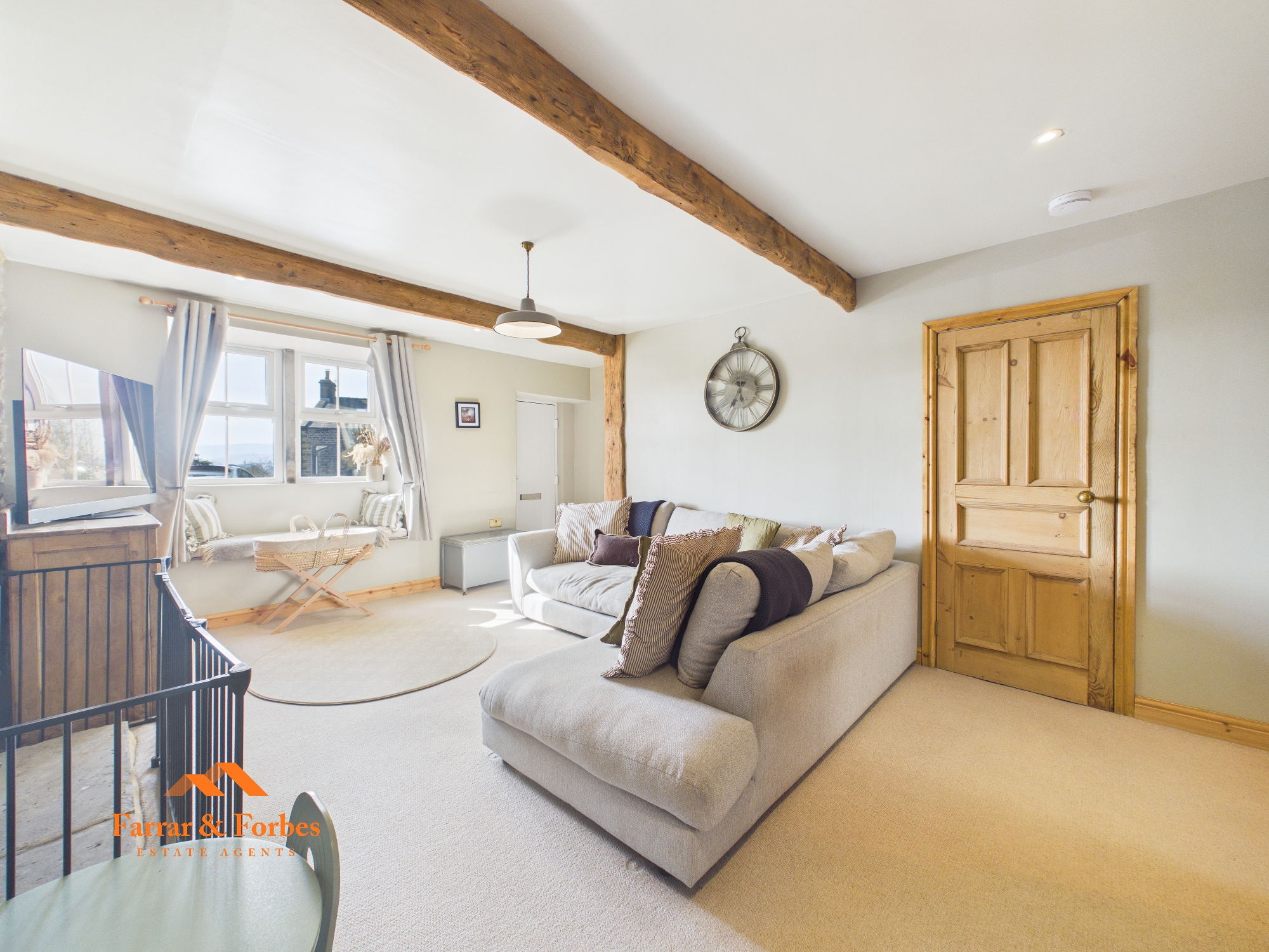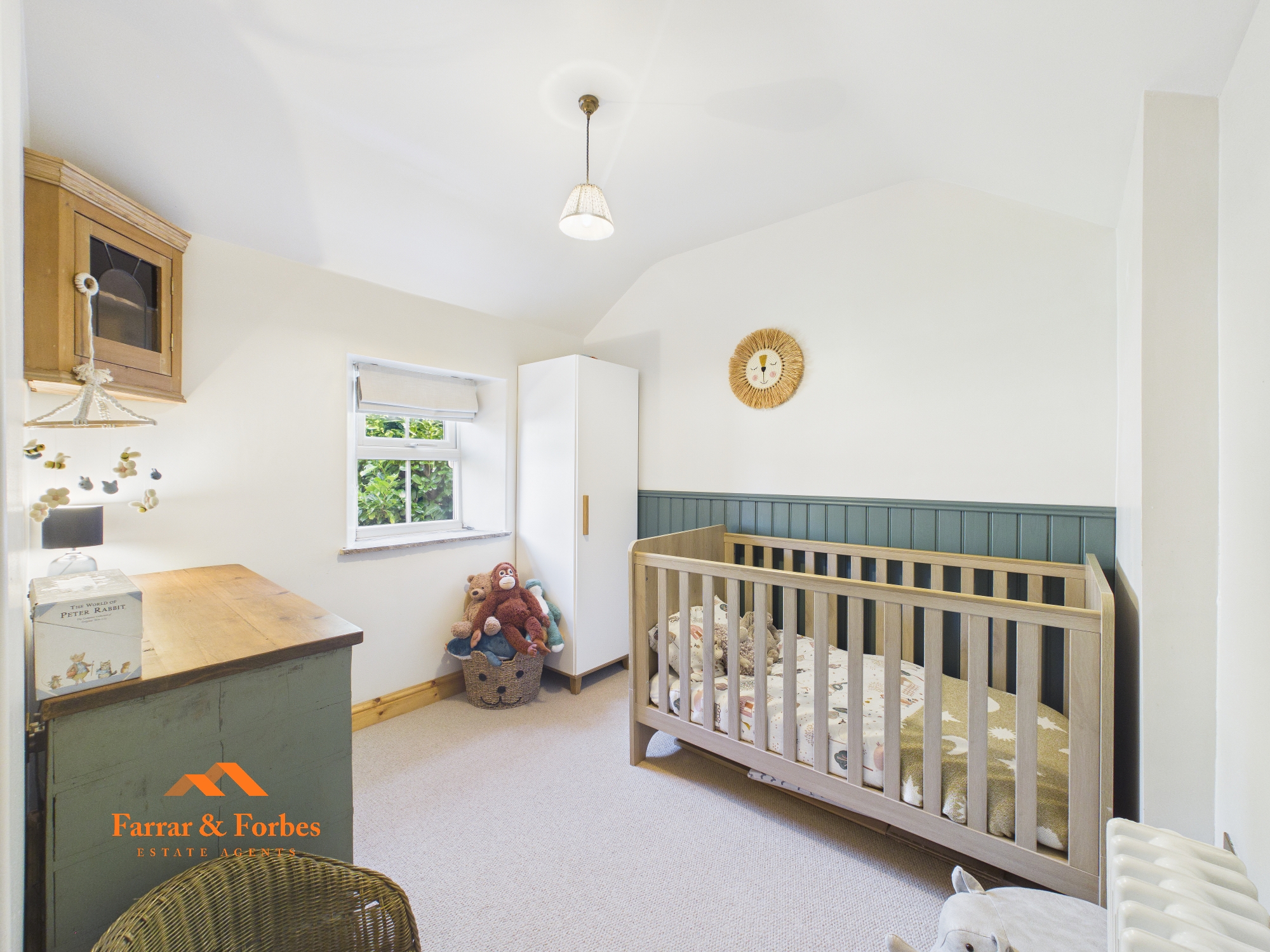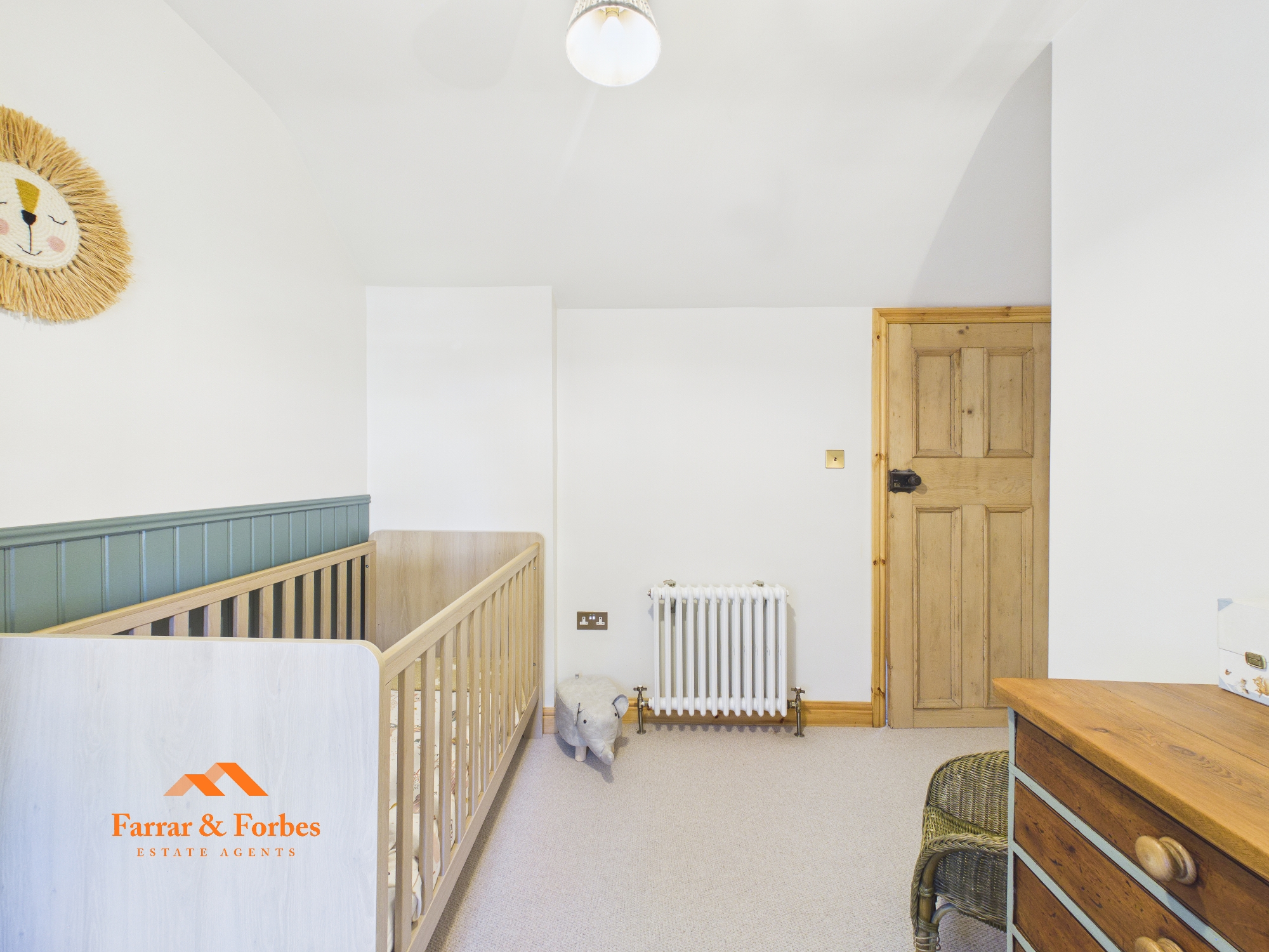 Upstairs, the property offers a generous double bedroom with a vaulted ceiling, exposed original beams, and fitted wardrobes. There are two further well-proportioned single bedrooms, with the central bedroom also benefiting from a vaulted ceiling and a remote-controlled solar blind, allowing natural light to flood the landing.