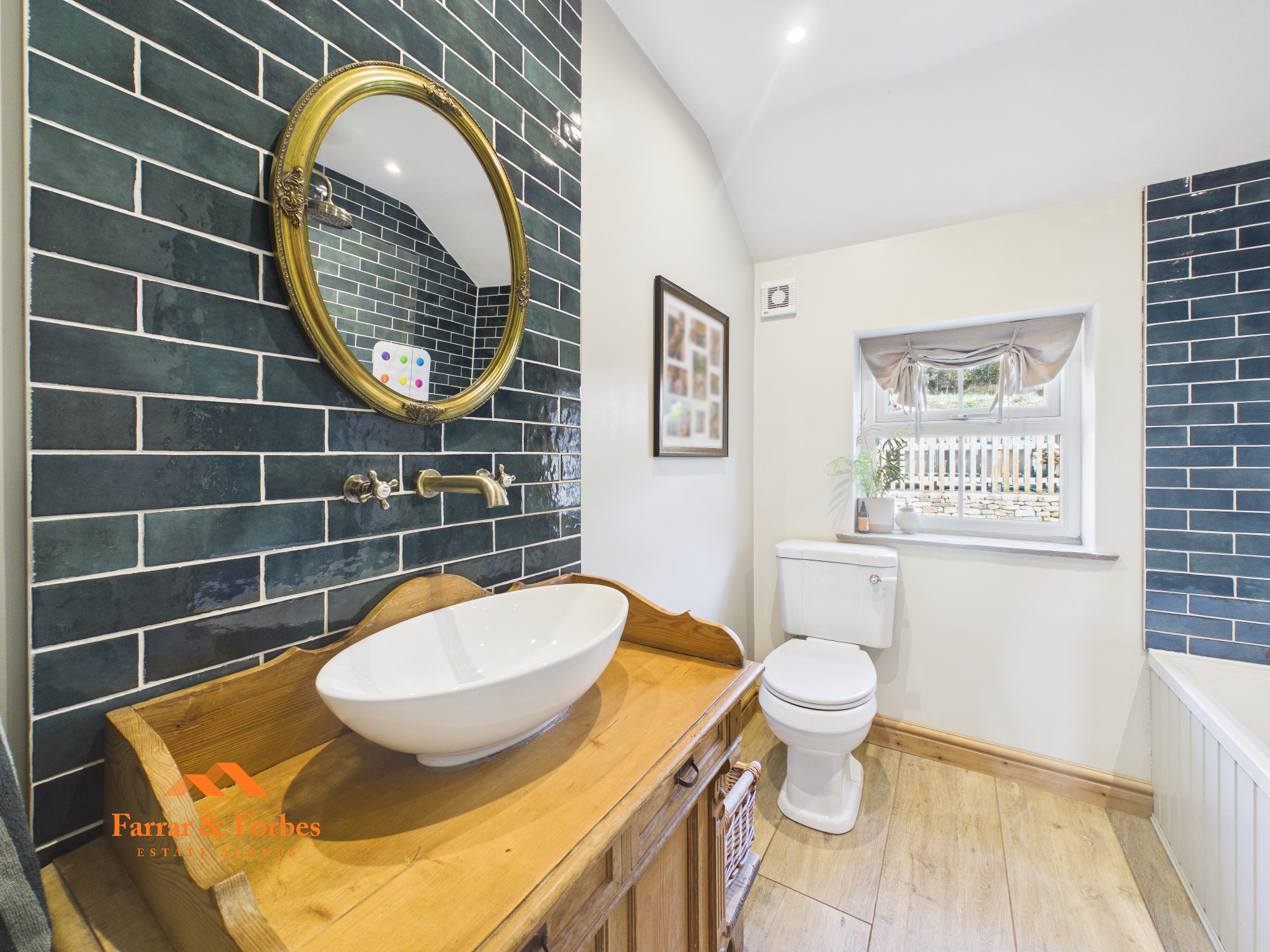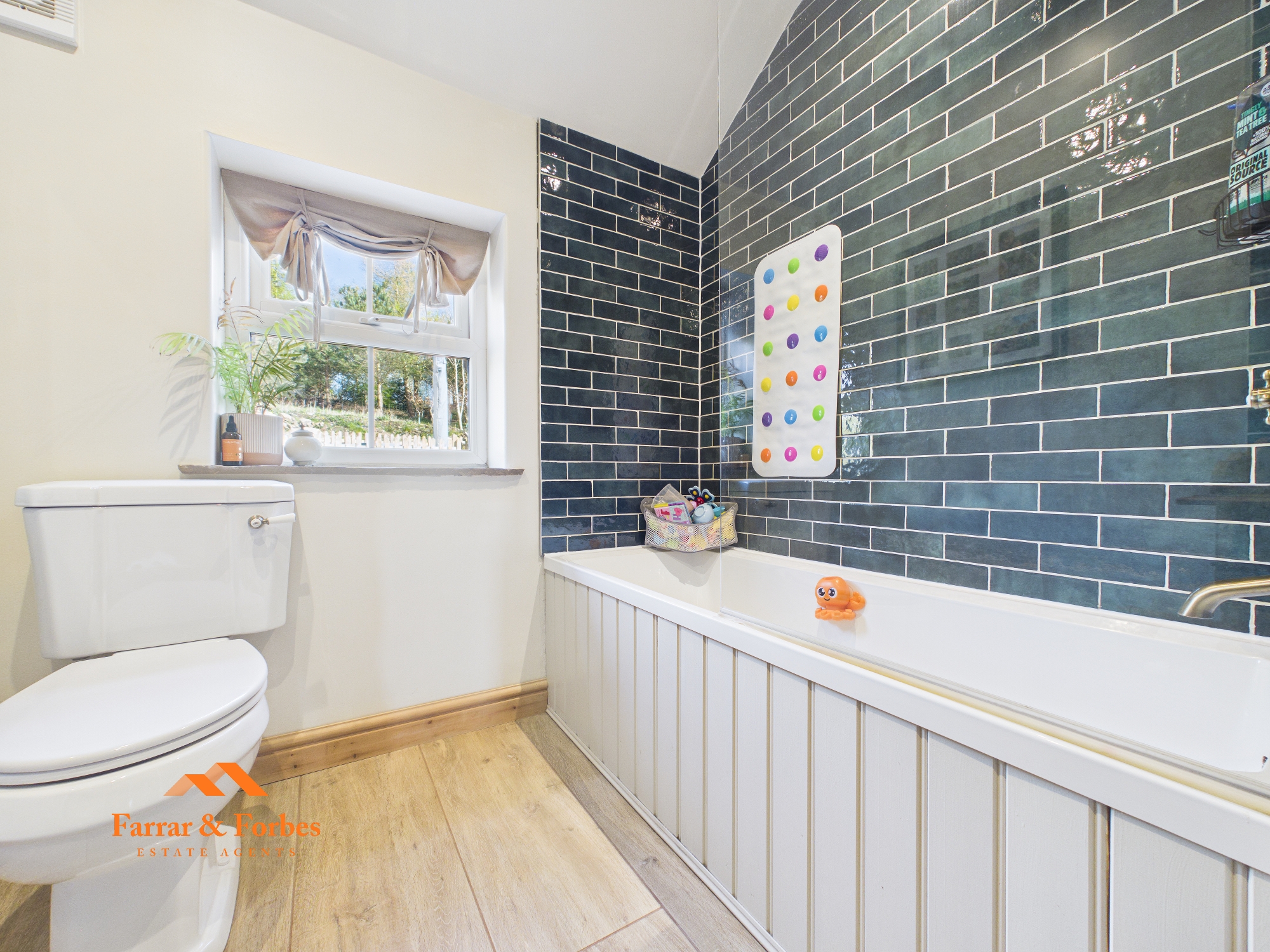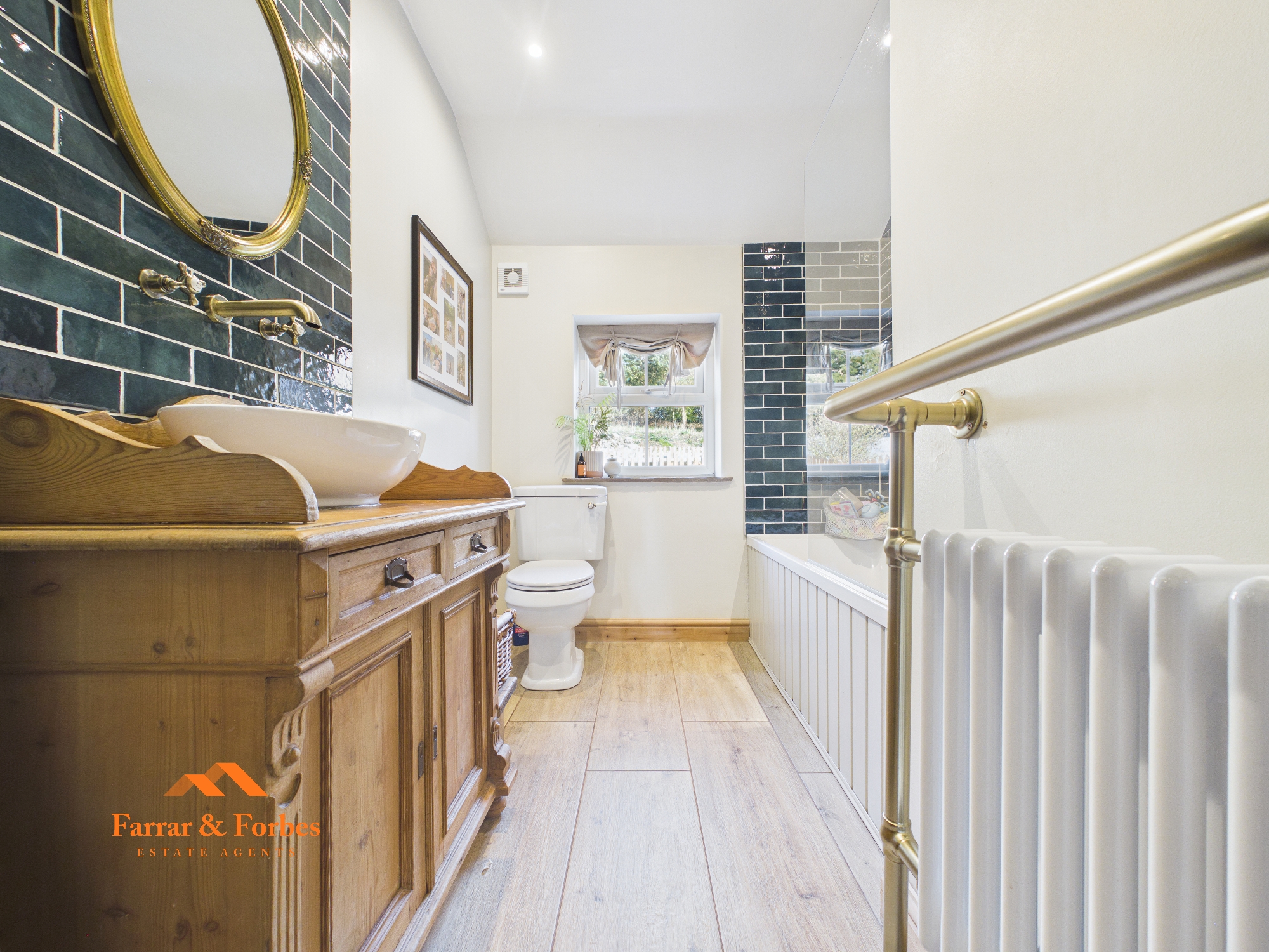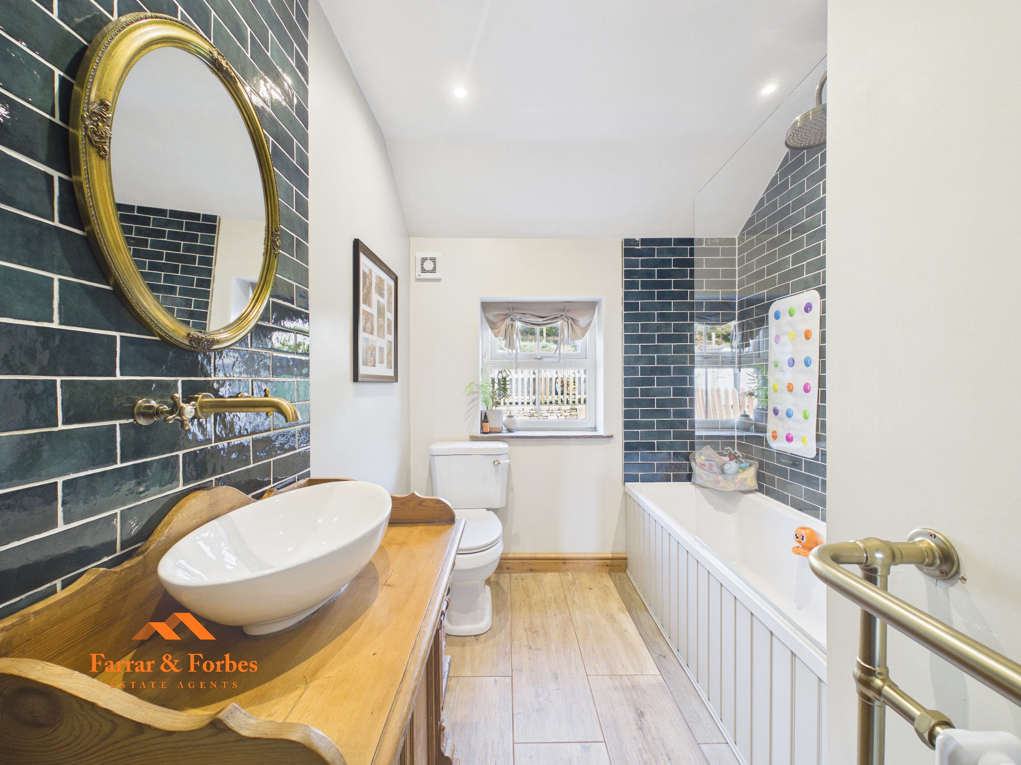 The stylish family bathroom is located to the rear and is beautifully appointed with wood flooring, a vanity unit with brass mixer tap, striking green tiled splashbacks, and a traditional Victorian-style radiator with towel rail. The suite also includes a low-level WC and a panelled bath with brass fixtures and an overhead shower.