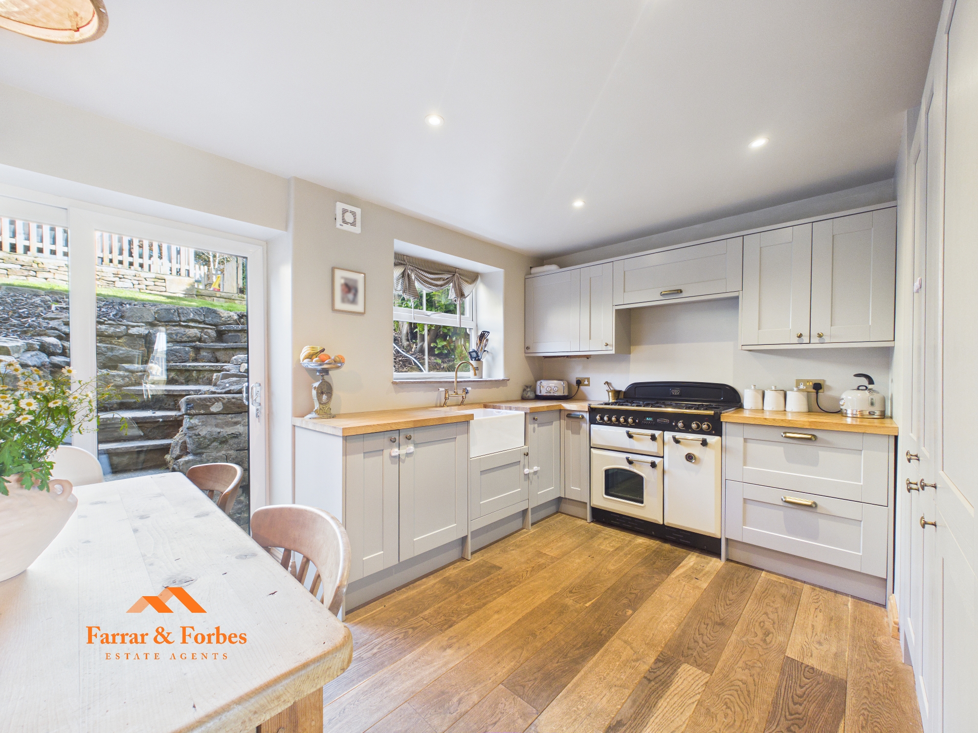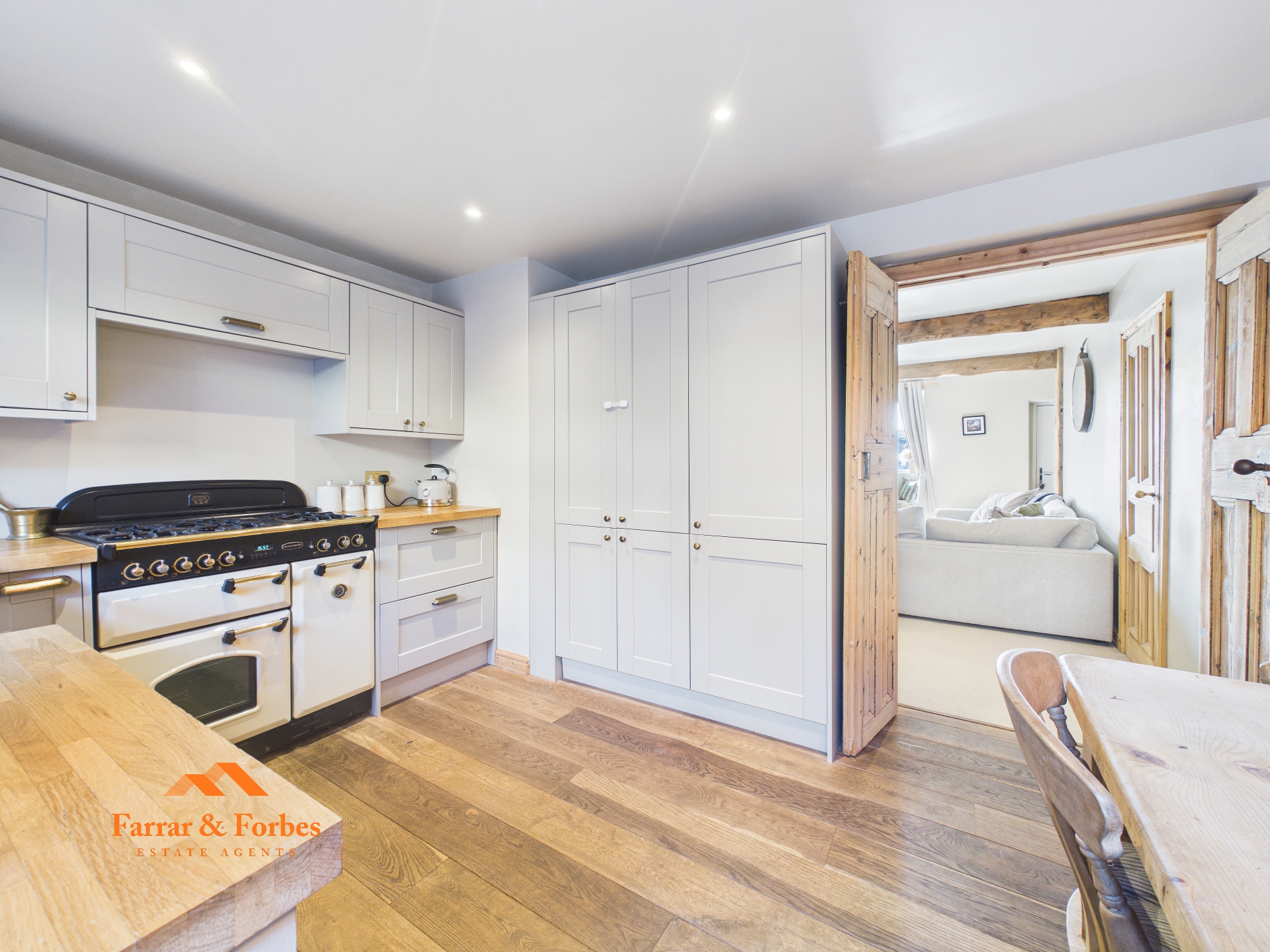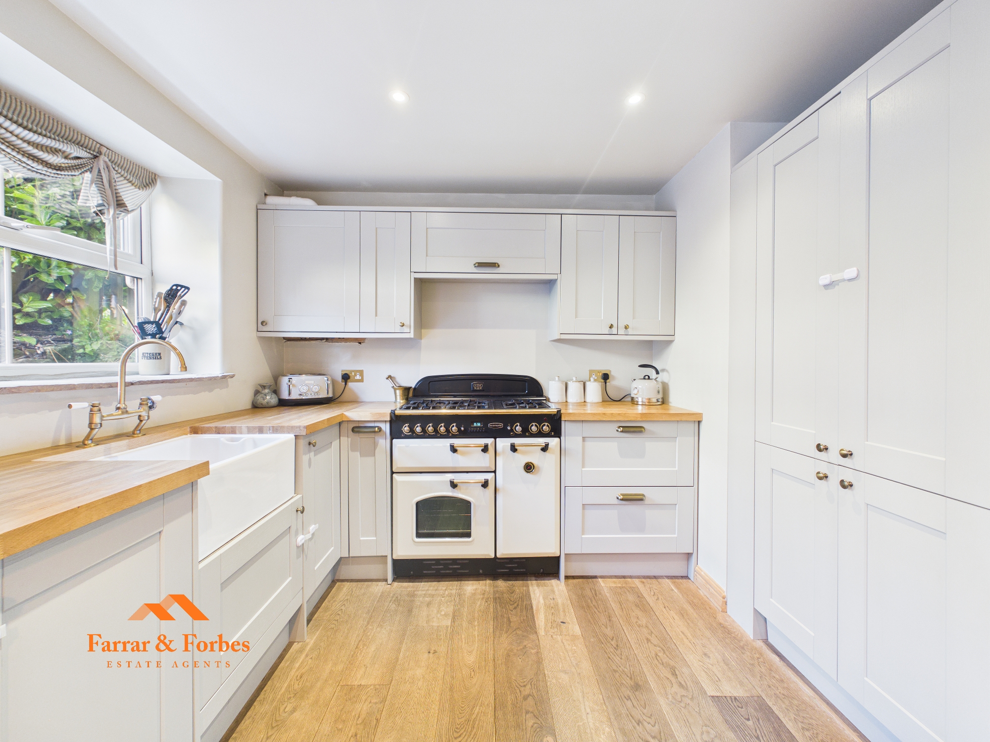 Double doors lead through to a stunning kitchen diner, arranged in a practical U-shape. The kitchen is fitted with cottage-style units in a soft grey finish, complemented by oak worktops, a Belfast sink, and a Rangemaster cooker as the focal point. Integrated appliances include a fridge, freezer, and washing machine. The ground floor further benefits from wet underfloor heating throughout.