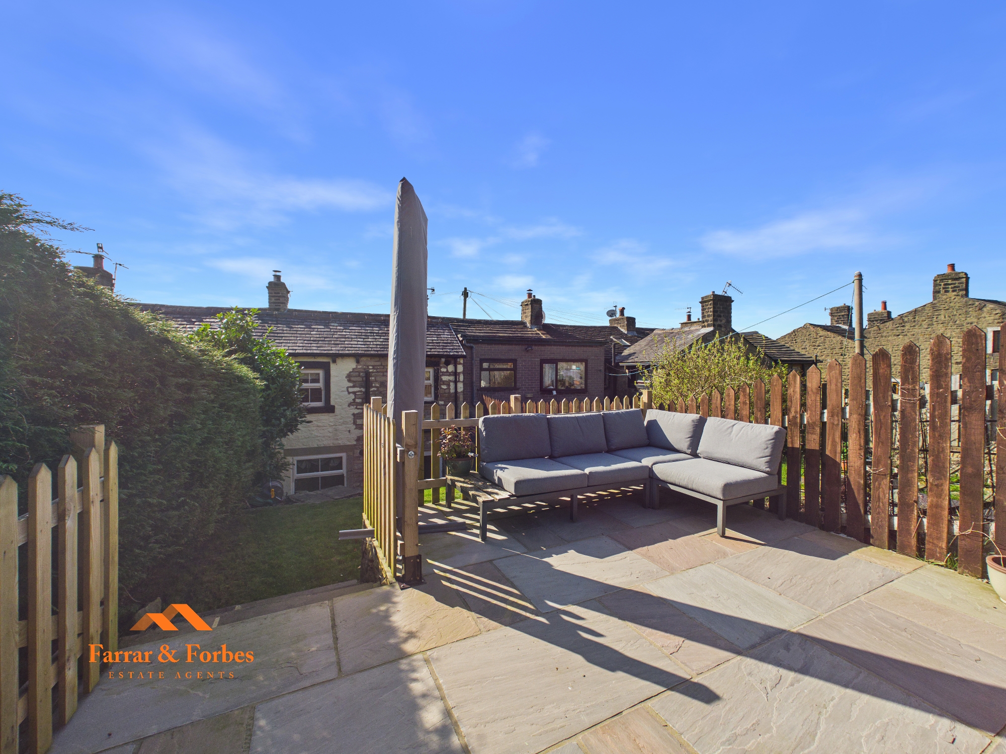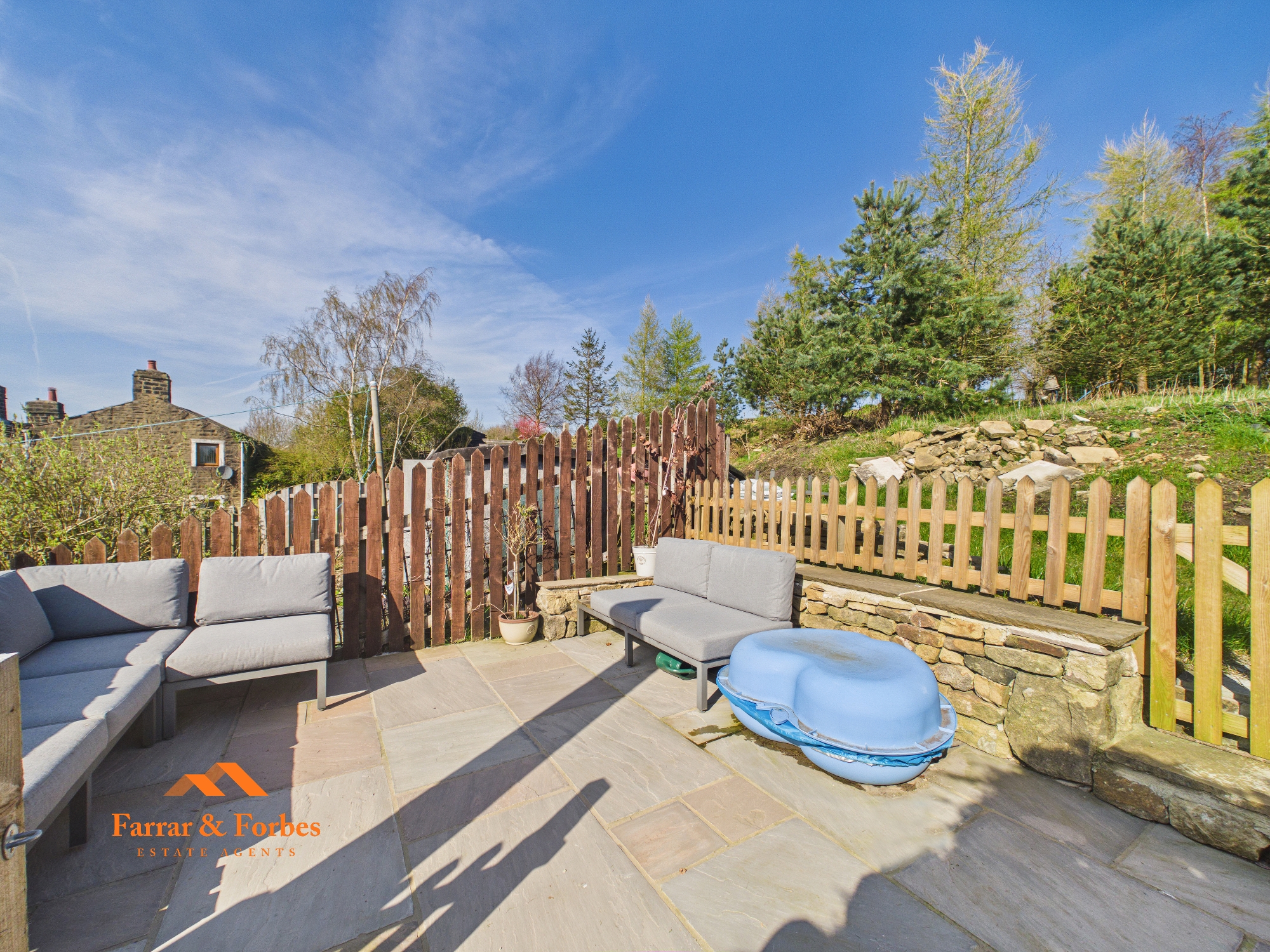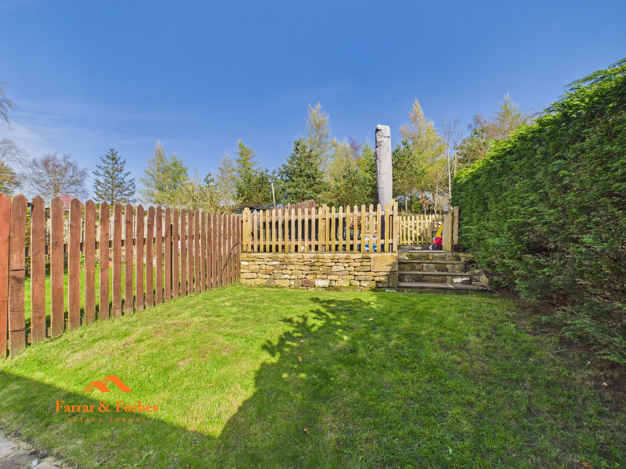 Patio doors open onto an elevated rear garden, featuring a combination of lawned areas and an Indian stone flagged seating space, backing onto woodland and enjoying sunlight throughout the day.