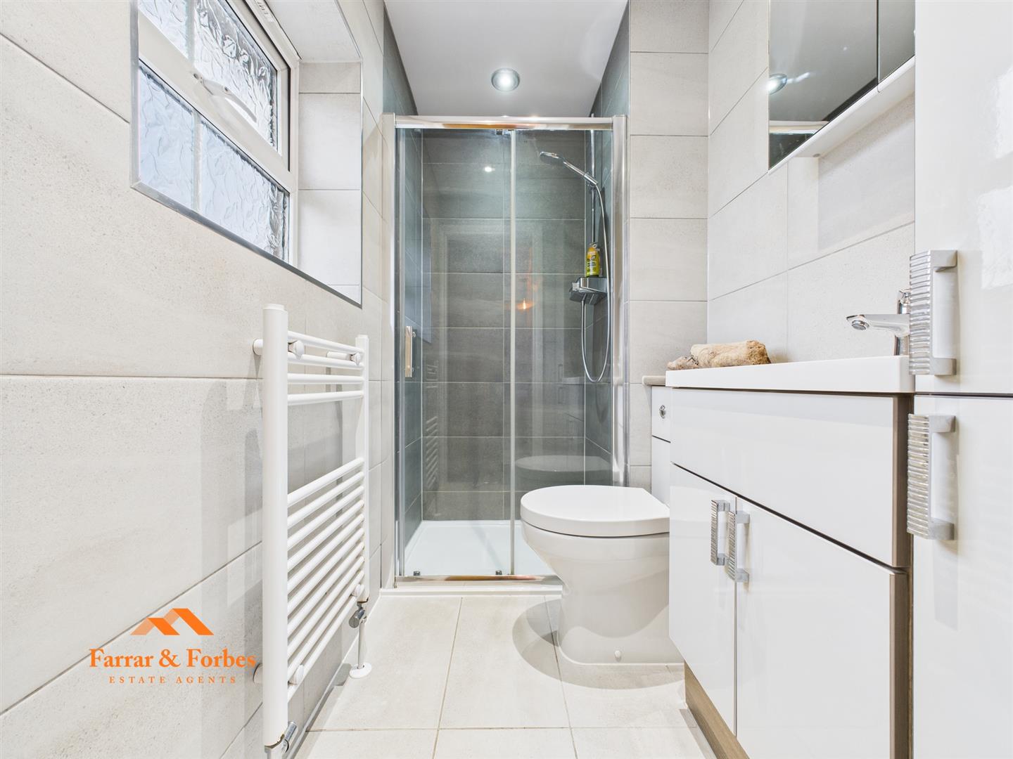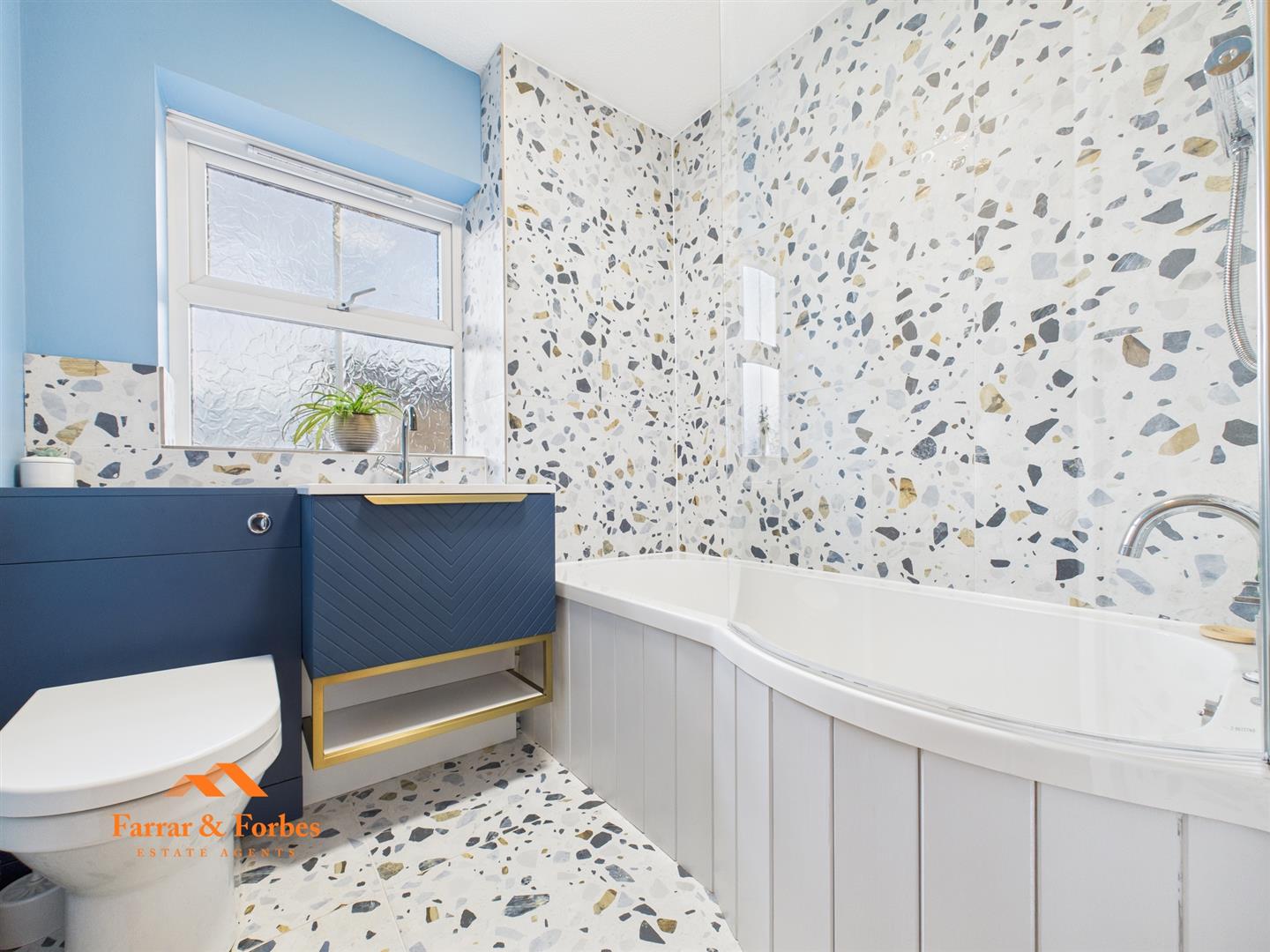 Upstairs, there are three generous bedrooms. The main bedroom benefits from fitted wardrobes and a stylish, modern en-suite with a low-level WC, cabinet hand wash basin, and a walk-in shower. The family bathroom continues the elegant theme with bold blue tones and gold fittings, featuring a floating vanity unit, panelled bath with overhead shower, and glass shower screen.