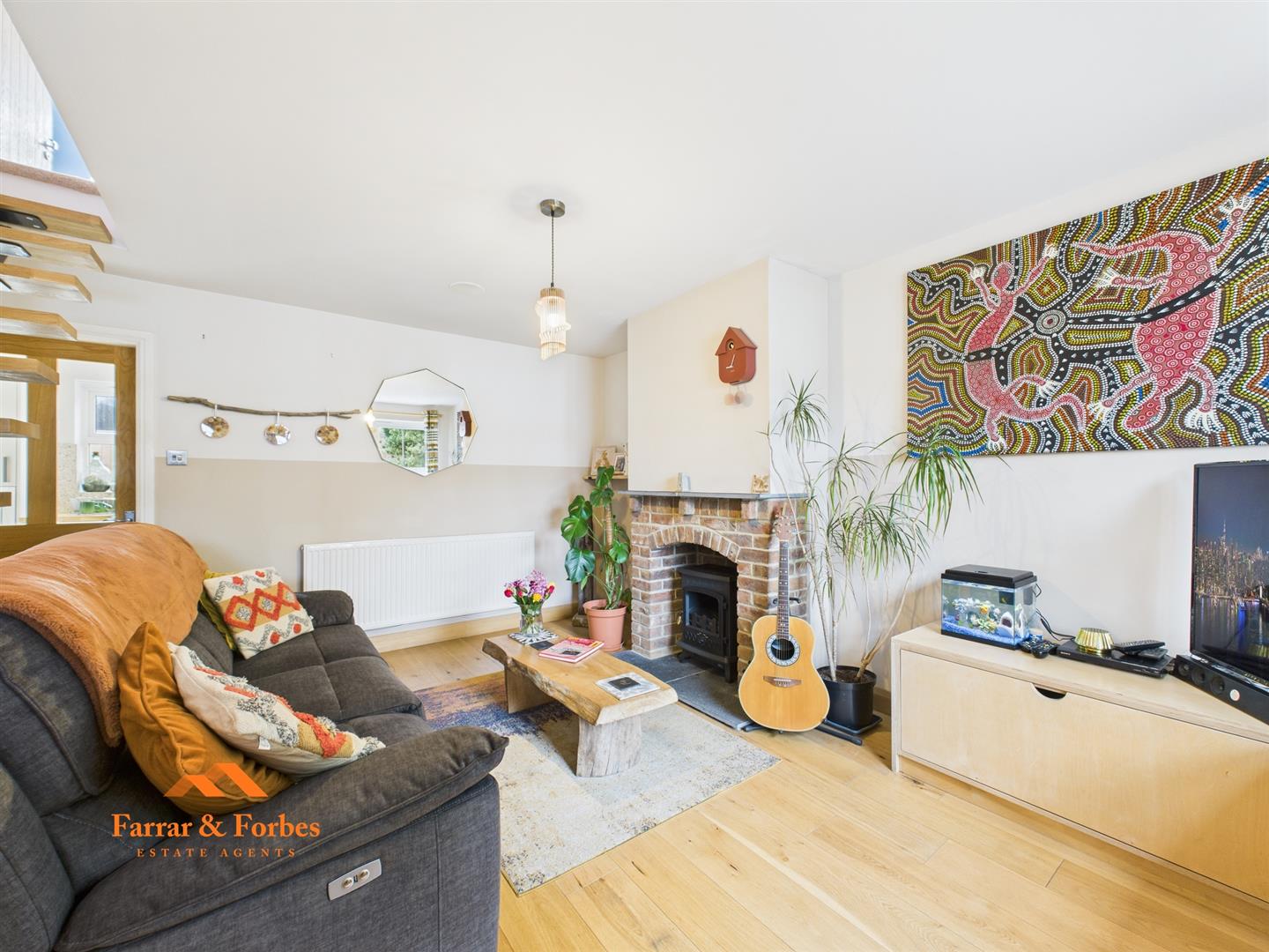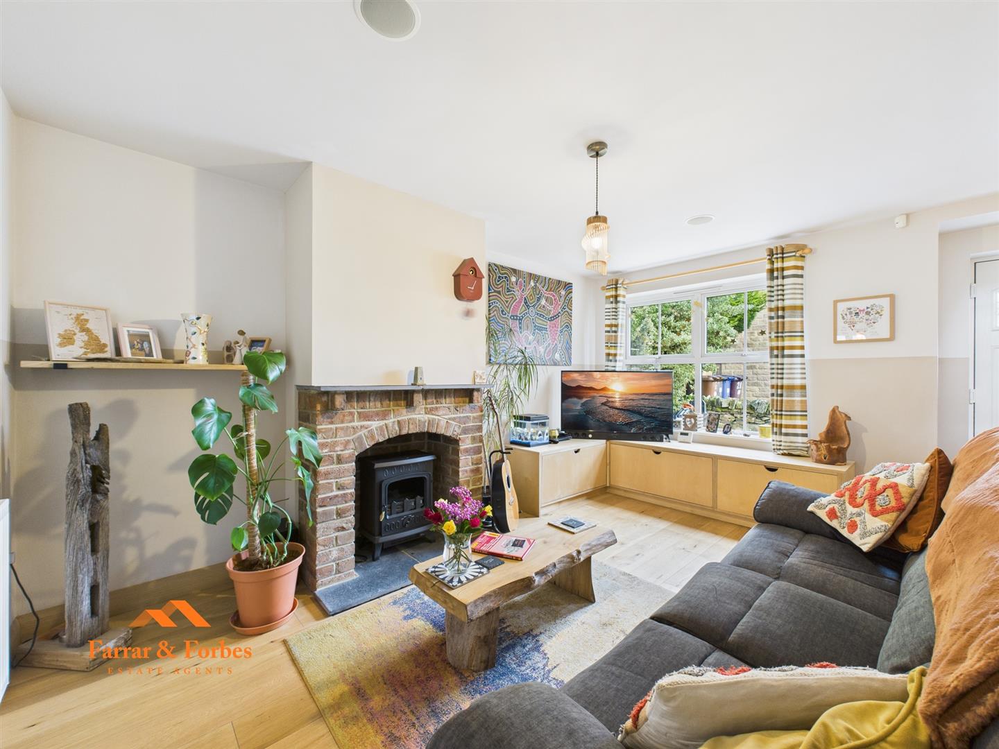 To the rear, the contemporary kitchen diner is beautifully designed with two-tone wall, base, and drawer units, complemented by solid wood work surfaces and bespoke drawers. Integrated appliances ensure practicality, while the distinctive tiling adds a vibrant touch of character. A built-in bench provides an inviting dining area, perfect for family meals.