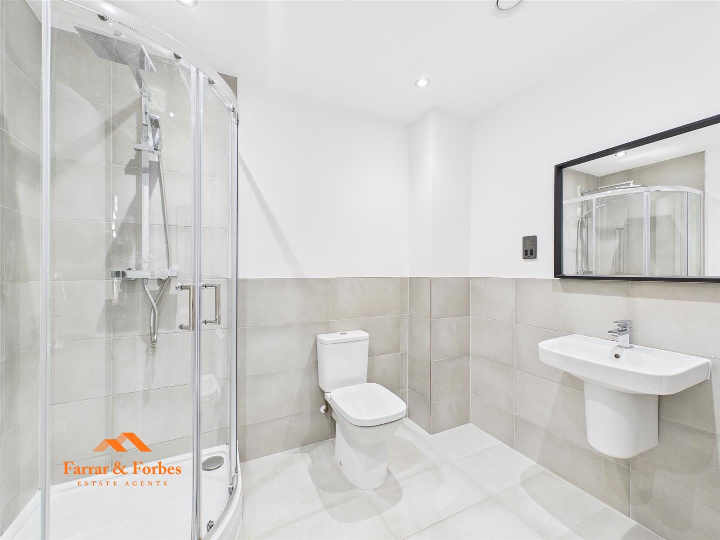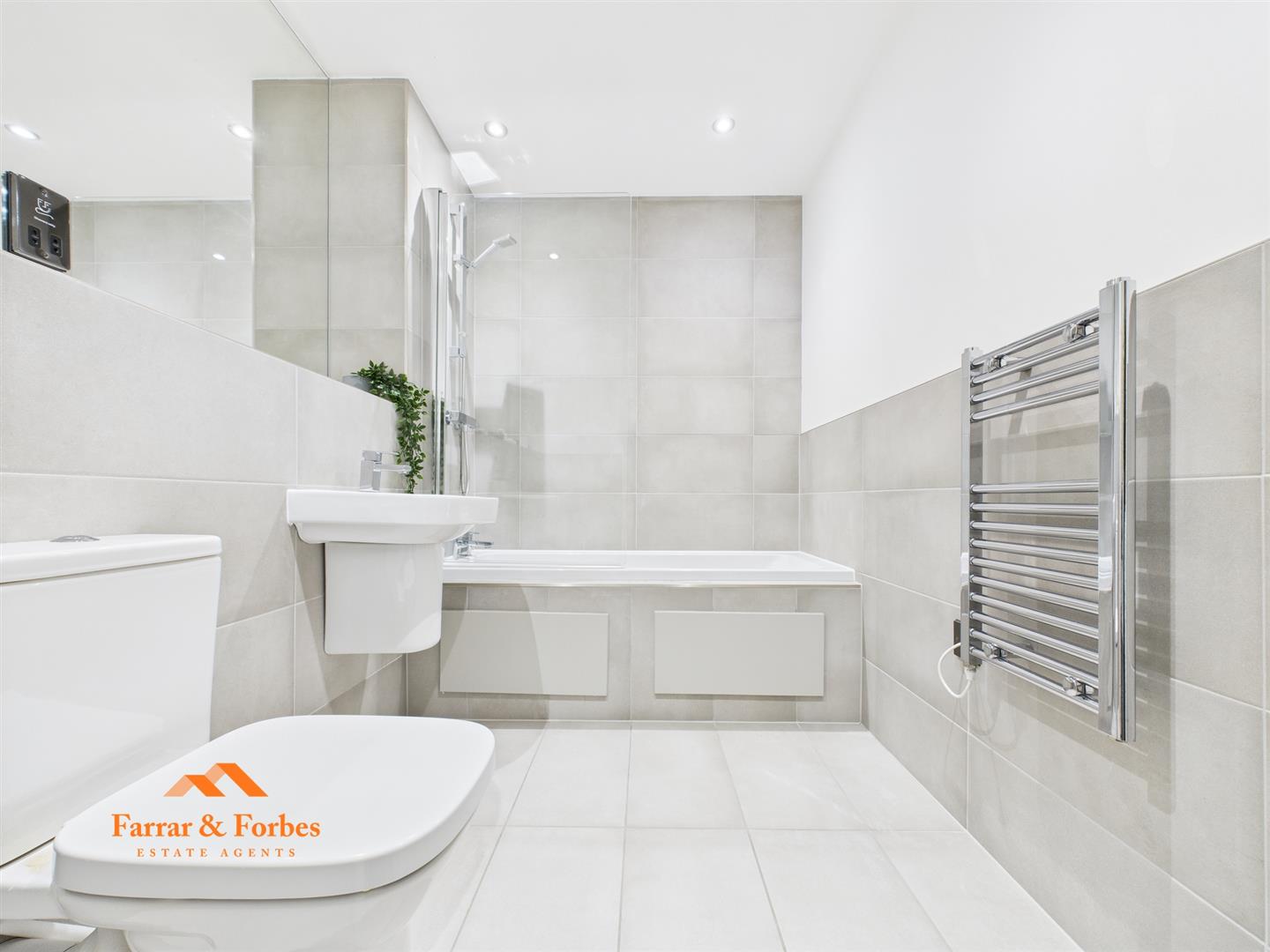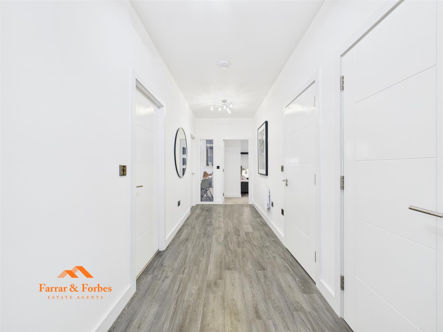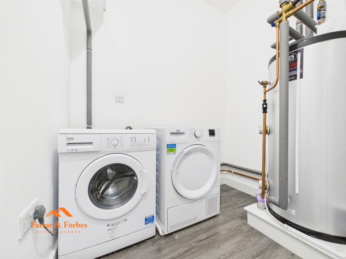The accommodation briefly comprises a grand entrance hallway with storage and a utility room, a modern bathroom with sleek grey finishes, and two well-proportioned bedrooms — the main benefiting from an en-suite shower room.