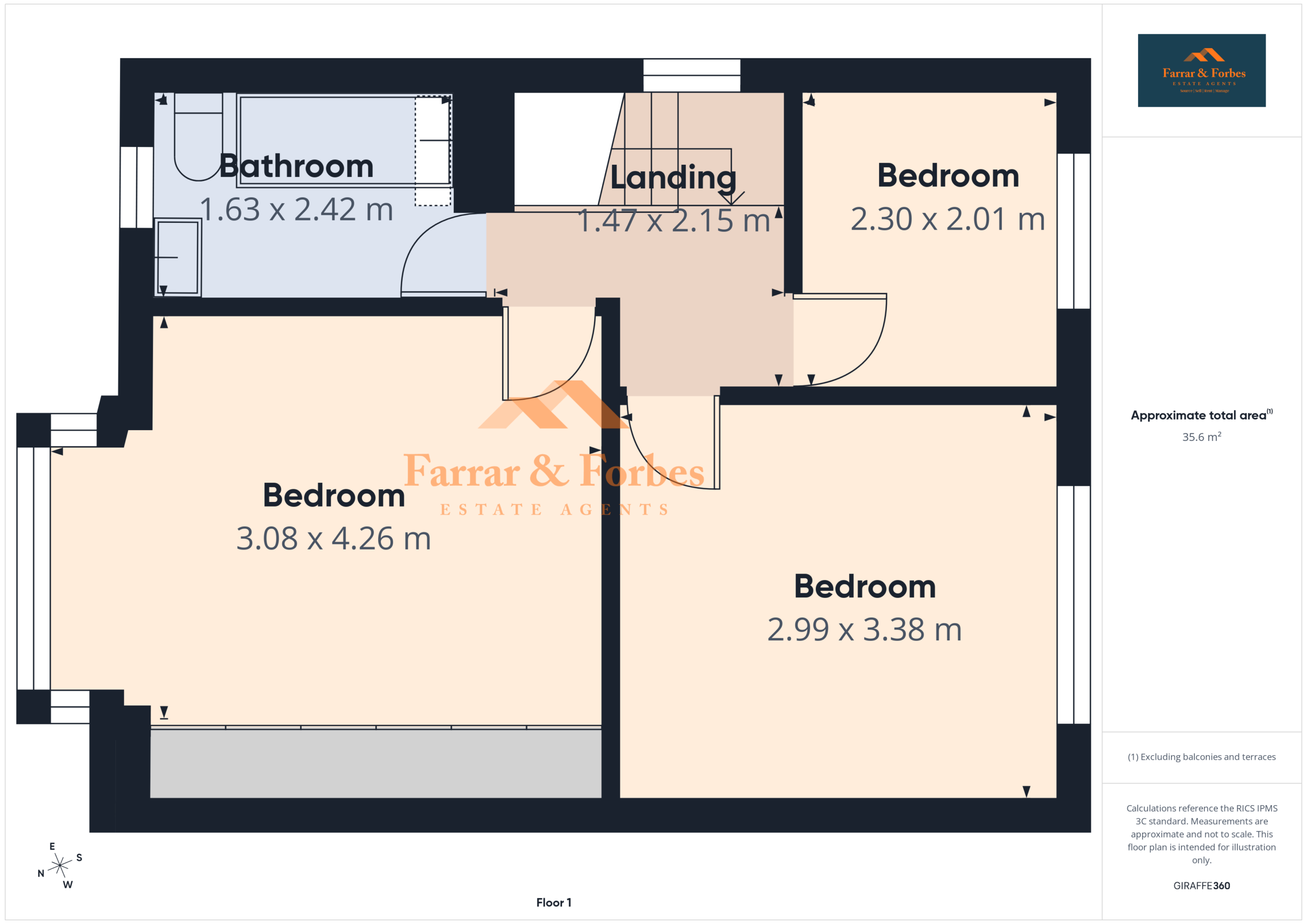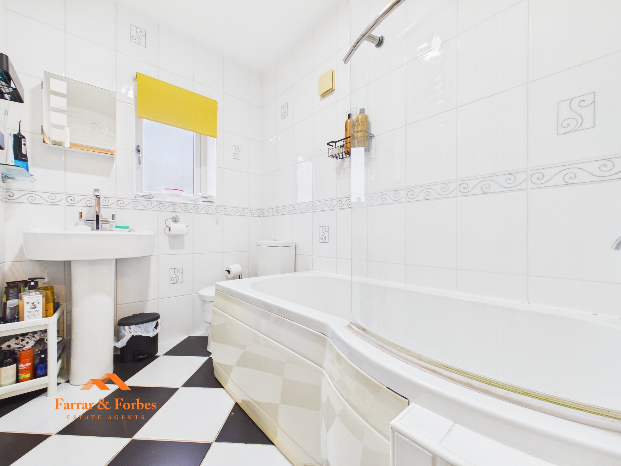 Upstairs, the property provides two double bedrooms, including a main bedroom with fitted wardrobes and bay window, a generously sized single bedroom, and a family bathroom with a three-piece suite and shower over the bath.