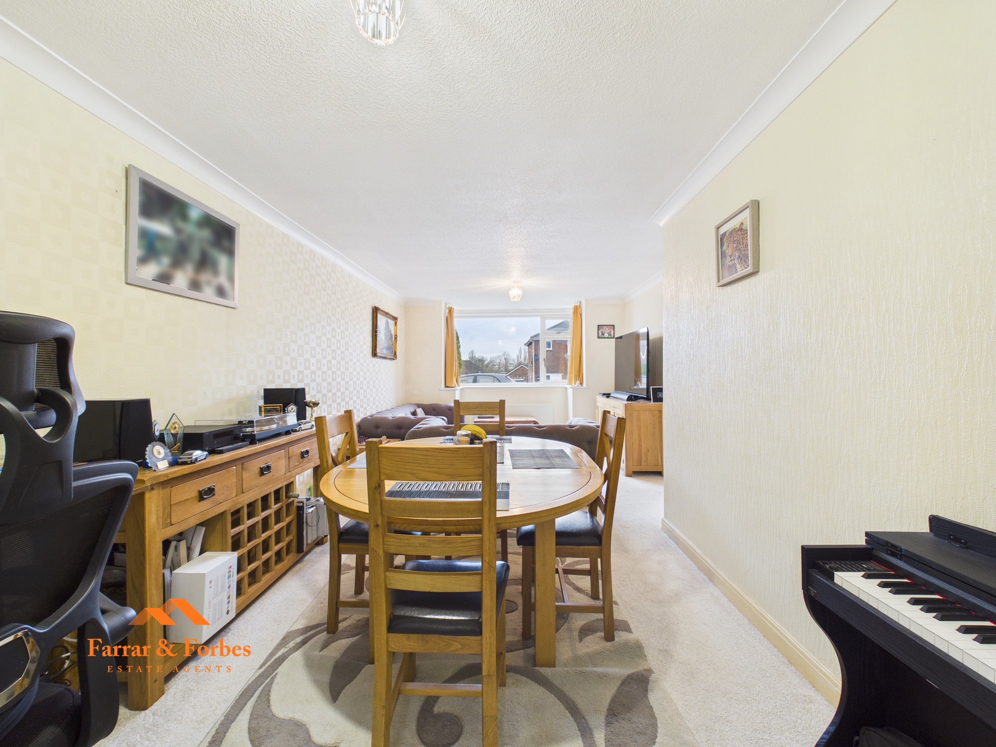 The property is approached via a flagged driveway leading to a single garage with internal access, and upon entering there is a welcoming vestibule with a convenient downstairs WC. The lounge and dining room have been opened to create a spacious, light-filled living area featuring a bay window overlooking farmland, while still offering flexibility to reinstate two separate reception rooms if desired.