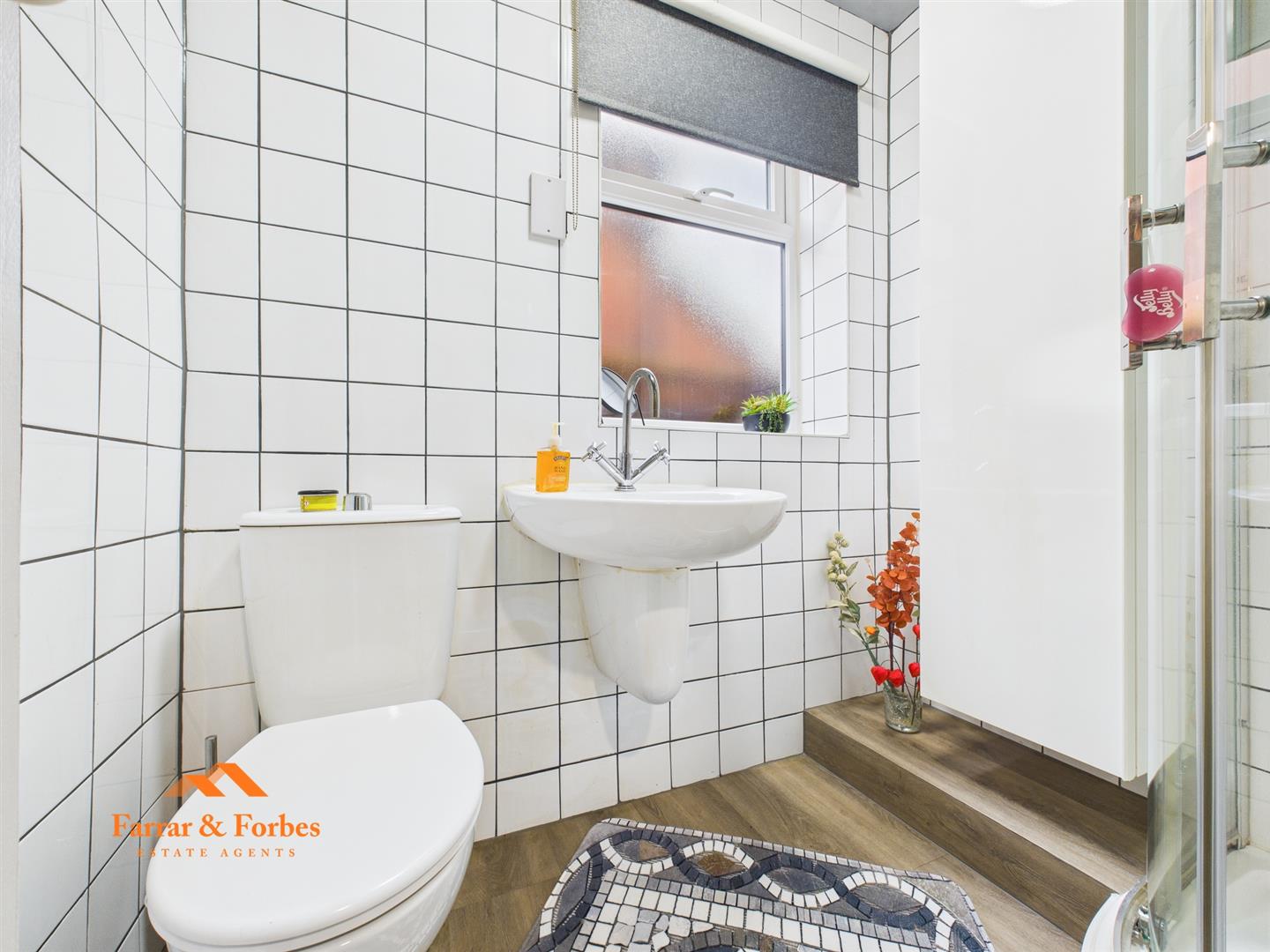 The bathroom comprises a three-piece suite including a low-level WC, pedestal wash basin, and quadrant shower. The main bedroom, also located to the front, is a generous double with fitted wardrobes.